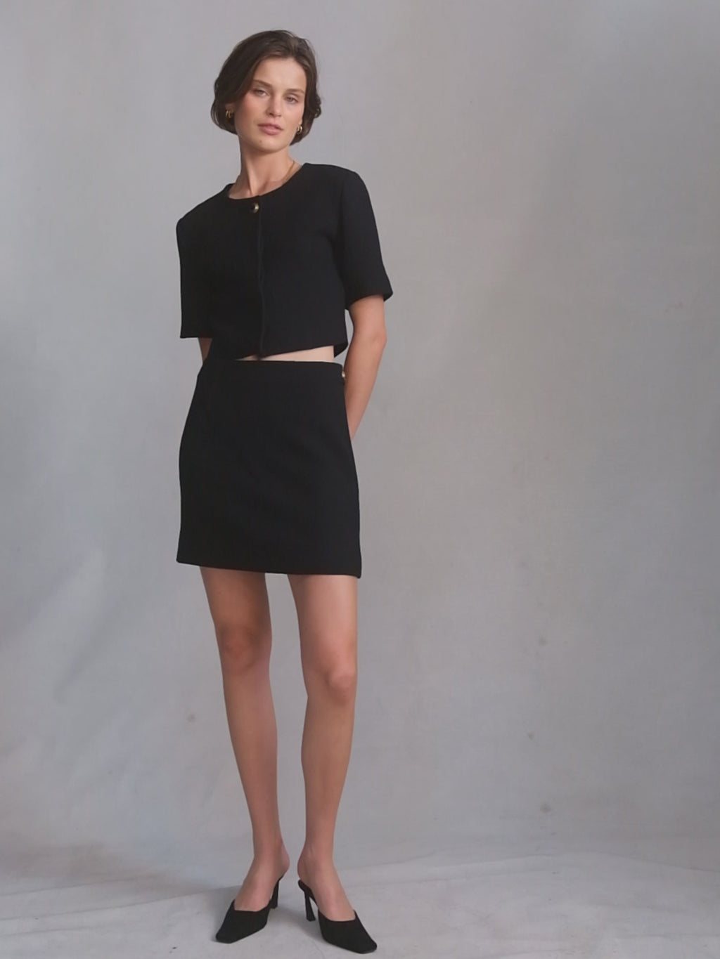 The Gabrielle Jacket offers a refined take on evening tailoring, cut to a cropped silhouette that frames the waist with quiet structure. A polished piece that brings modern proportion and ease to occasion dressing.