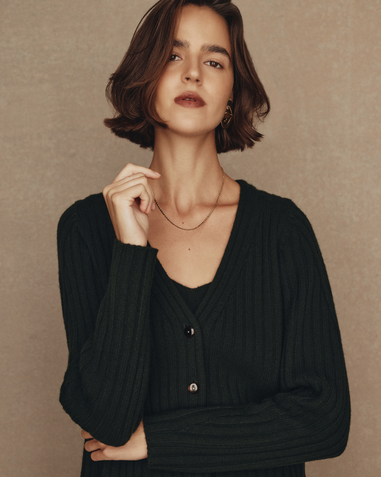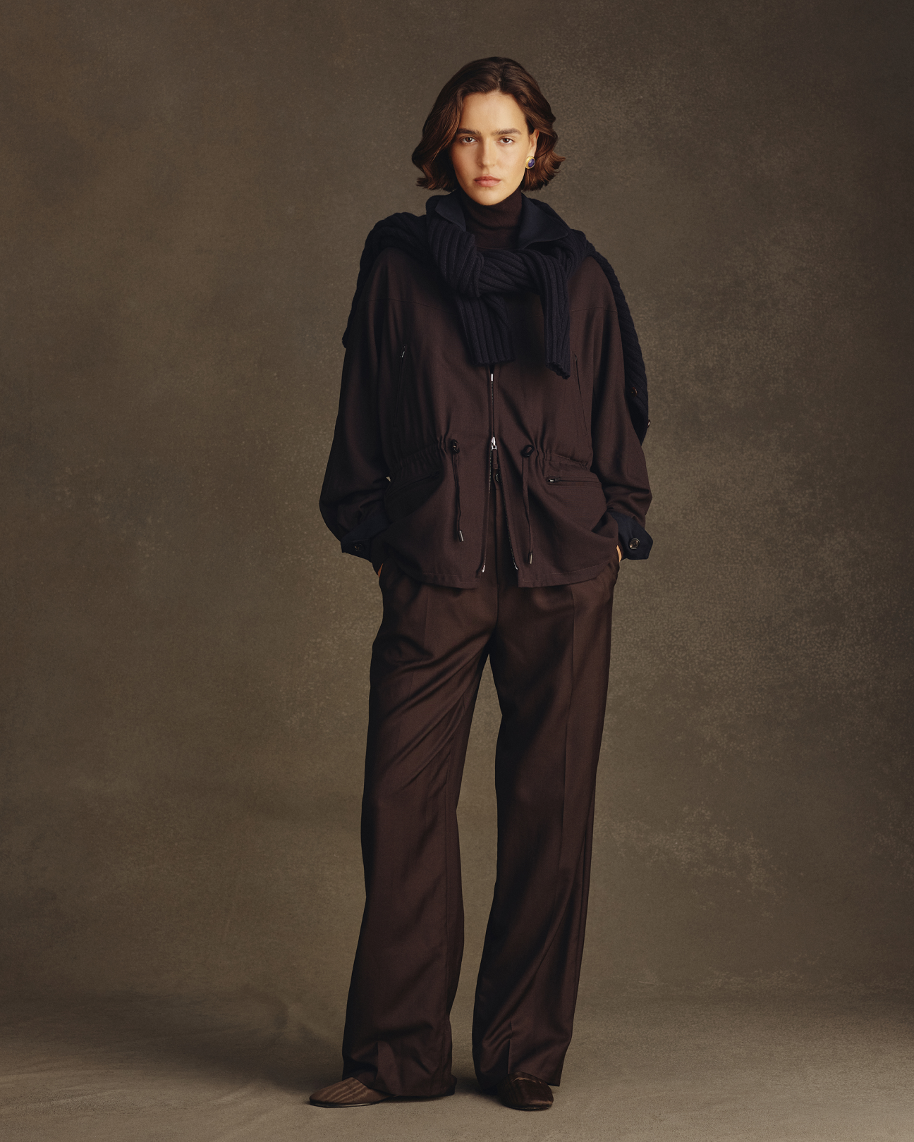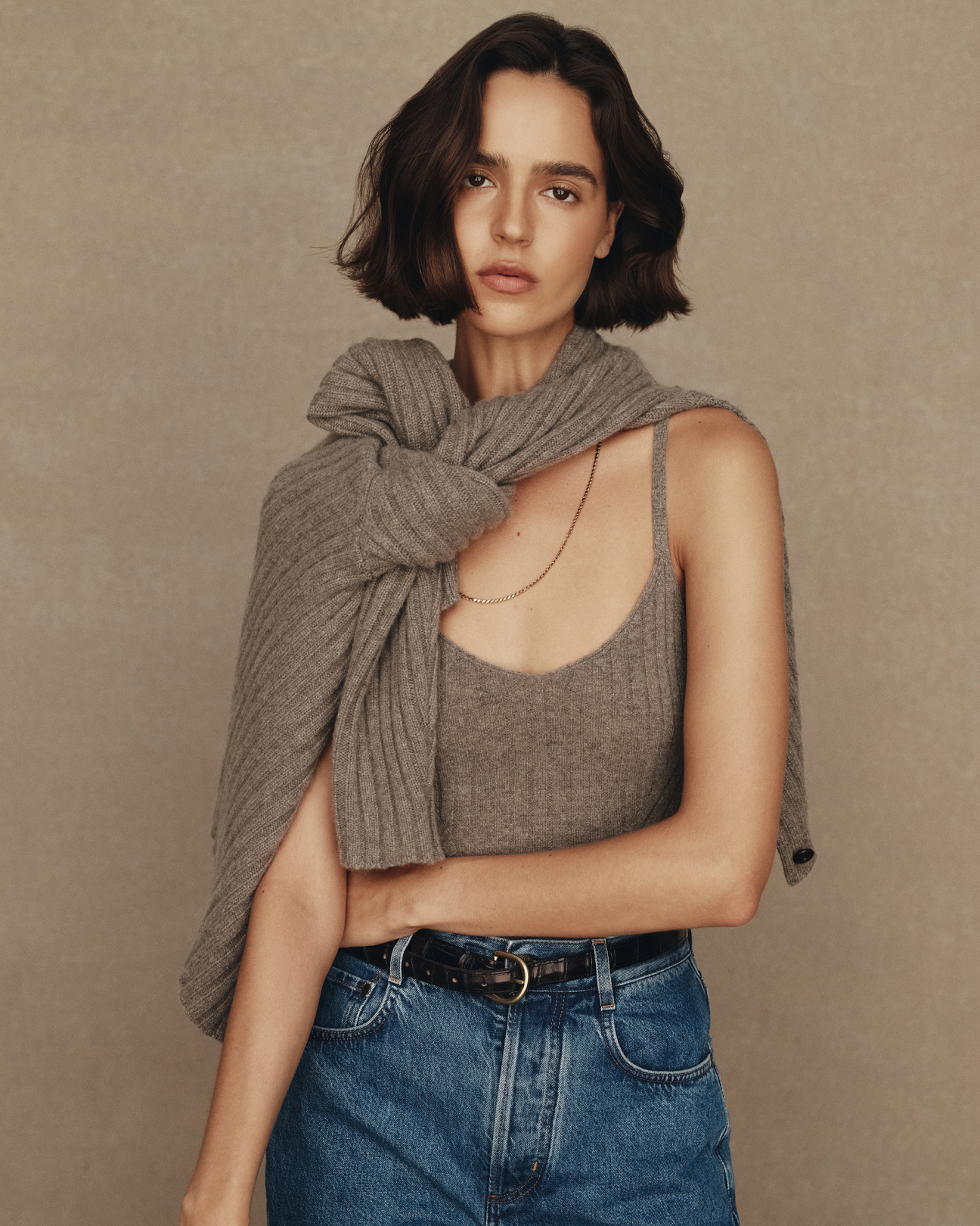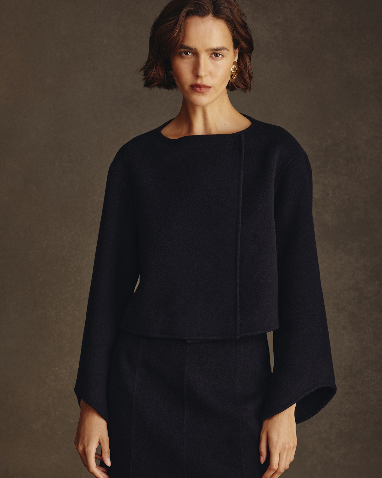 The knitwear drives the collection - the pure cashmere Eloise cardigan has cabled rails that twist and overlap sparingly adding intrigue, the sleeve is just slightly belled to well up near the hand. The Eloise tank, also in pure cashmere, features the same patterning with beautiful, subtle shaping and fine knitted straps. The colours are an aged, muted, animalistic brindly brown, a deep and sober forest green and a layered, inky navy. Also in cashmere is Ange, a sweater with a louche long shoulder drop, a high neck, wide sleeve and detailed with a beautiful raised seam expression at the shoulder and hand. Ange comes in Navy and Oat.