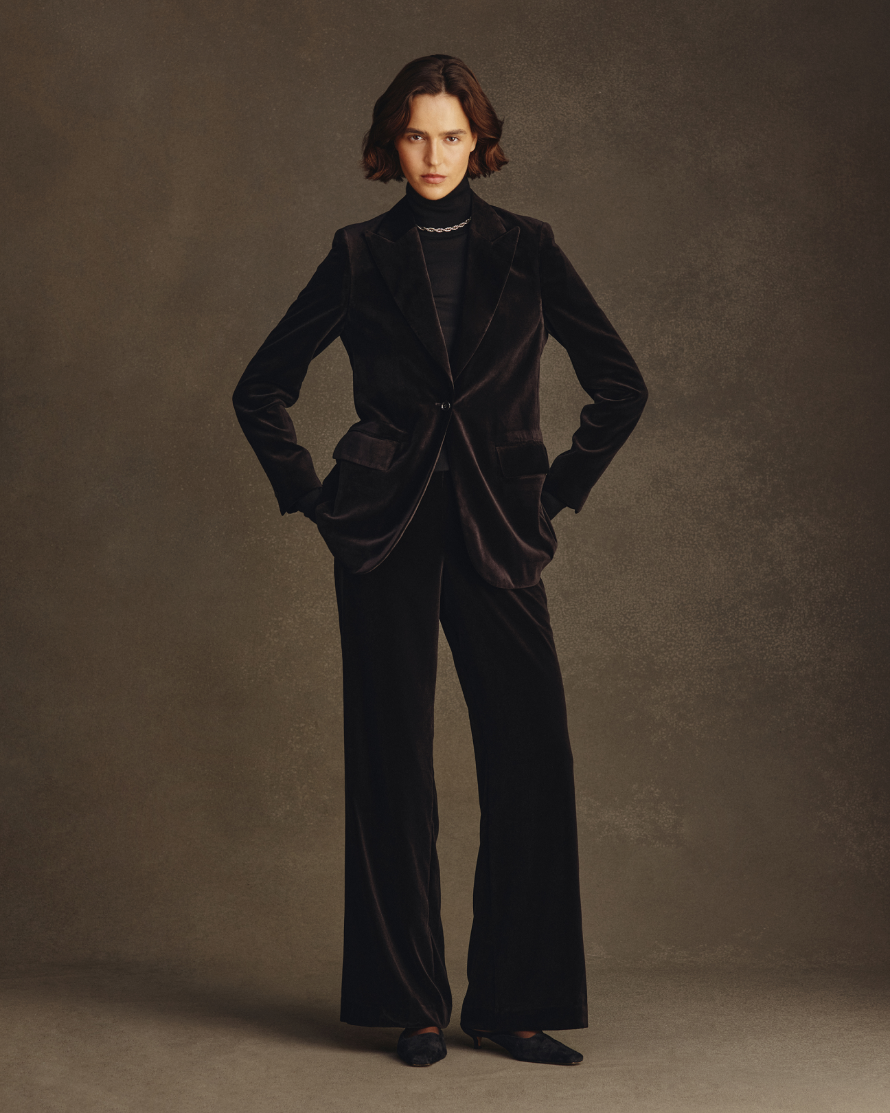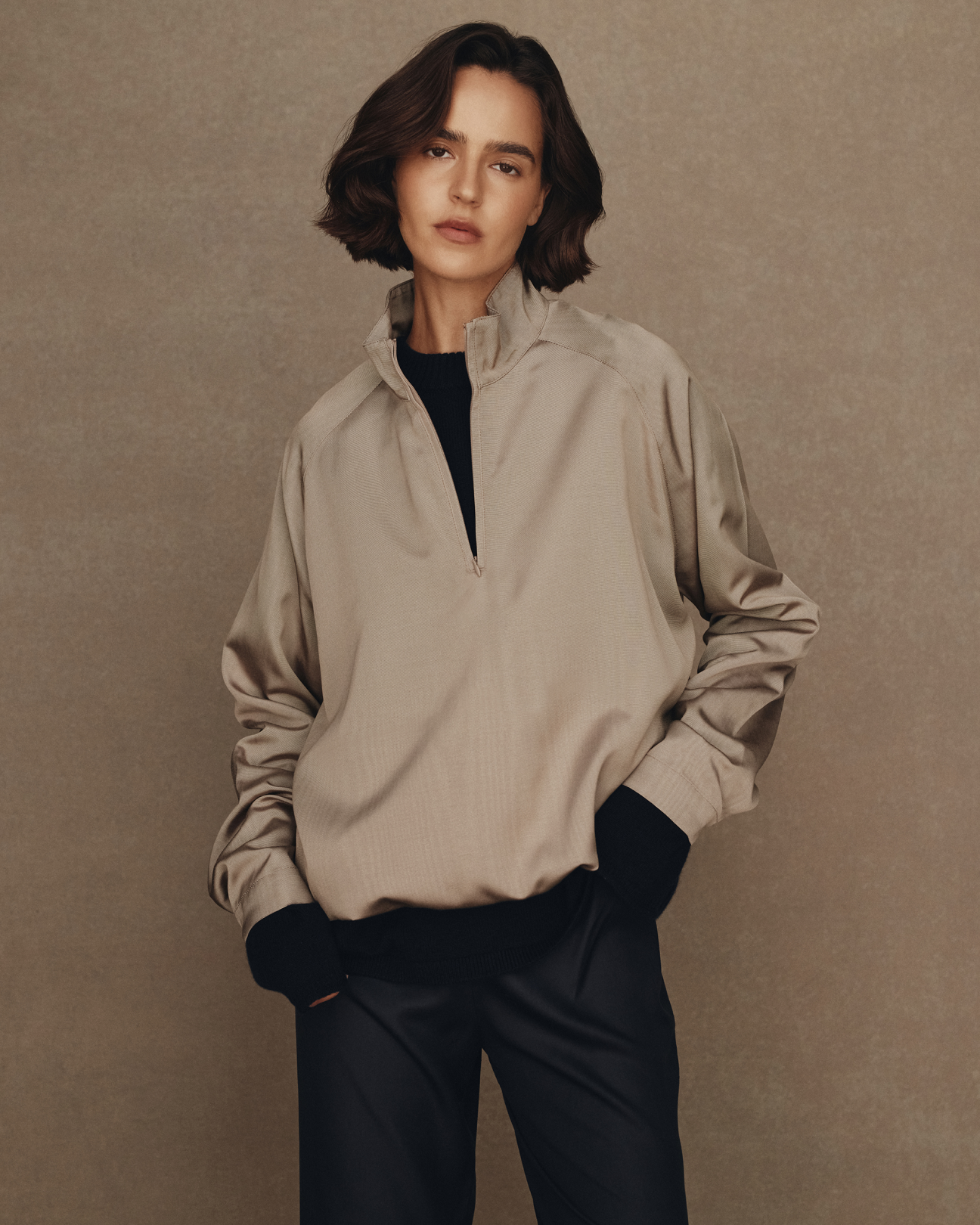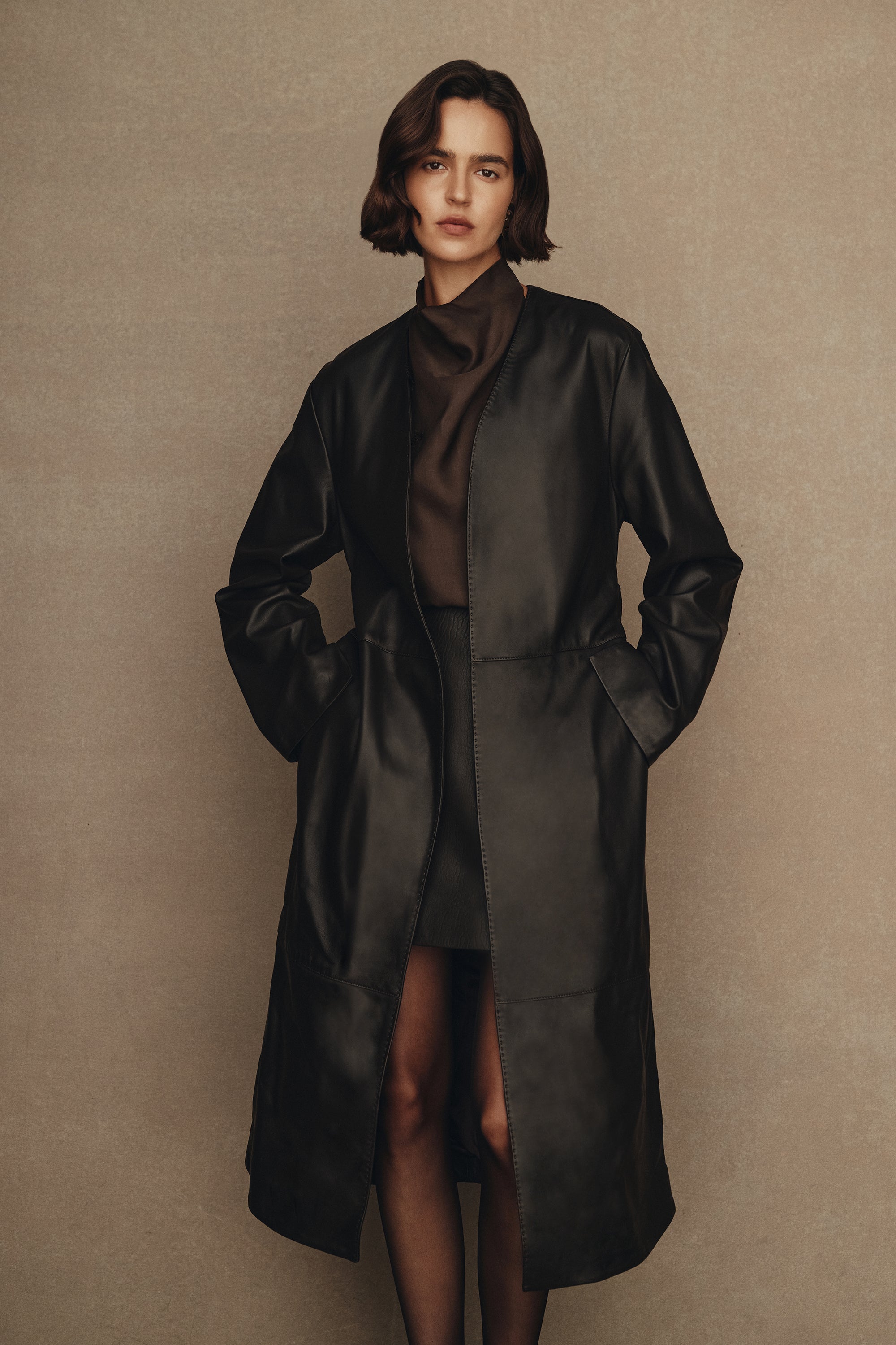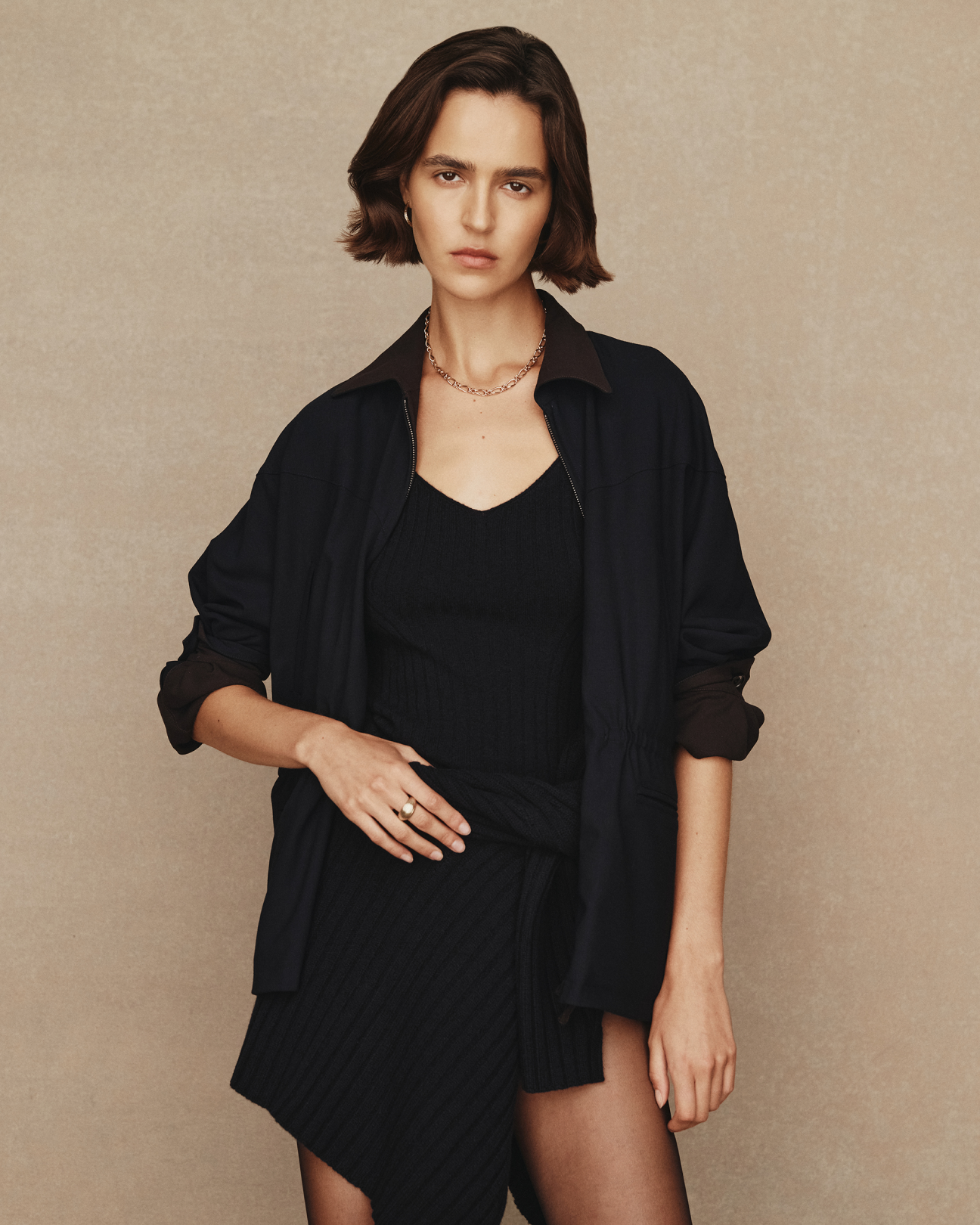 The knitwear drives the collection - the pure cashmere Eloise cardigan has cabled rails that twist and overlap sparingly adding intrigue, the sleeve is just slightly belled to well up near the hand. The Eloise tank, also in pure cashmere, features the same patterning with beautiful, subtle shaping and fine knitted straps. The colours are an aged, muted, animalistic brindly brown, a deep and sober forest green and a layered, inky navy. Also in cashmere is Ange, a sweater with a louche long shoulder drop, a high neck, wide sleeve and detailed with a beautiful raised seam expression at the shoulder and hand. Ange comes in Navy and Oat.