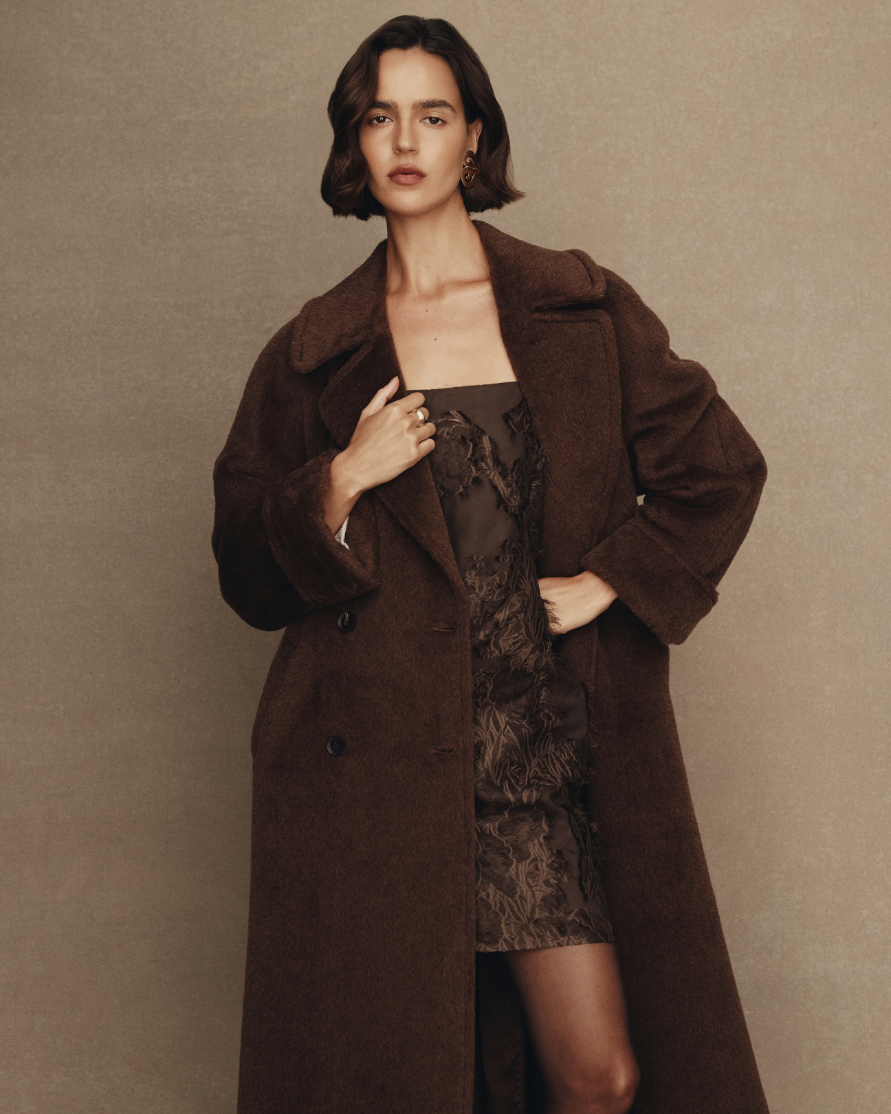 Also in the dressy zone we have the Roberta halter top (which will sit perfectly with the skirts), and the Roberta mini dress. The woody brown silk was made in Italy by one of our favourite weaving partners with custom placed tufted paisley jacquards. Two exquisitely feminine pieces with fragility and strength at once.