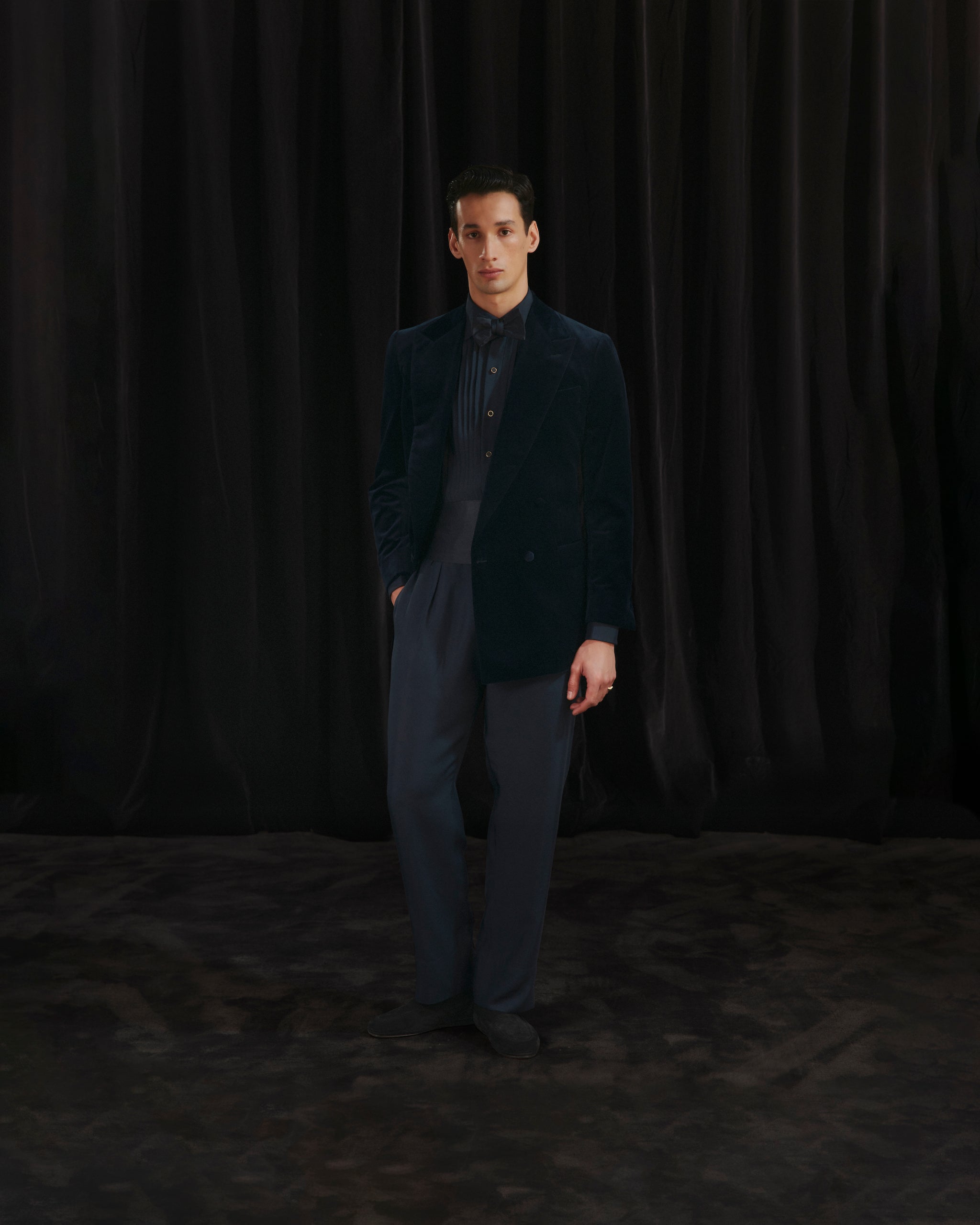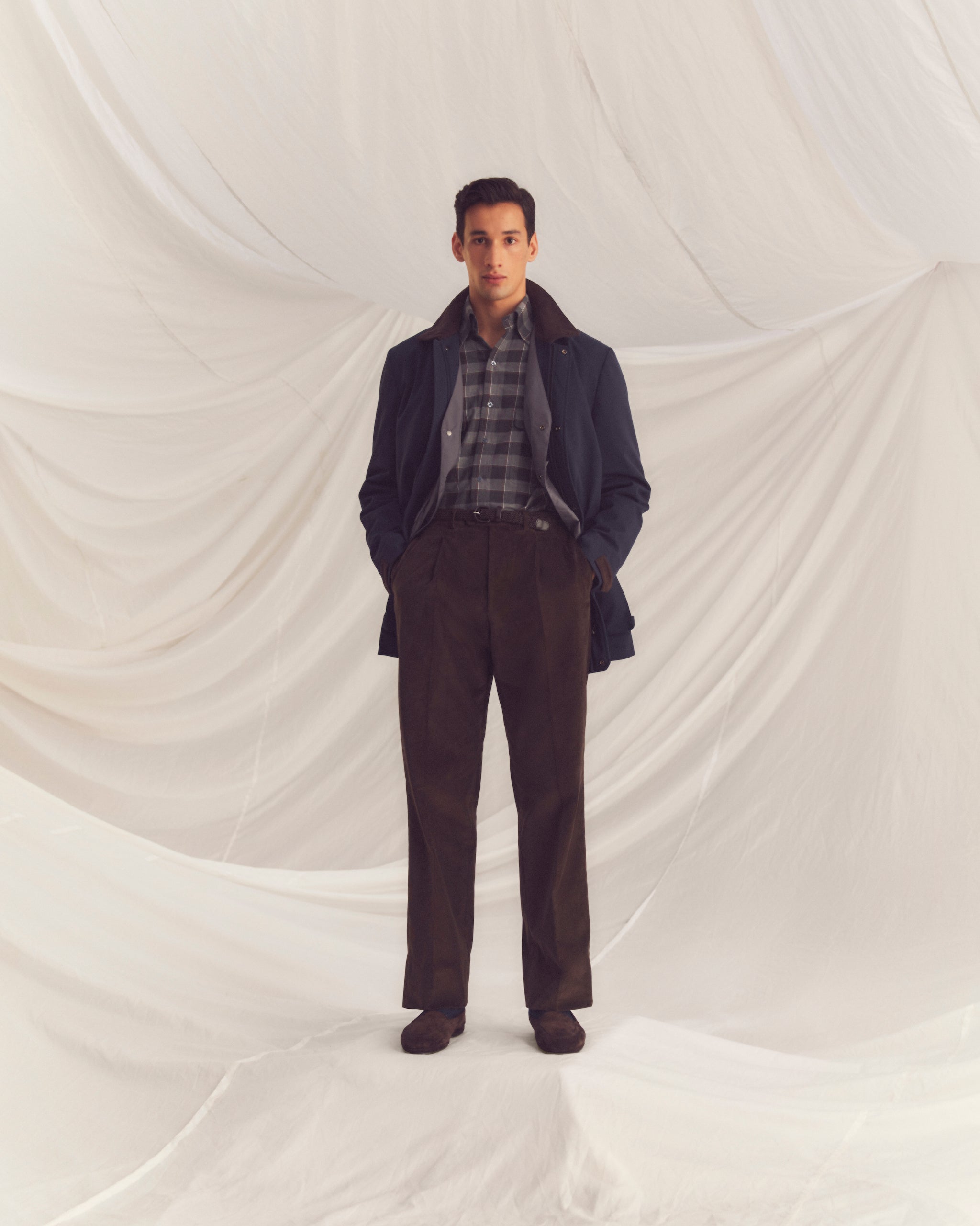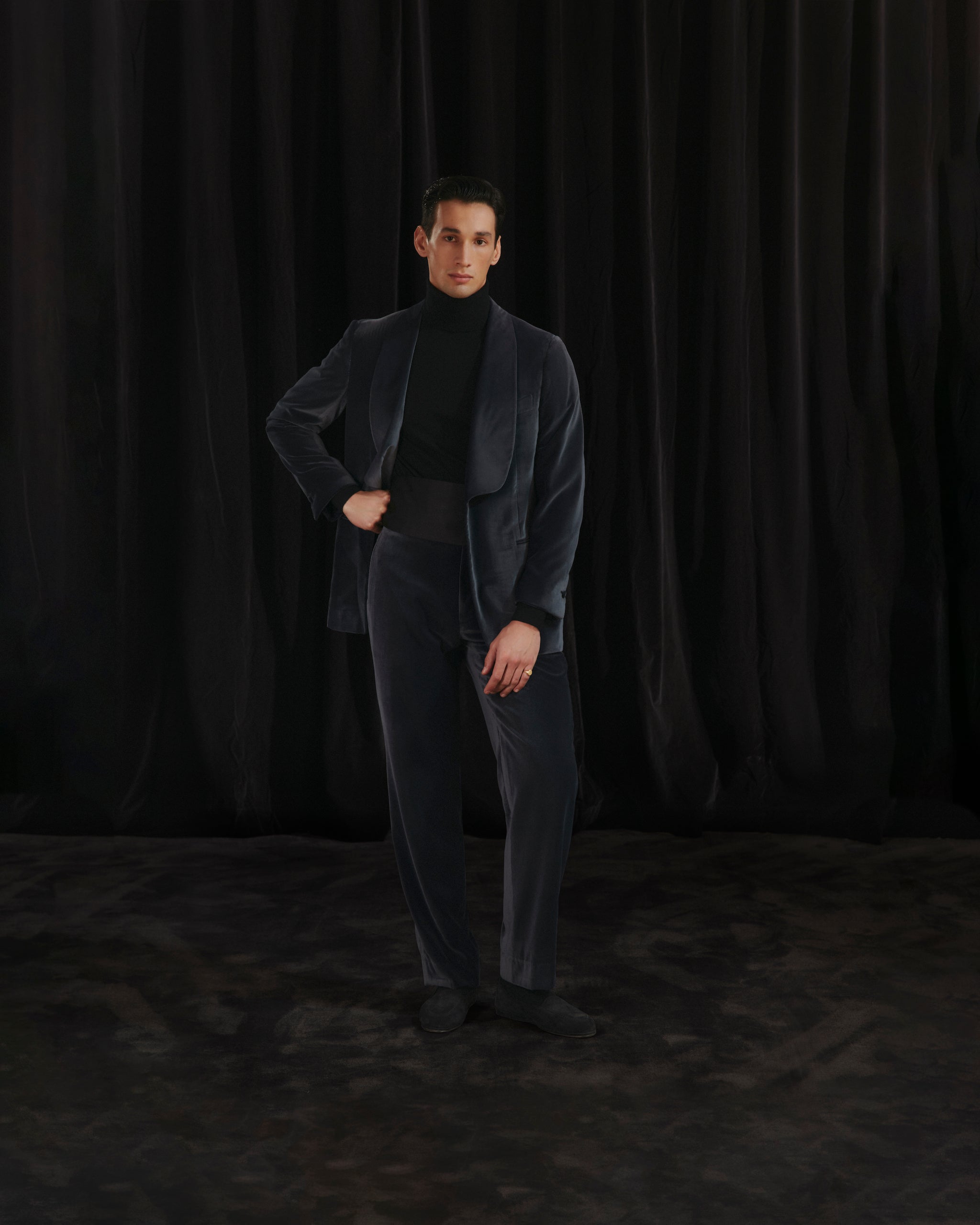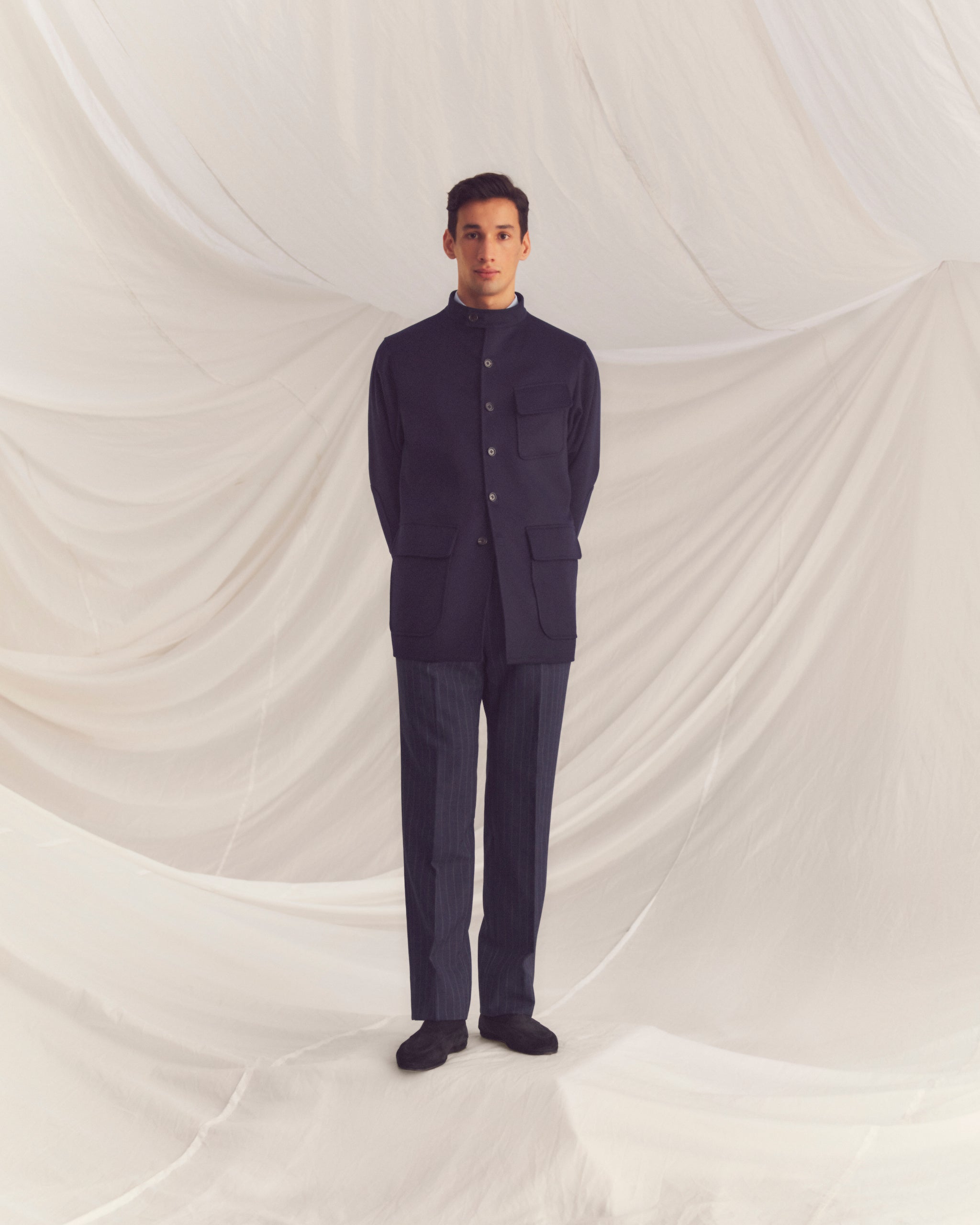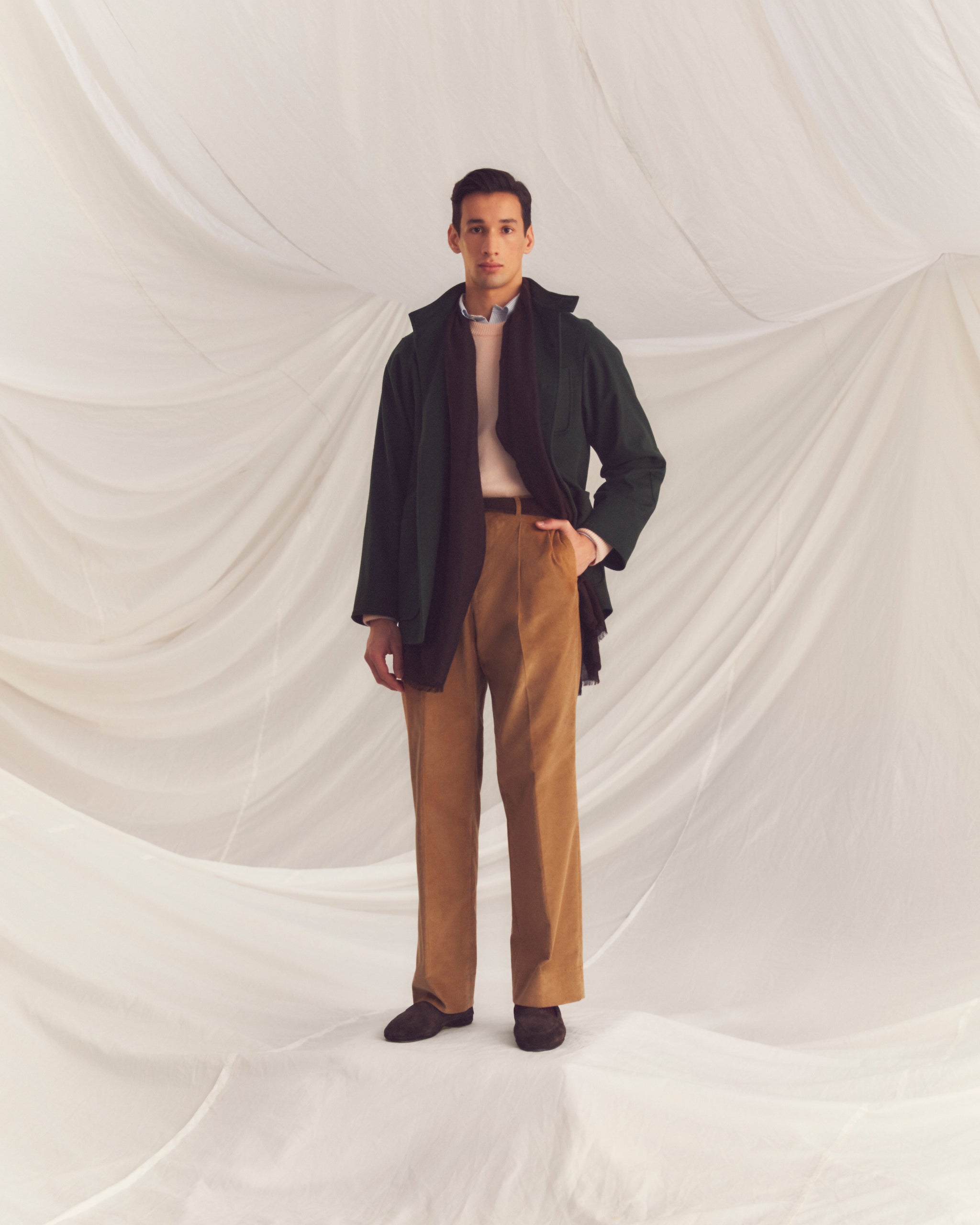 There are a few novel pieces here on the elegant side of casual. A tough looking desert pant in hefty herringbone cotton cloth, and a beautiful smock-y coat called the ‘Corbusier’ which is a soft, detailed and mature alternative to our more technical outerwear pieces. Super fine merino knitwear in crew, roll and polo necks add versatile layering options. Flannels, silk, peach skin cottons, corduroy and worsted gaberdine merinos feature as always in deep and reserved colours. In the evening velvets feature alongside our favourite shantung silks with pronounced shawl collars and pleated bib dress shirts.