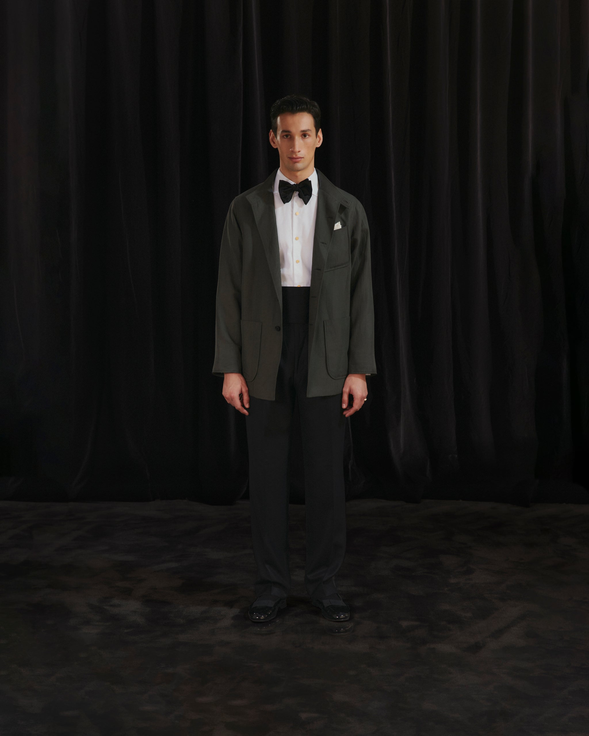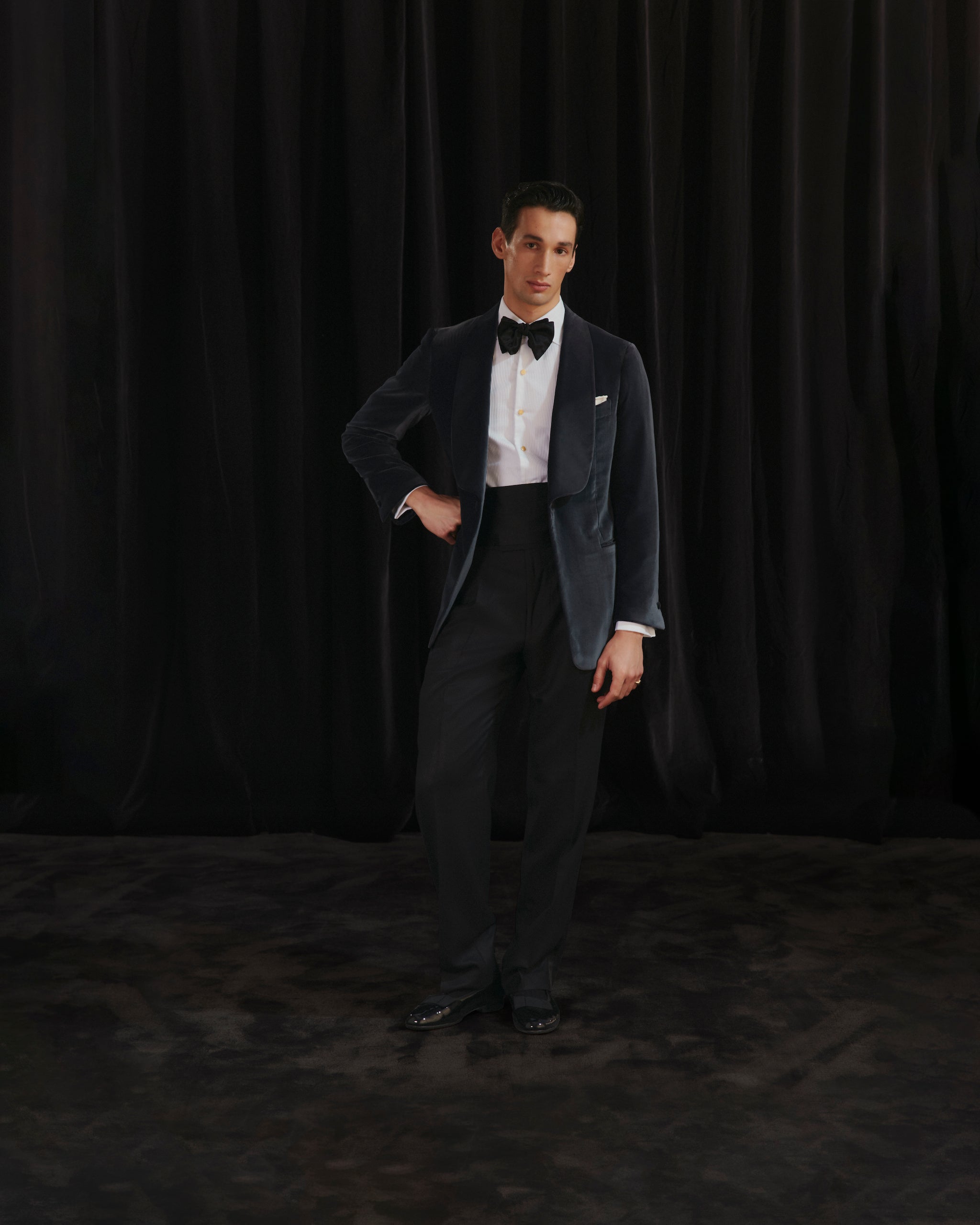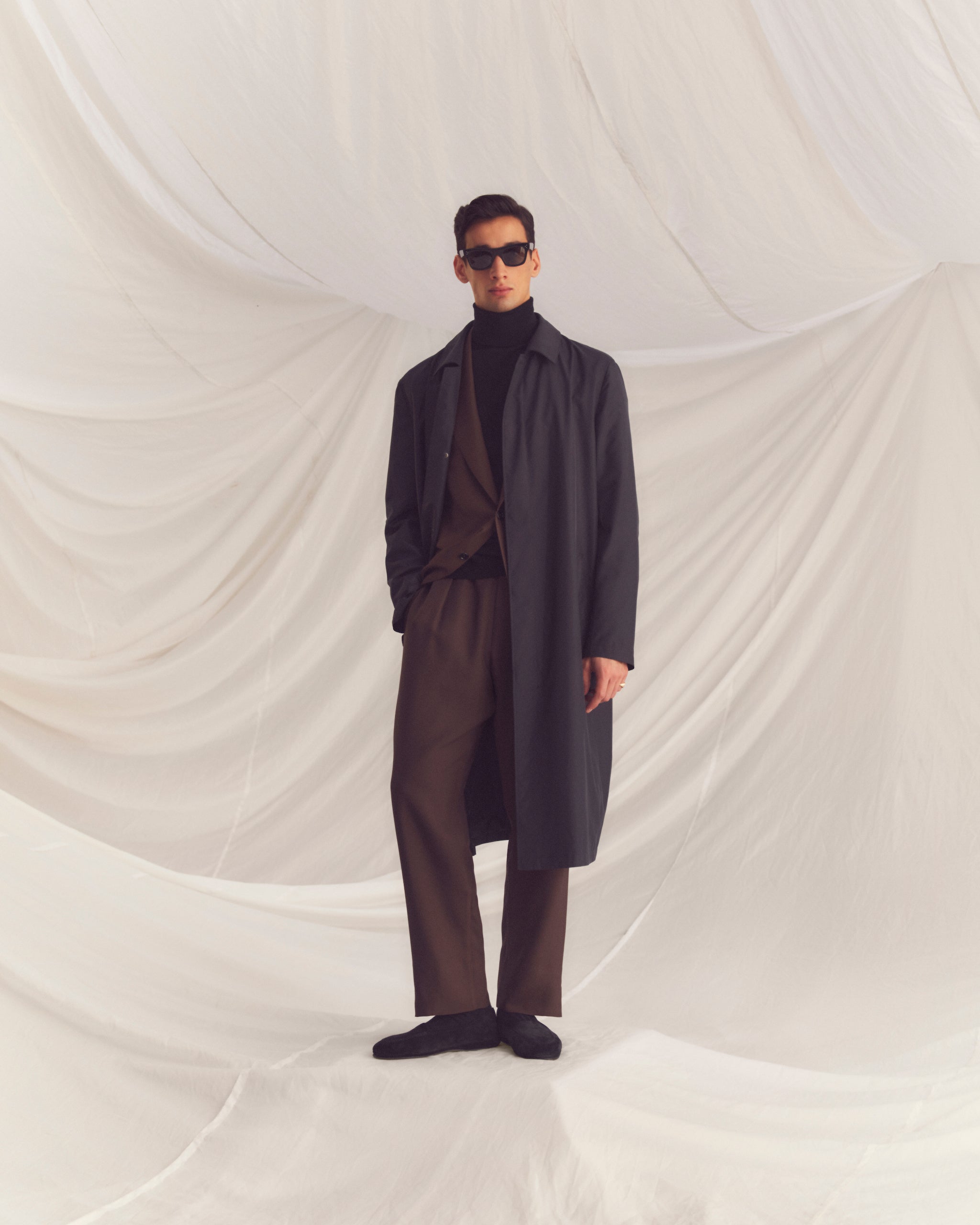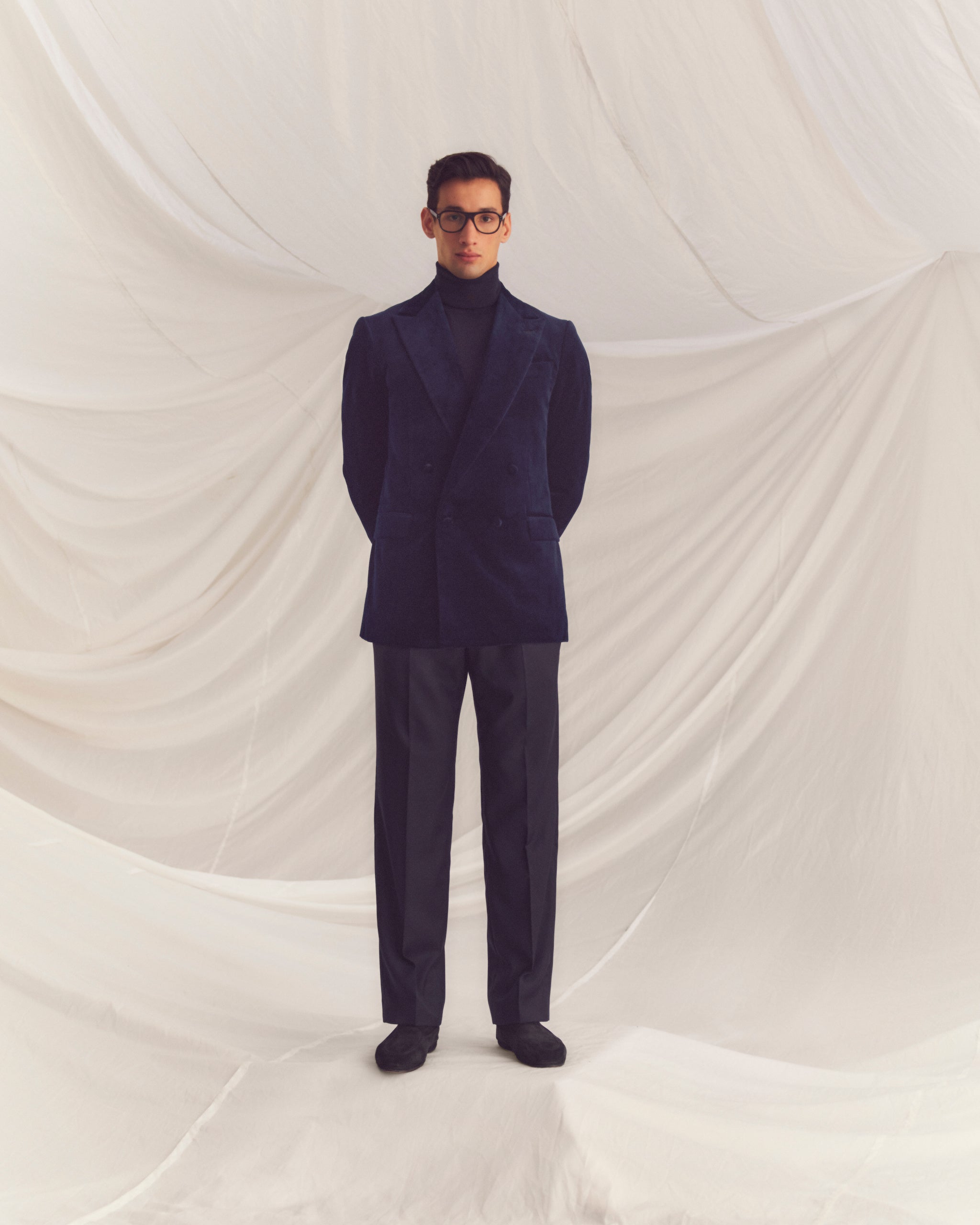 There are a few novel pieces here on the elegant side of casual. A tough looking desert pant in hefty herringbone cotton cloth, and a beautiful smock-y coat called the ‘Corbusier’ which is a soft, detailed and mature alternative to our more technical outerwear pieces. Super fine merino knitwear in crew, roll and polo necks add versatile layering options. Flannels, silk, peach skin cottons, corduroy and worsted gaberdine merinos feature as always in deep and reserved colours. In the evening velvets feature alongside our favourite shantung silks with pronounced shawl collars and pleated bib dress shirts.