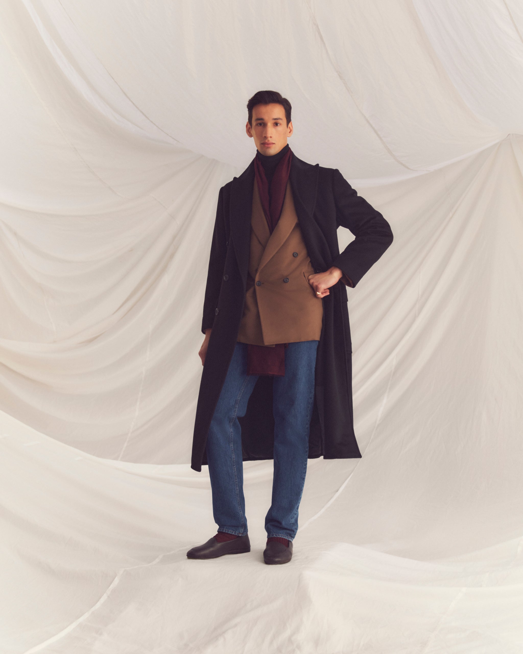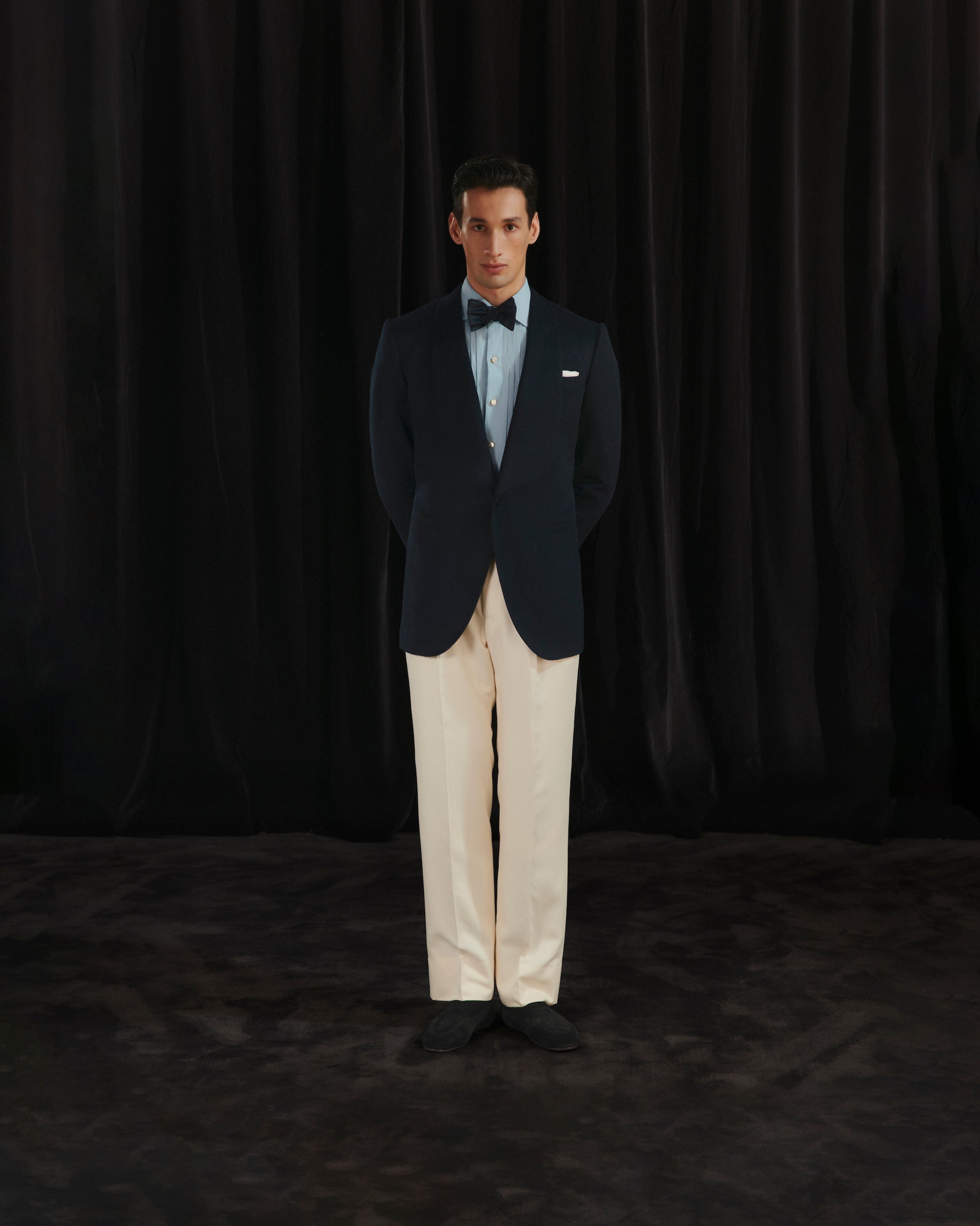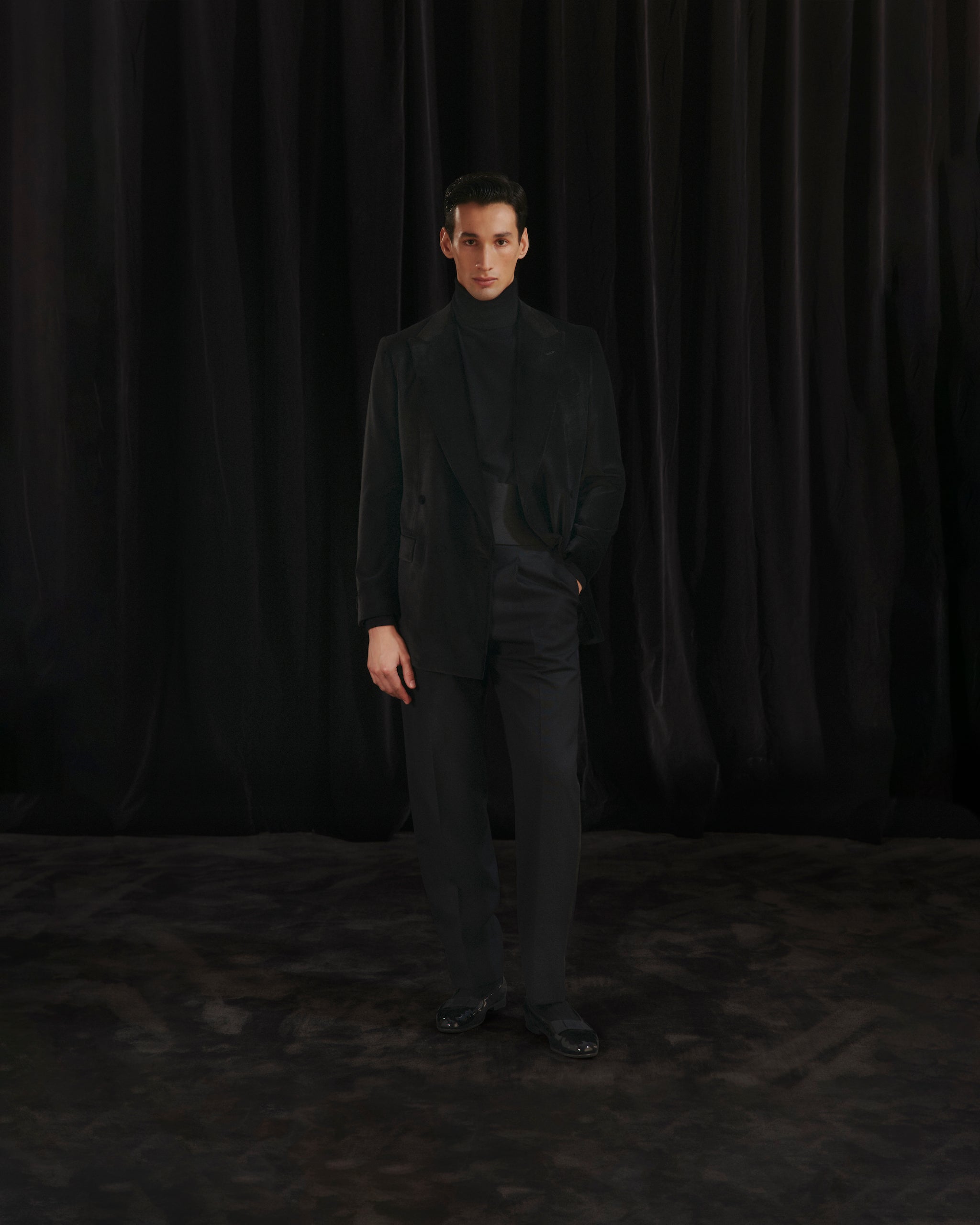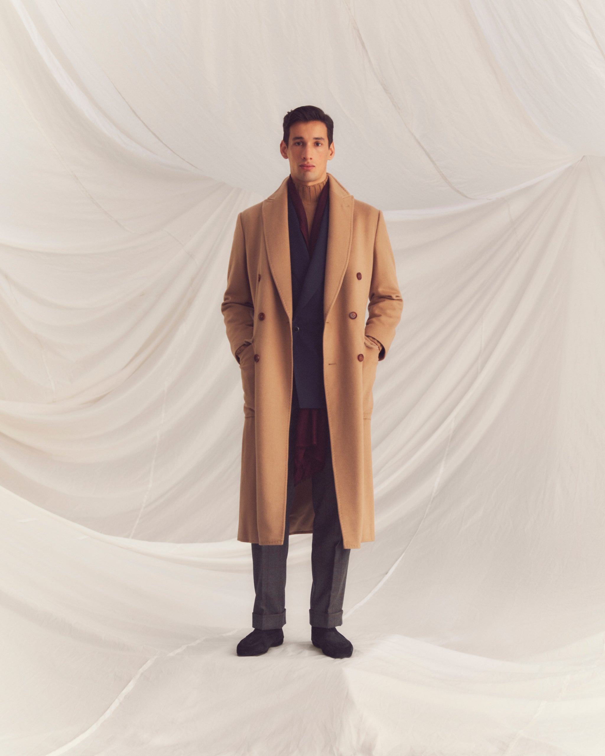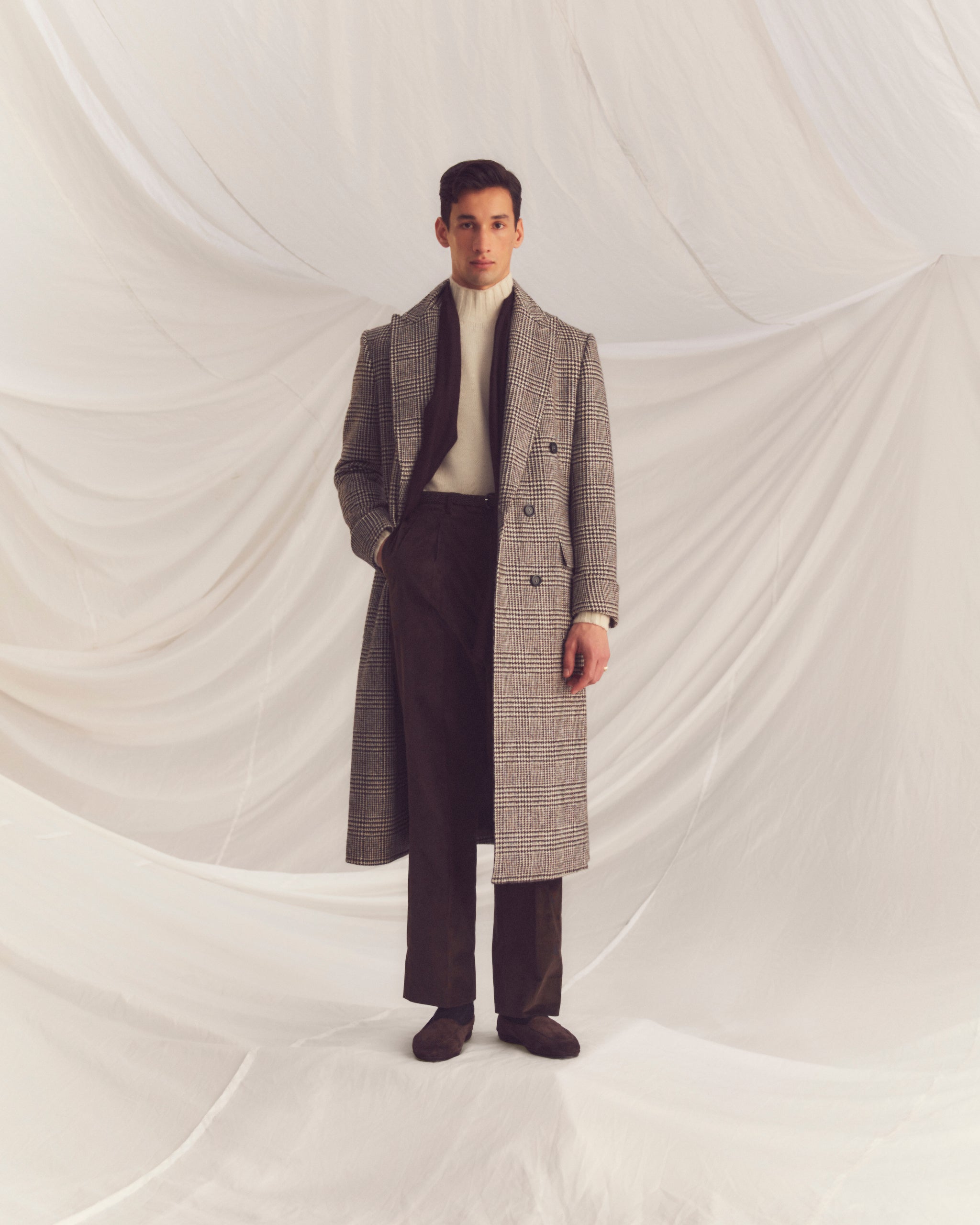 There are a few novel pieces here on the elegant side of casual. A tough looking desert pant in hefty herringbone cotton cloth, and a beautiful smock-y coat called the ‘Corbusier’ which is a soft, detailed and mature alternative to our more technical outerwear pieces. Super fine merino knitwear in crew, roll and polo necks add versatile layering options. Flannels, silk, peach skin cottons, corduroy and worsted gaberdine merinos feature as always in deep and reserved colours. In the evening velvets feature alongside our favourite shantung silks with pronounced shawl collars and pleated bib dress shirts.