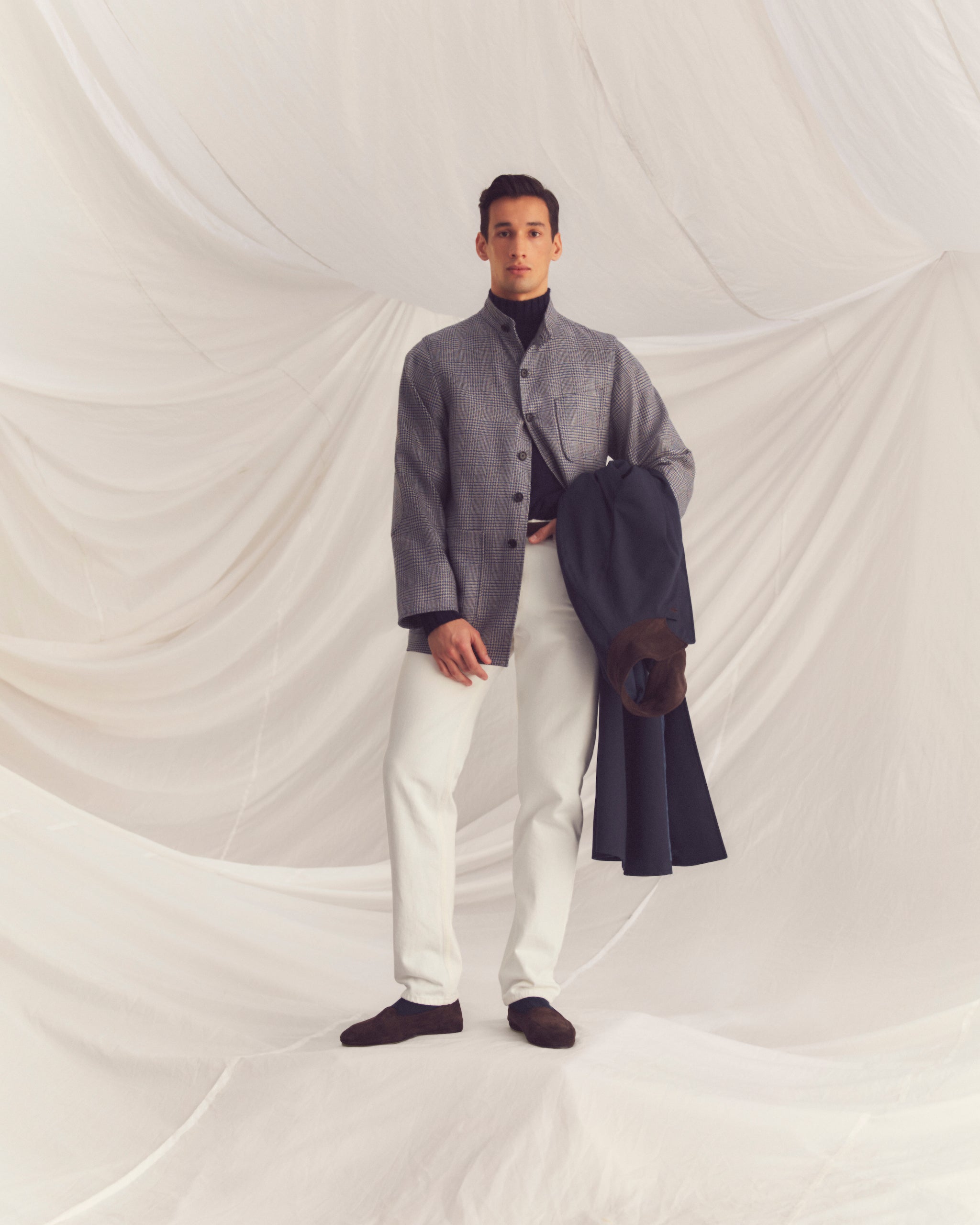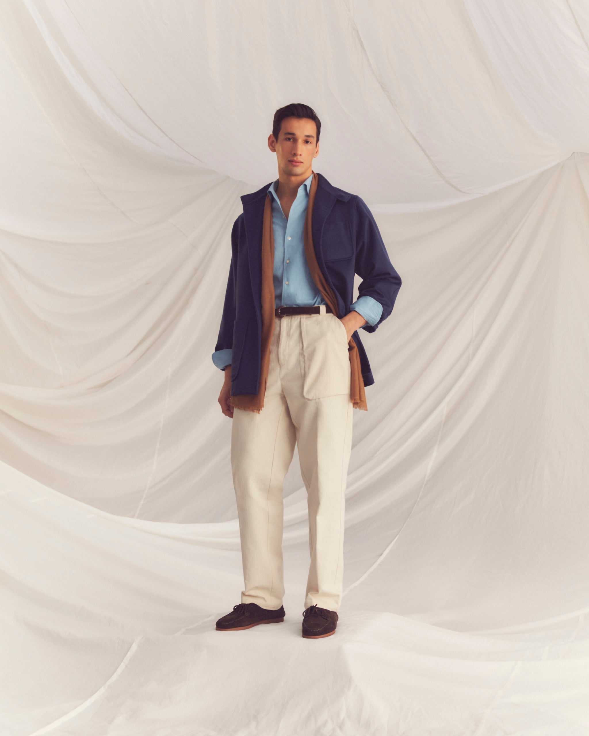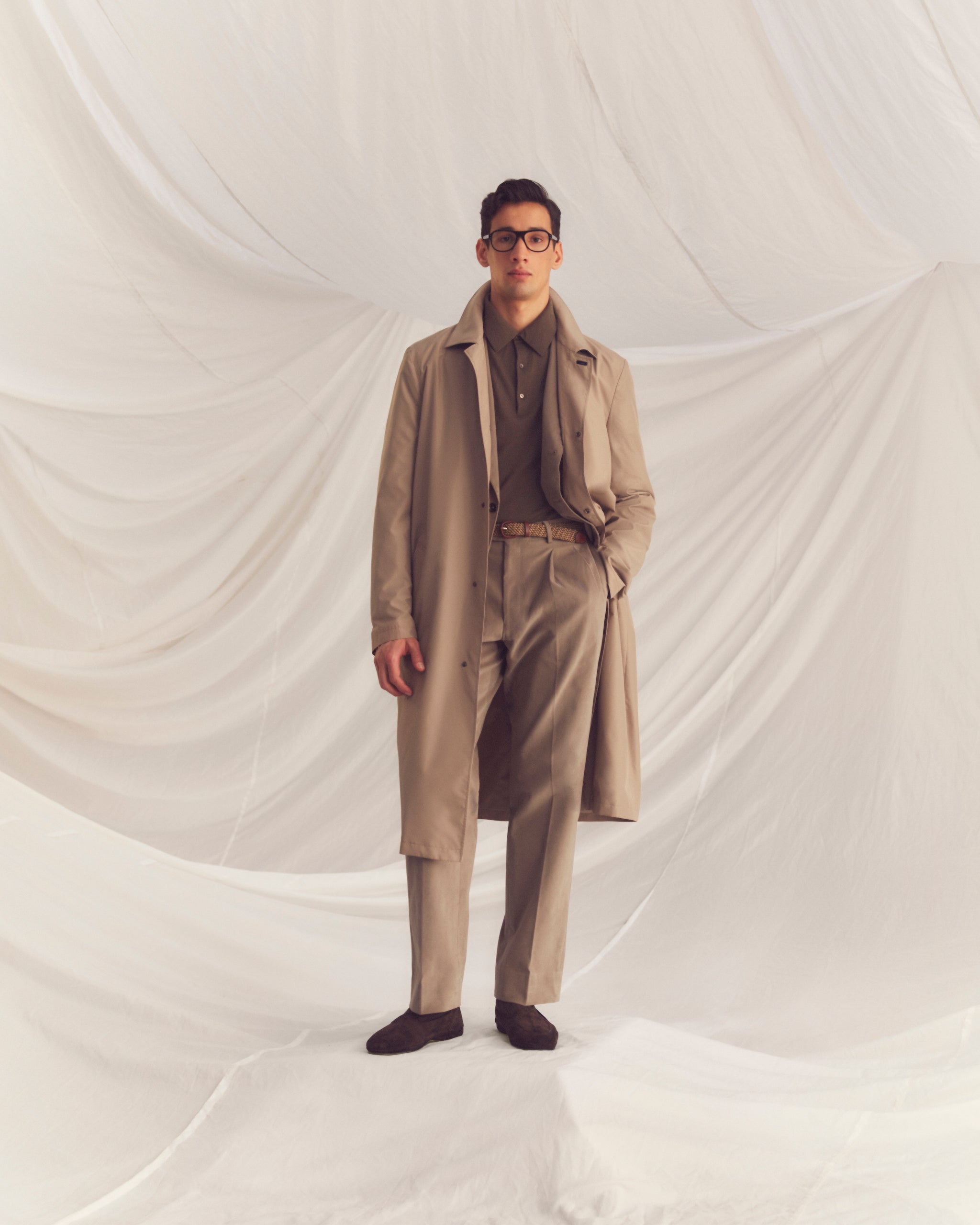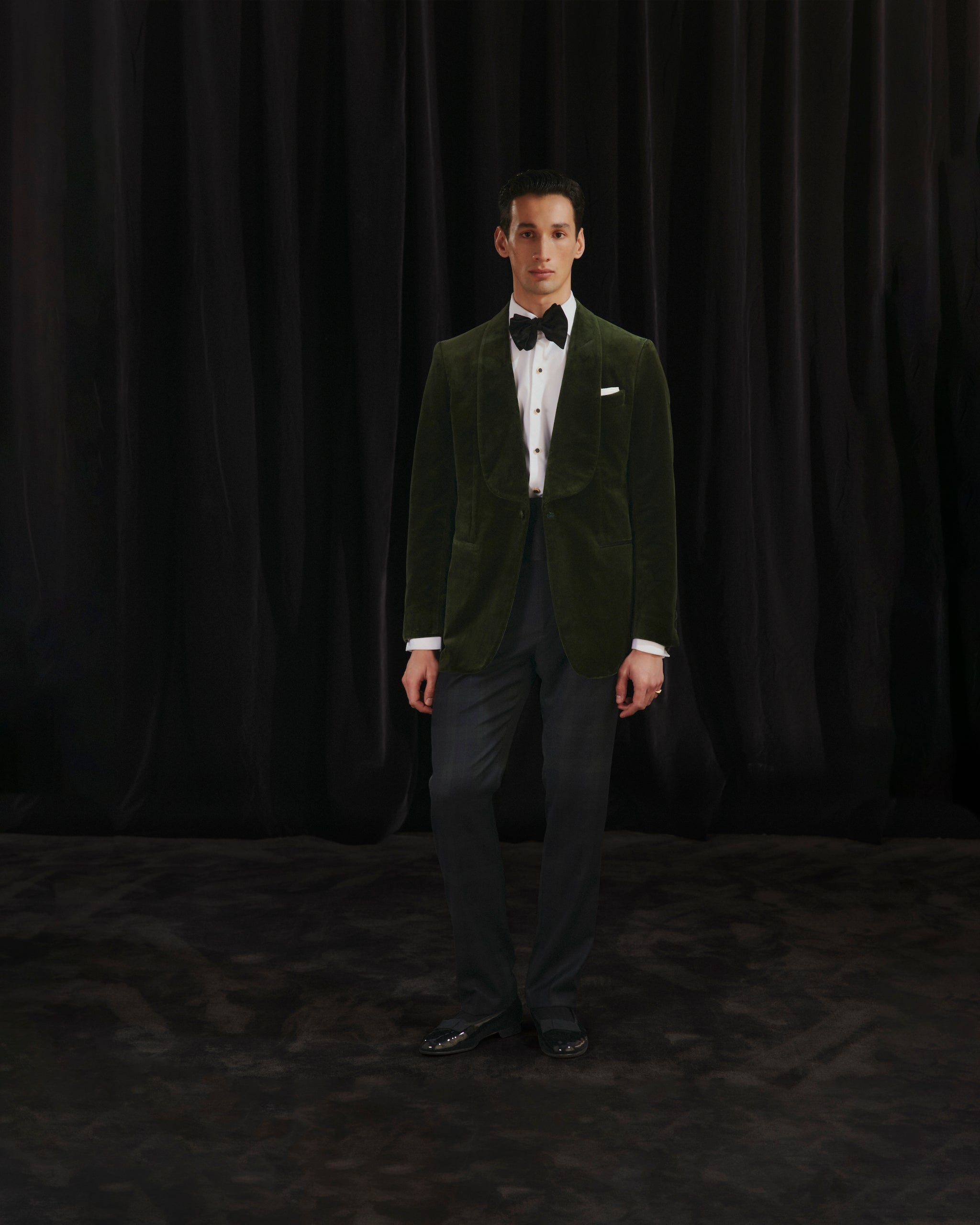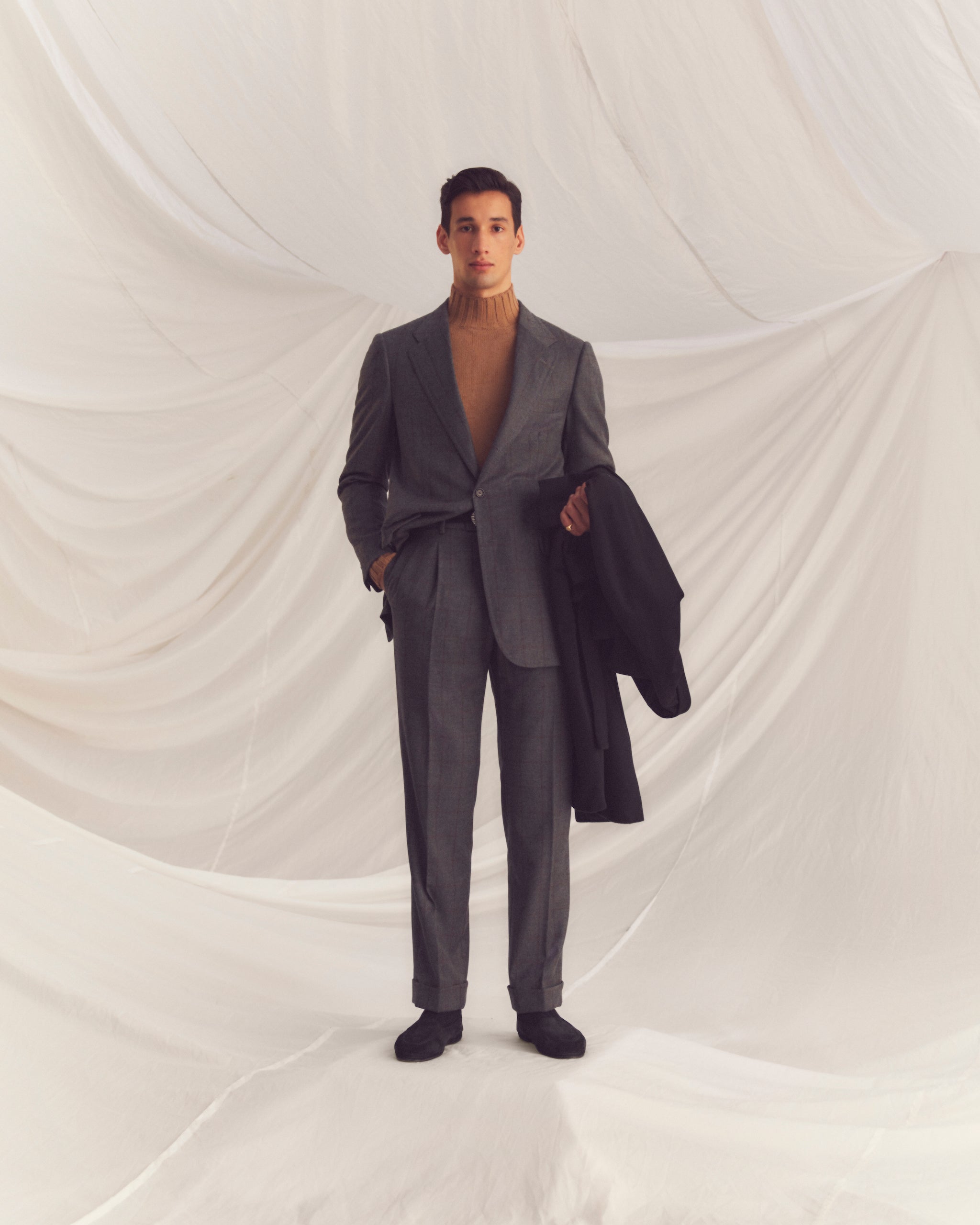 There are a few novel pieces here on the elegant side of casual. A tough looking desert pant in hefty herringbone cotton cloth, and a beautiful smock-y coat called the ‘Corbusier’ which is a soft, detailed and mature alternative to our more technical outerwear pieces. Super fine merino knitwear in crew, roll and polo necks add versatile layering options. Flannels, silk, peach skin cottons, corduroy and worsted gaberdine merinos feature as always in deep and reserved colours. In the evening velvets feature alongside our favourite shantung silks with pronounced shawl collars and pleated bib dress shirts.