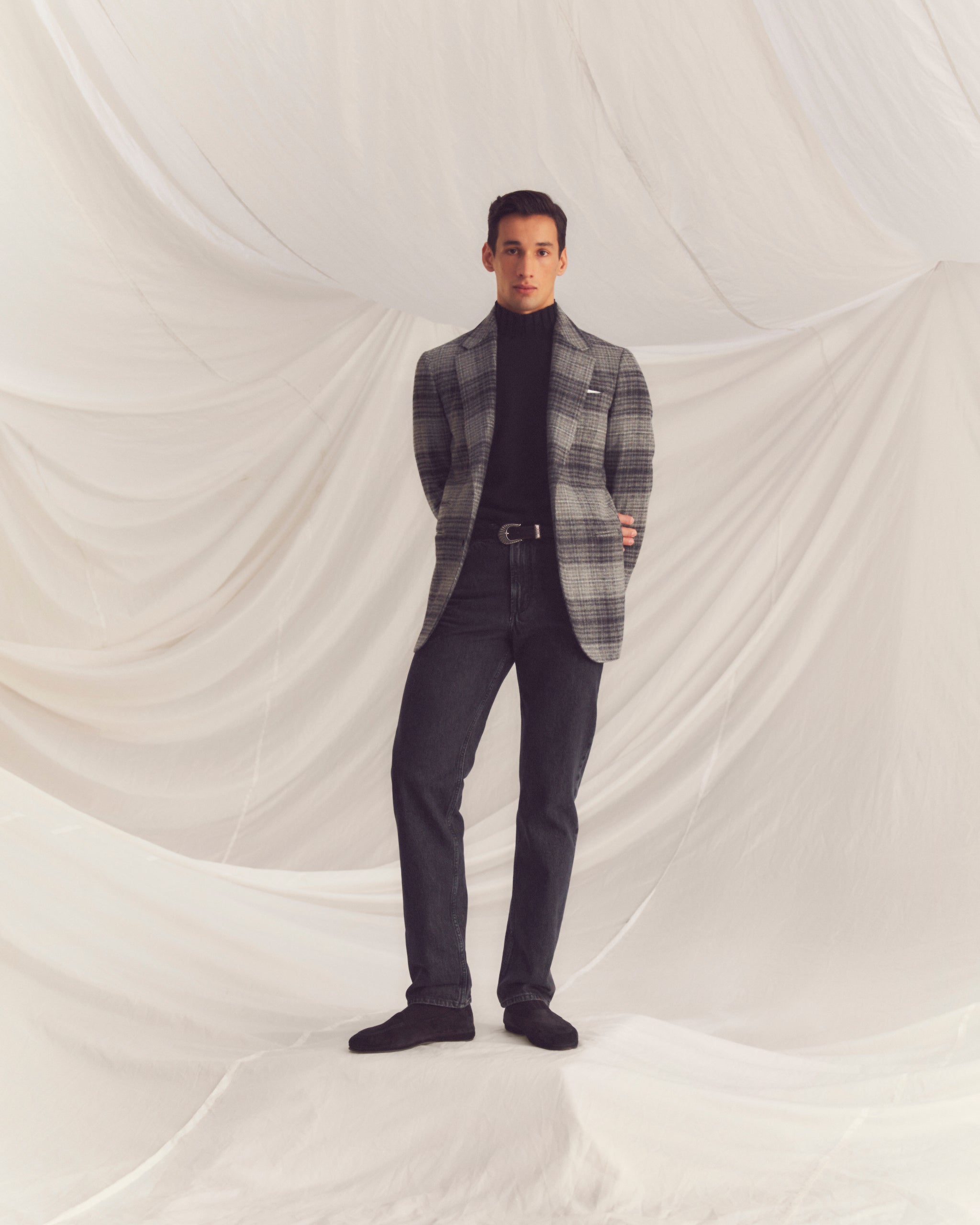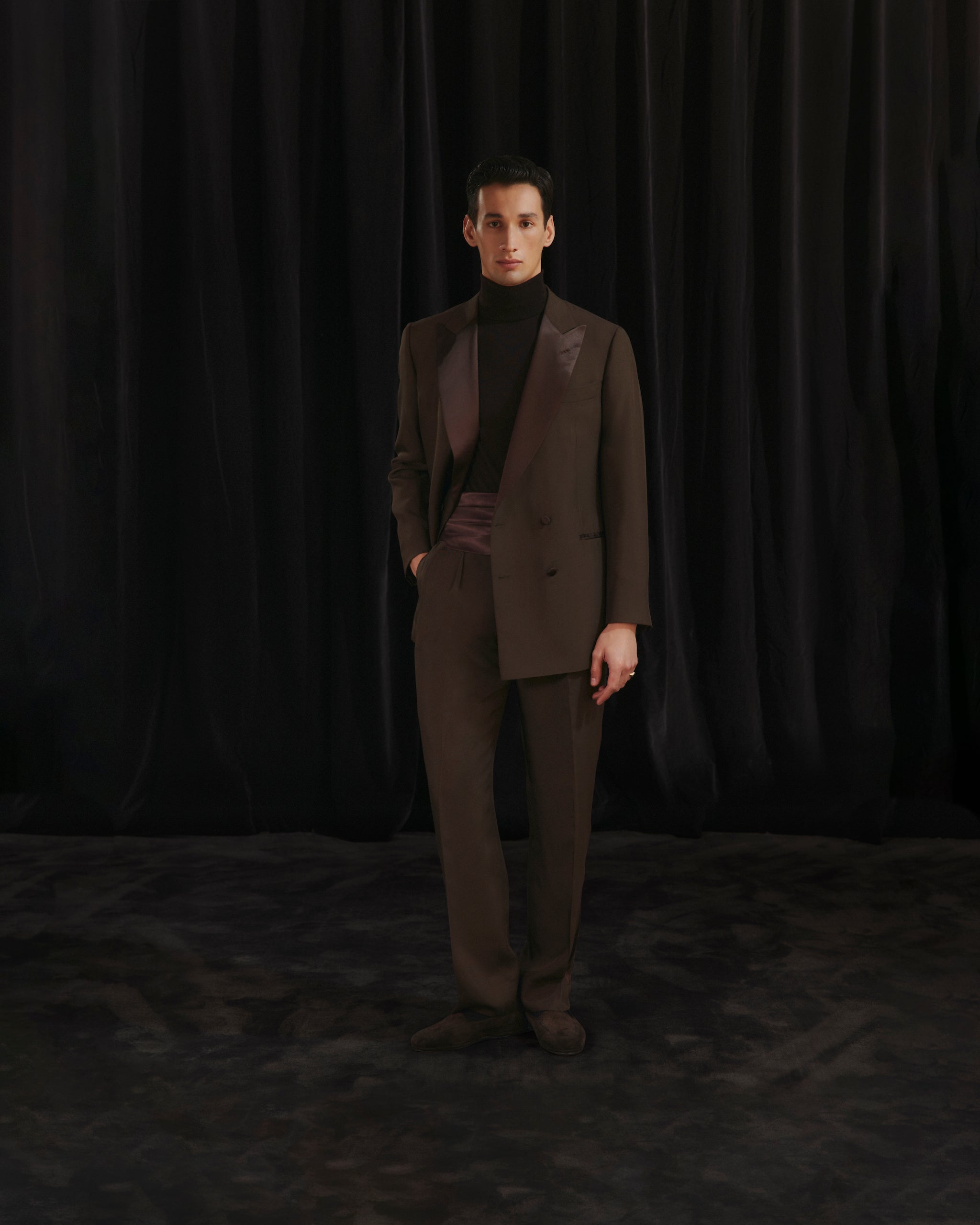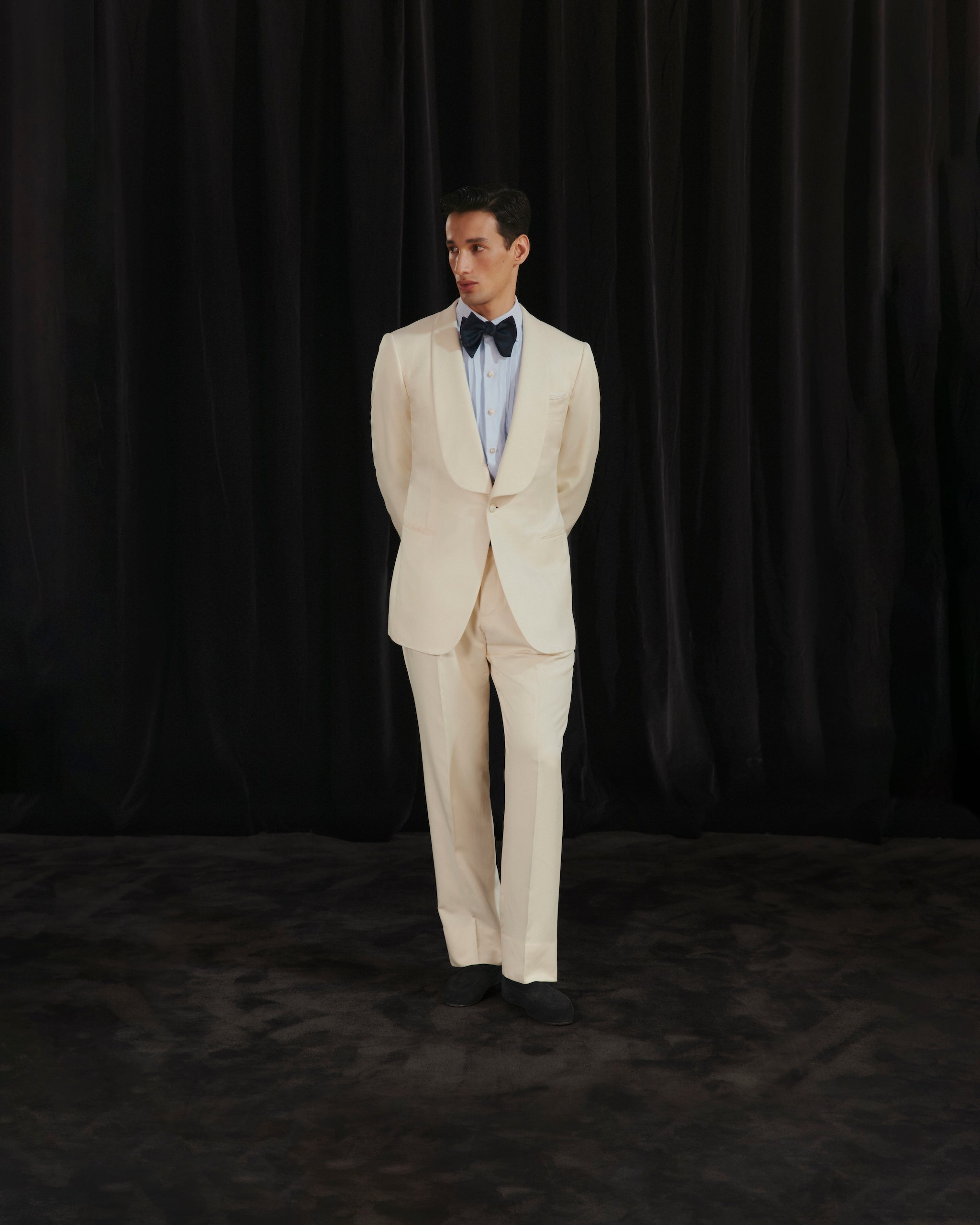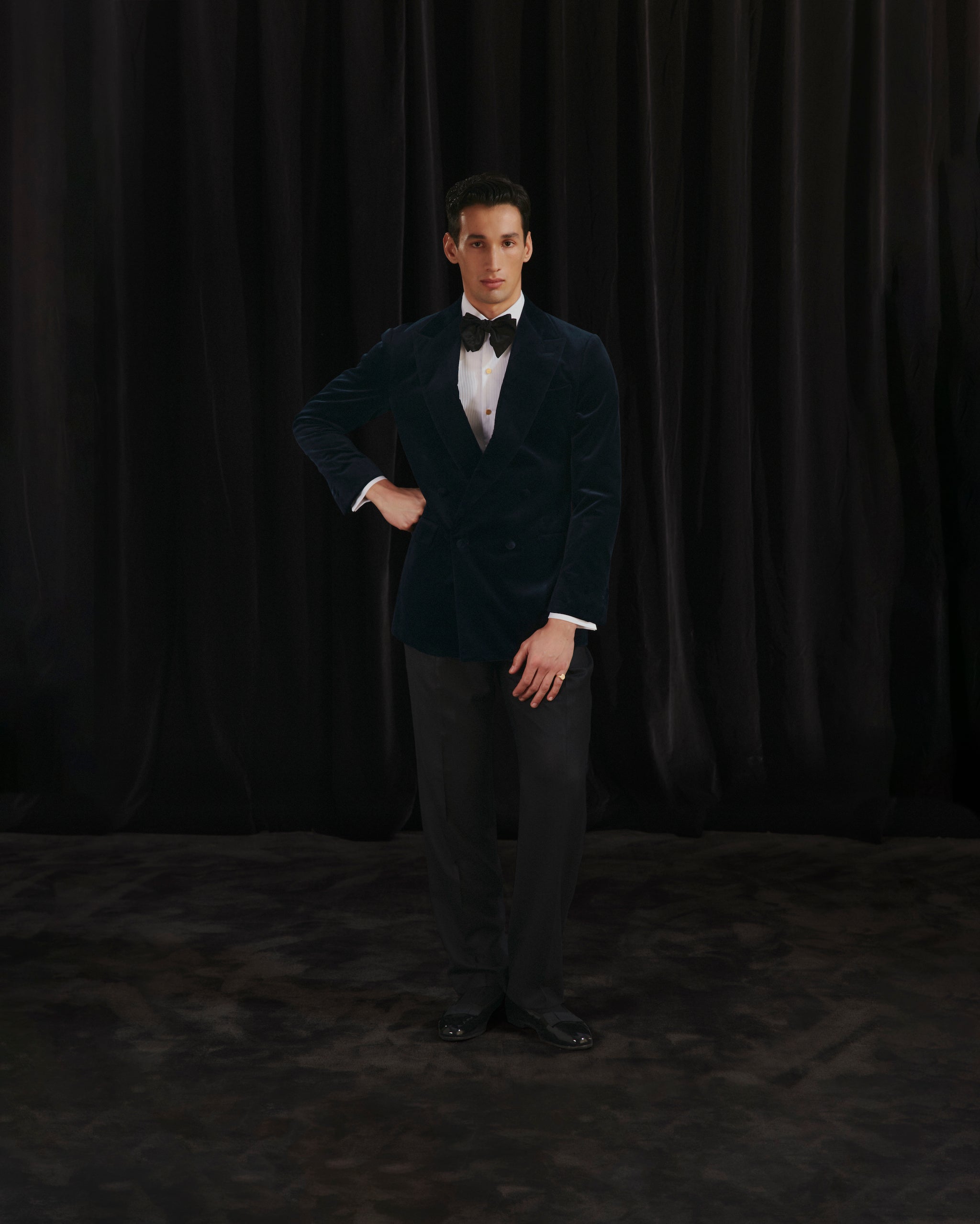 There are a few novel pieces here on the elegant side of casual. A tough looking desert pant in hefty herringbone cotton cloth, and a beautiful smock-y coat called the ‘Corbusier’ which is a soft, detailed and mature alternative to our more technical outerwear pieces. Super fine merino knitwear in crew, roll and polo necks add versatile layering options. Flannels, silk, peach skin cottons, corduroy and worsted gaberdine merinos feature as always in deep and reserved colours. In the evening velvets feature alongside our favourite shantung silks with pronounced shawl collars and pleated bib dress shirts.