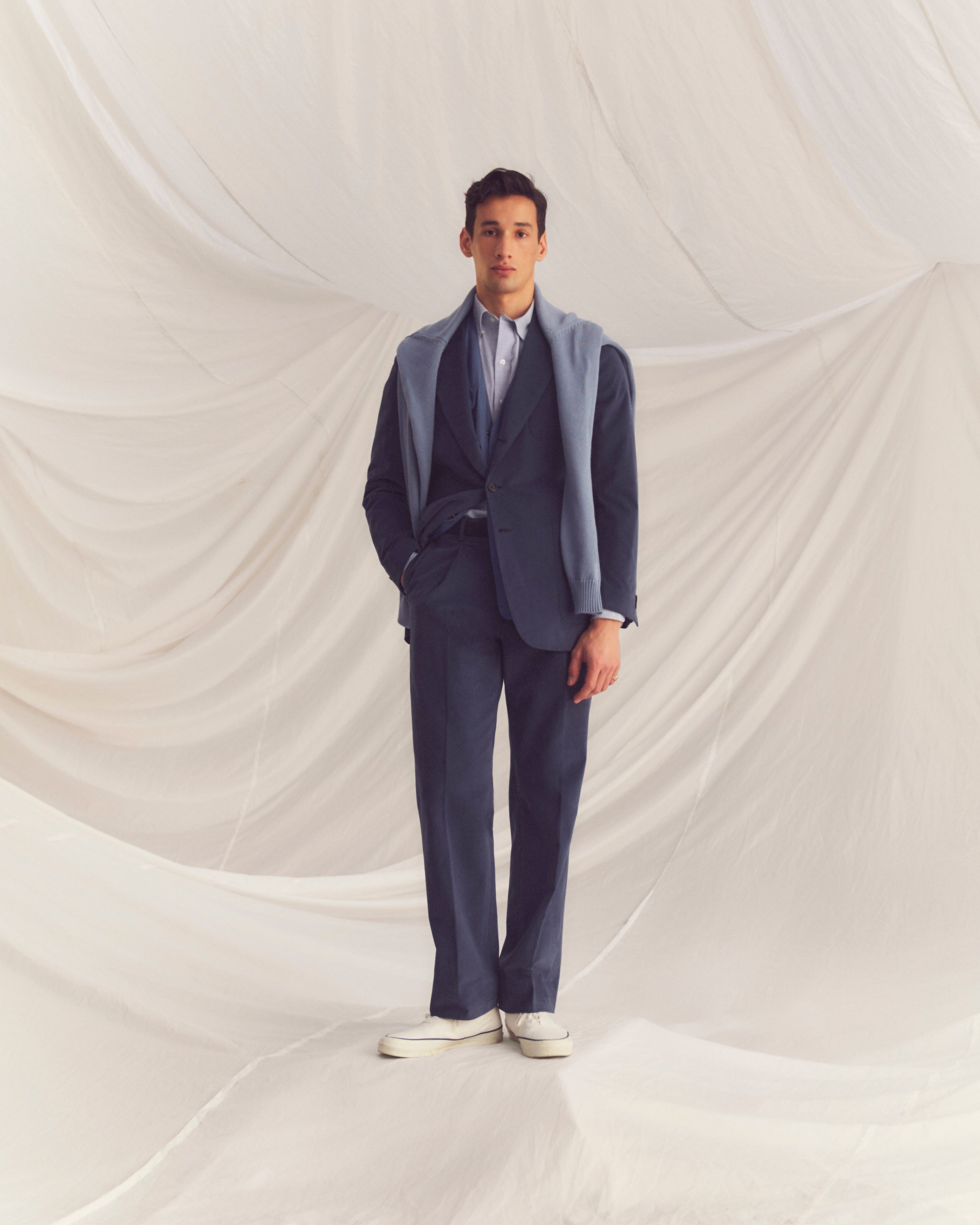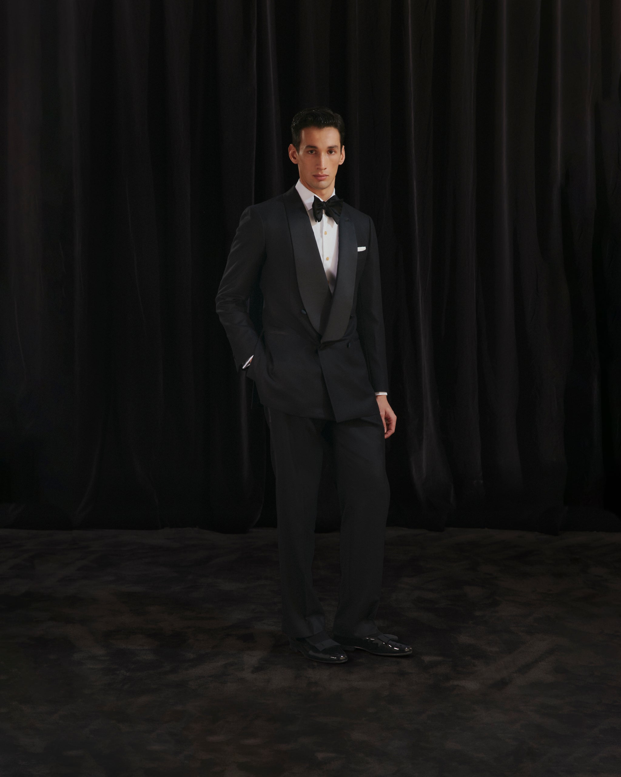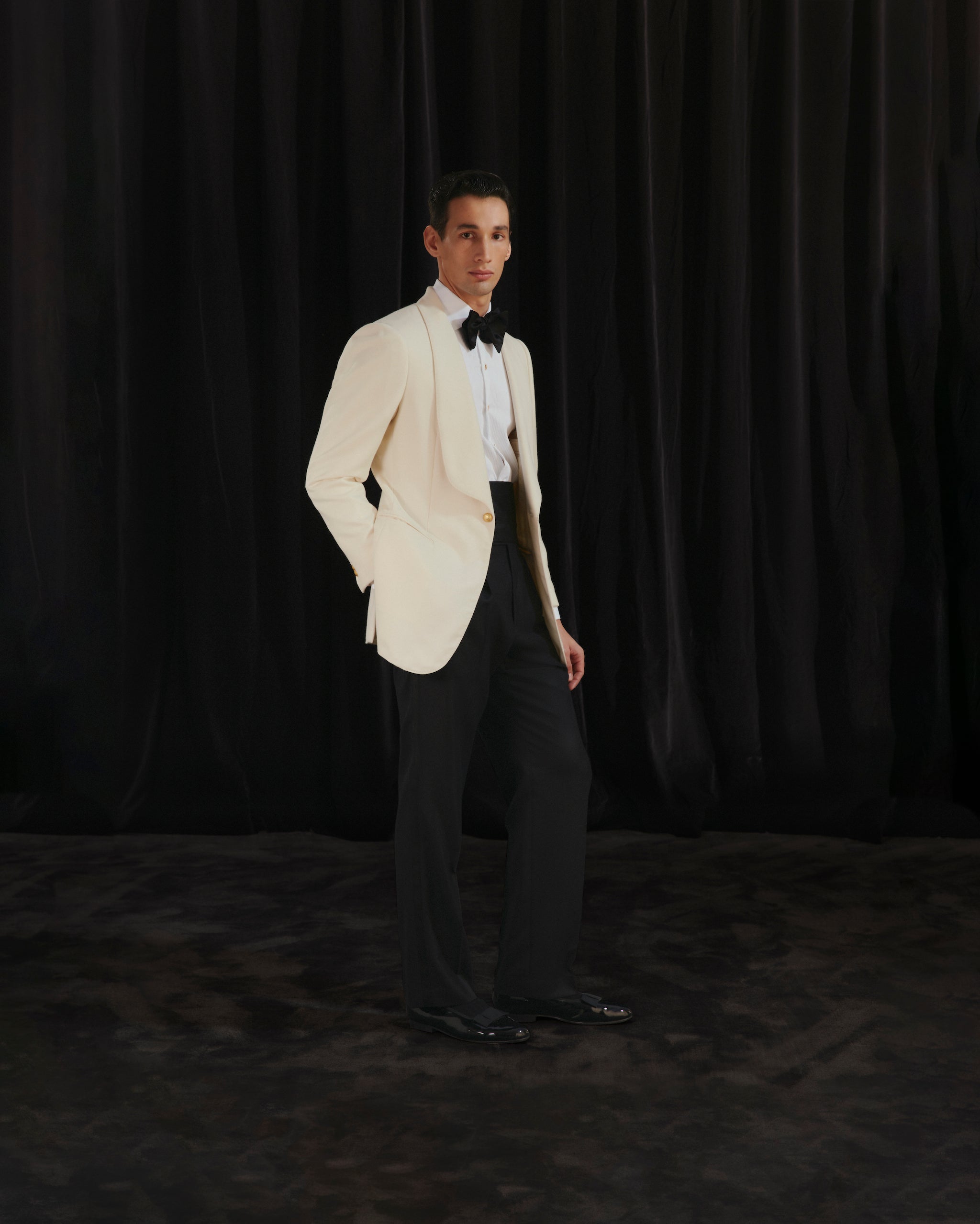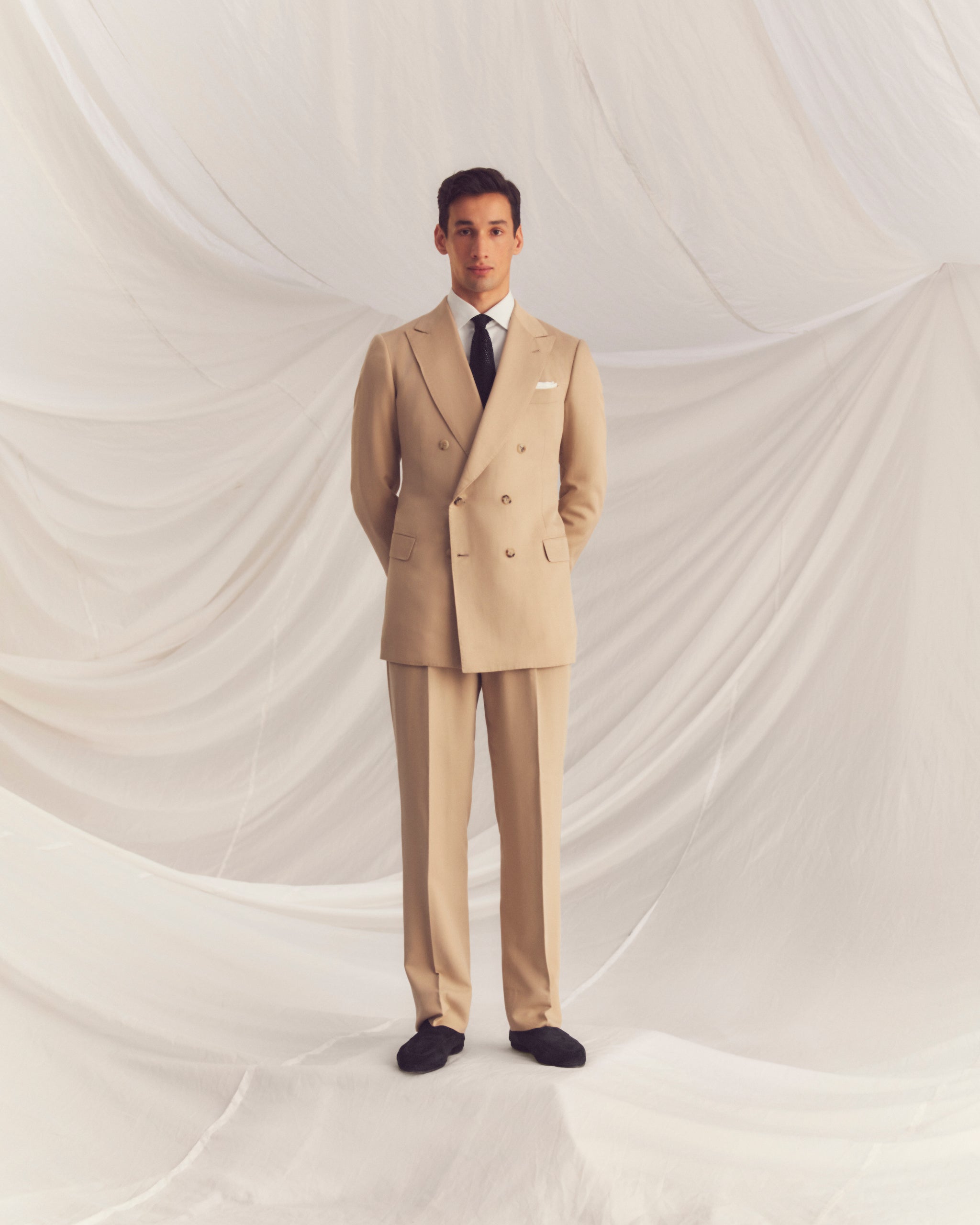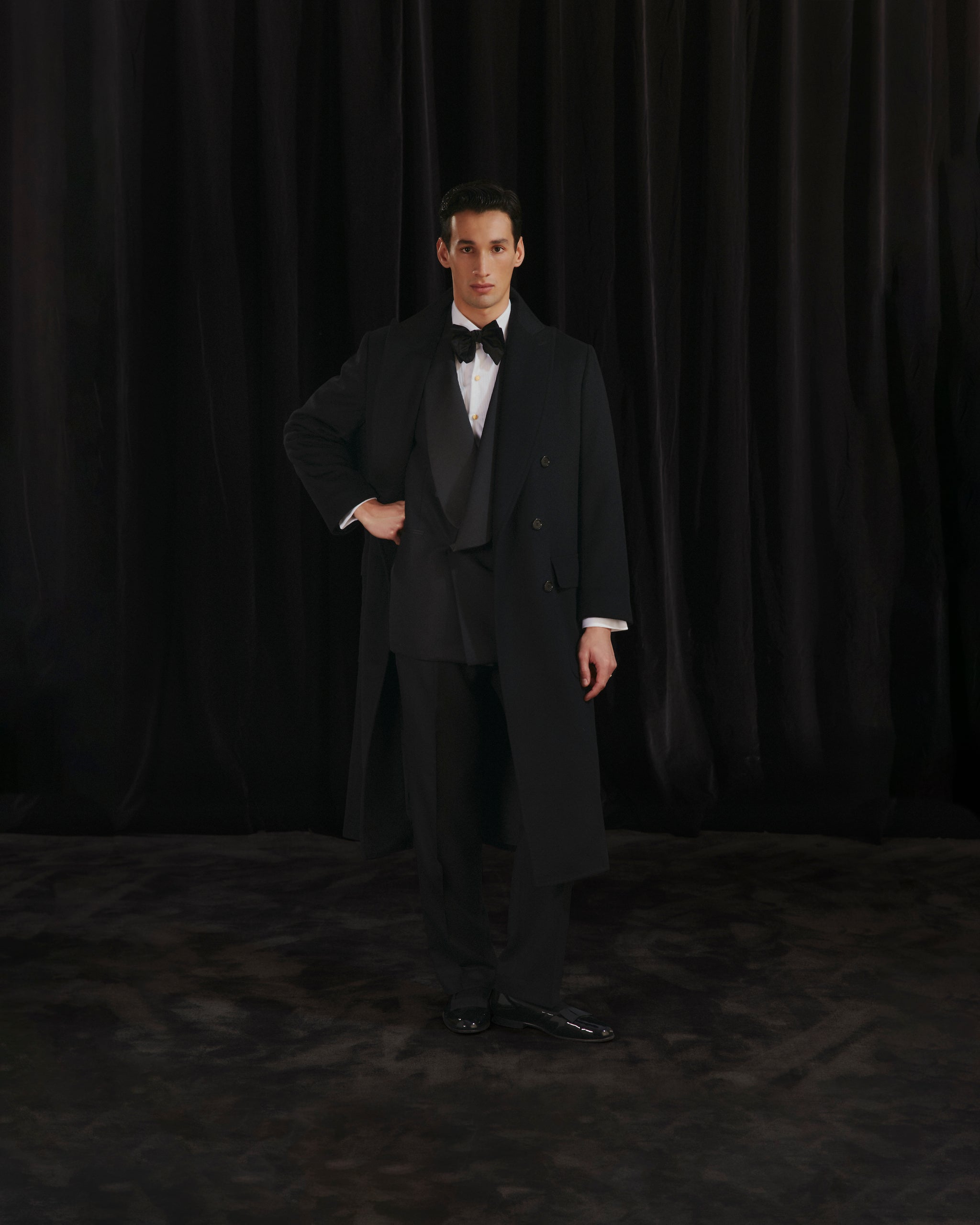 There are a few novel pieces here on the elegant side of casual. A tough looking desert pant in hefty herringbone cotton cloth, and a beautiful smock-y coat called the ‘Corbusier’ which is a soft, detailed and mature alternative to our more technical outerwear pieces. Super fine merino knitwear in crew, roll and polo necks add versatile layering options. Flannels, silk, peach skin cottons, corduroy and worsted gaberdine merinos feature as always in deep and reserved colours. In the evening velvets feature alongside our favourite shantung silks with pronounced shawl collars and pleated bib dress shirts.