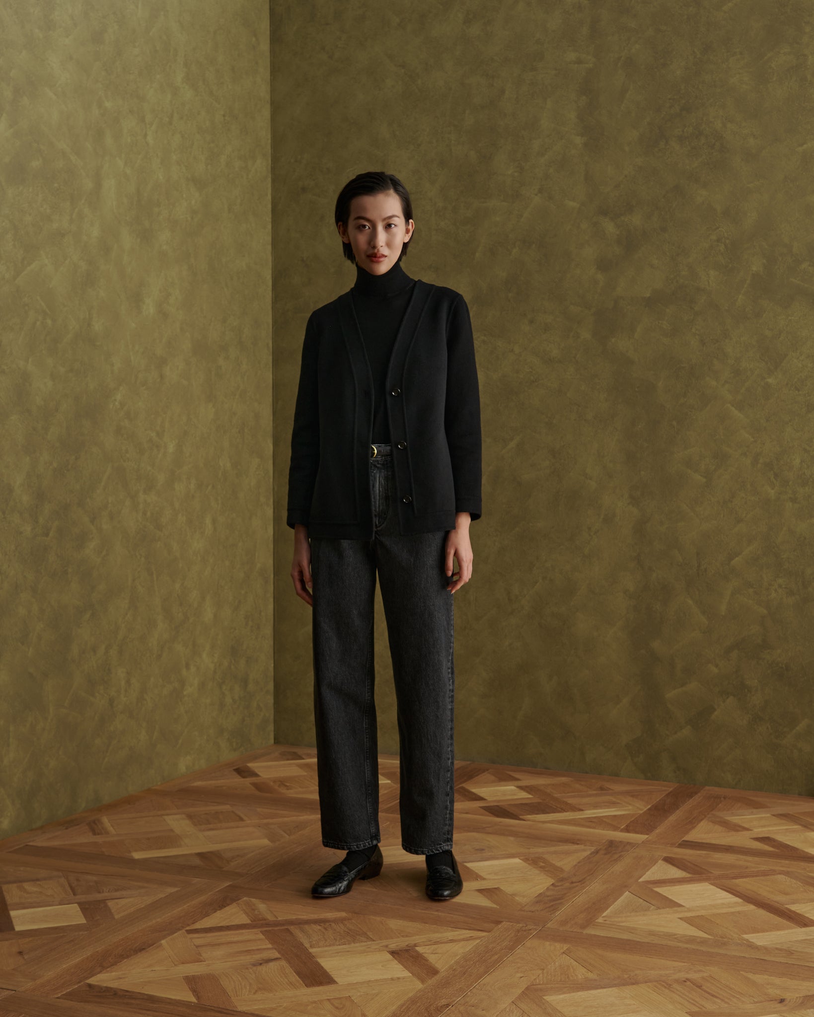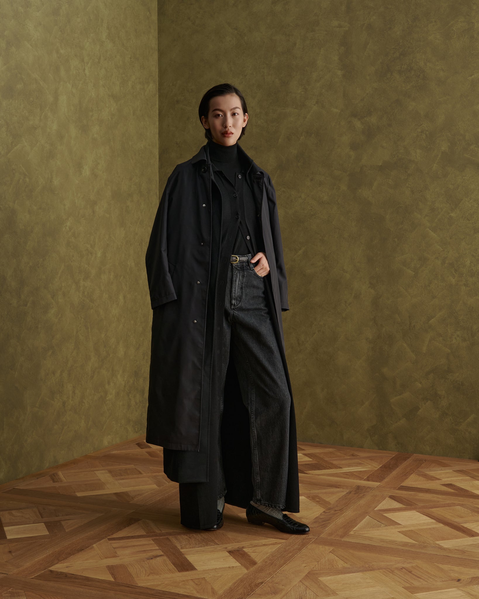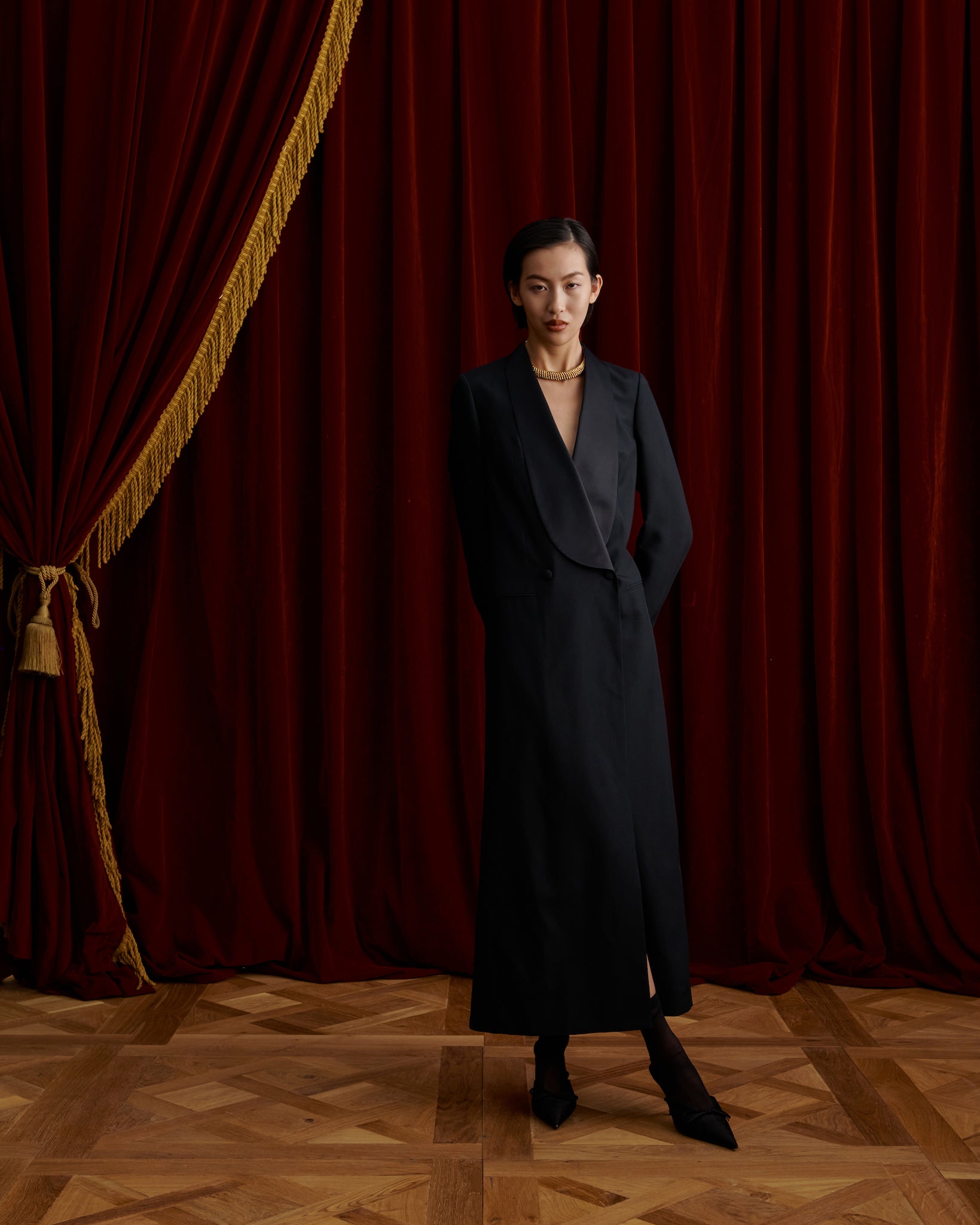 For our women’s offering we have diplomatically merged strictness with softness. We introduce a new three-button jacket and tapered leg trouser shape that brings the suiting collection into an ironic state of femininity. Chocolate, institutional greys, carbon blacks, off white, sienna, heather and mild blues yield a calm and collected appearance. We also introduce a technical mac in a tissue light rip-stop from Japan, built for any moment, and a stunning splittable cashmere cardigan-jacket for when a placatory warmth is required. In shirting we release a few new designs - a versatile deep vee baseball shirt and a ‘hidden’ double breasted shirt which emits a subtle resilience with its frank chest pockets. For the evening we have created a striking shawl collar tuxedo dress in silk and a quilted velvet cropped jacket with A-line skirt set.