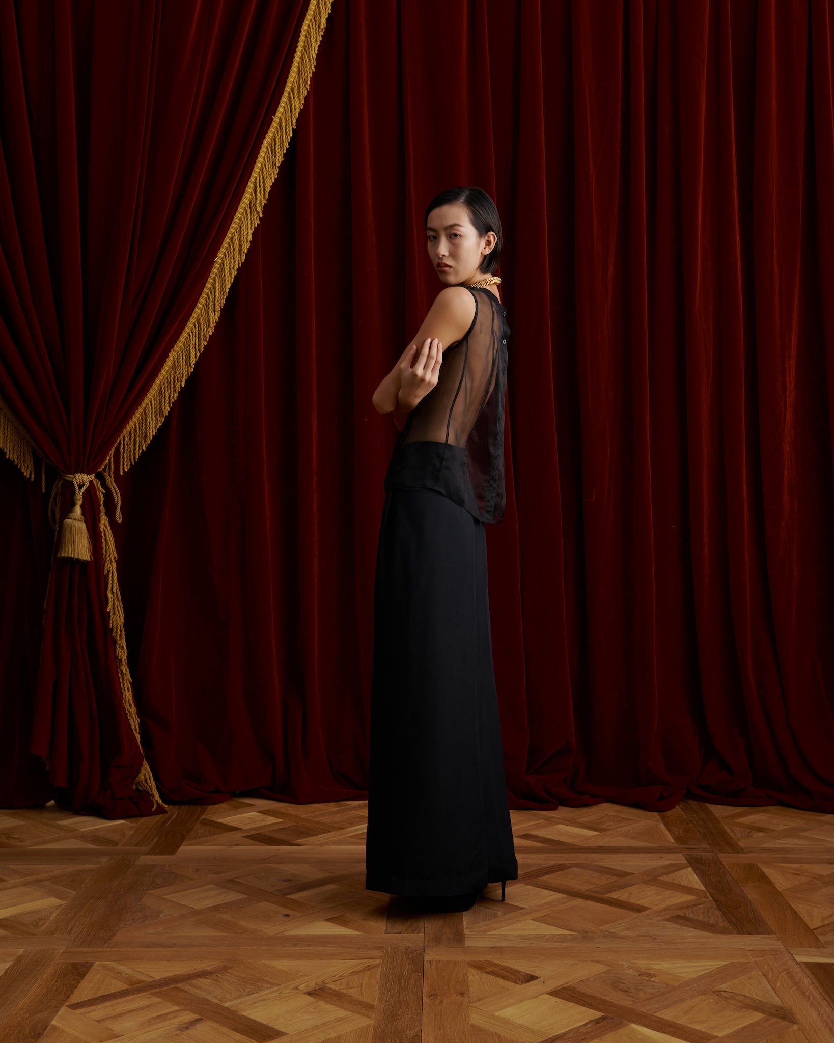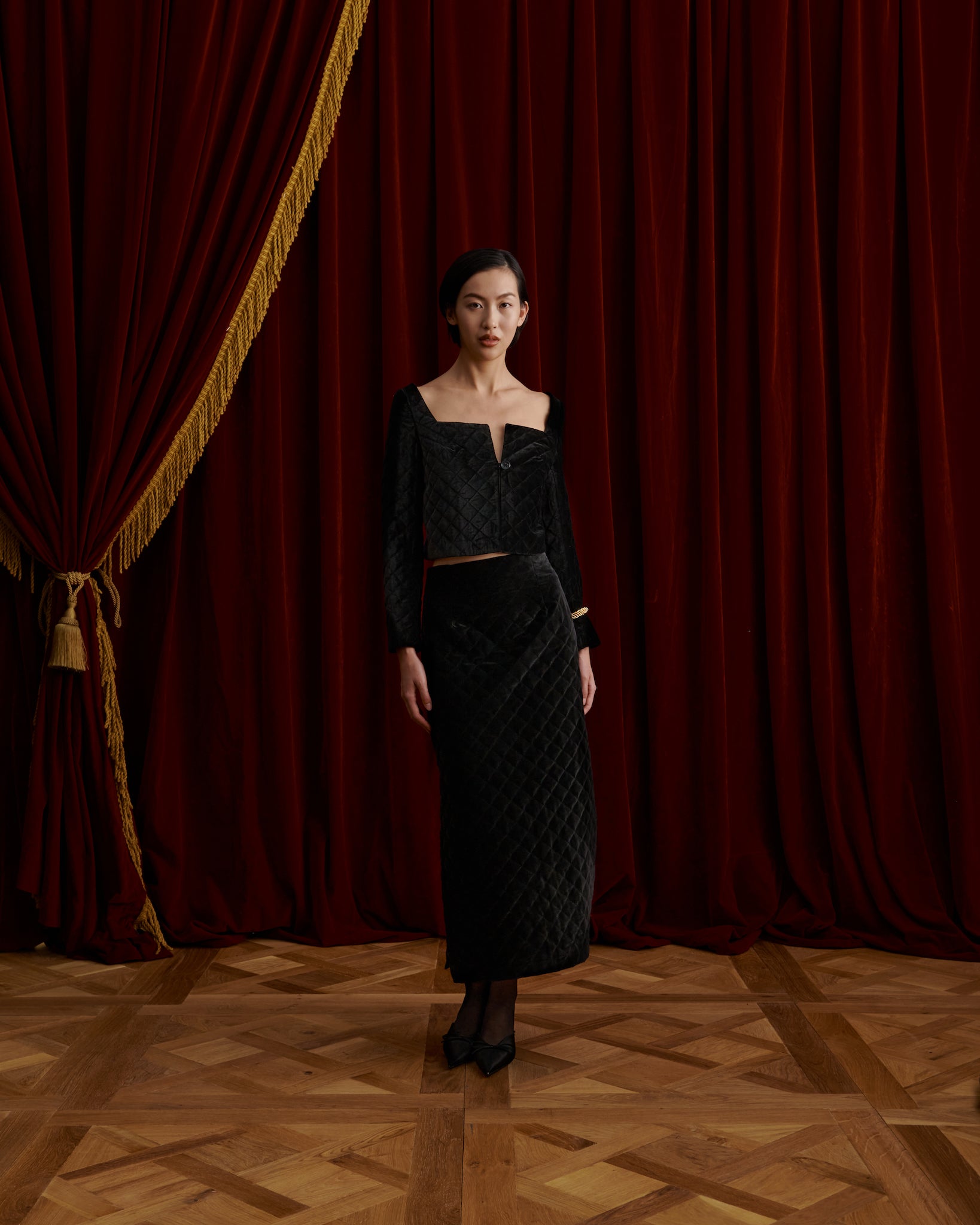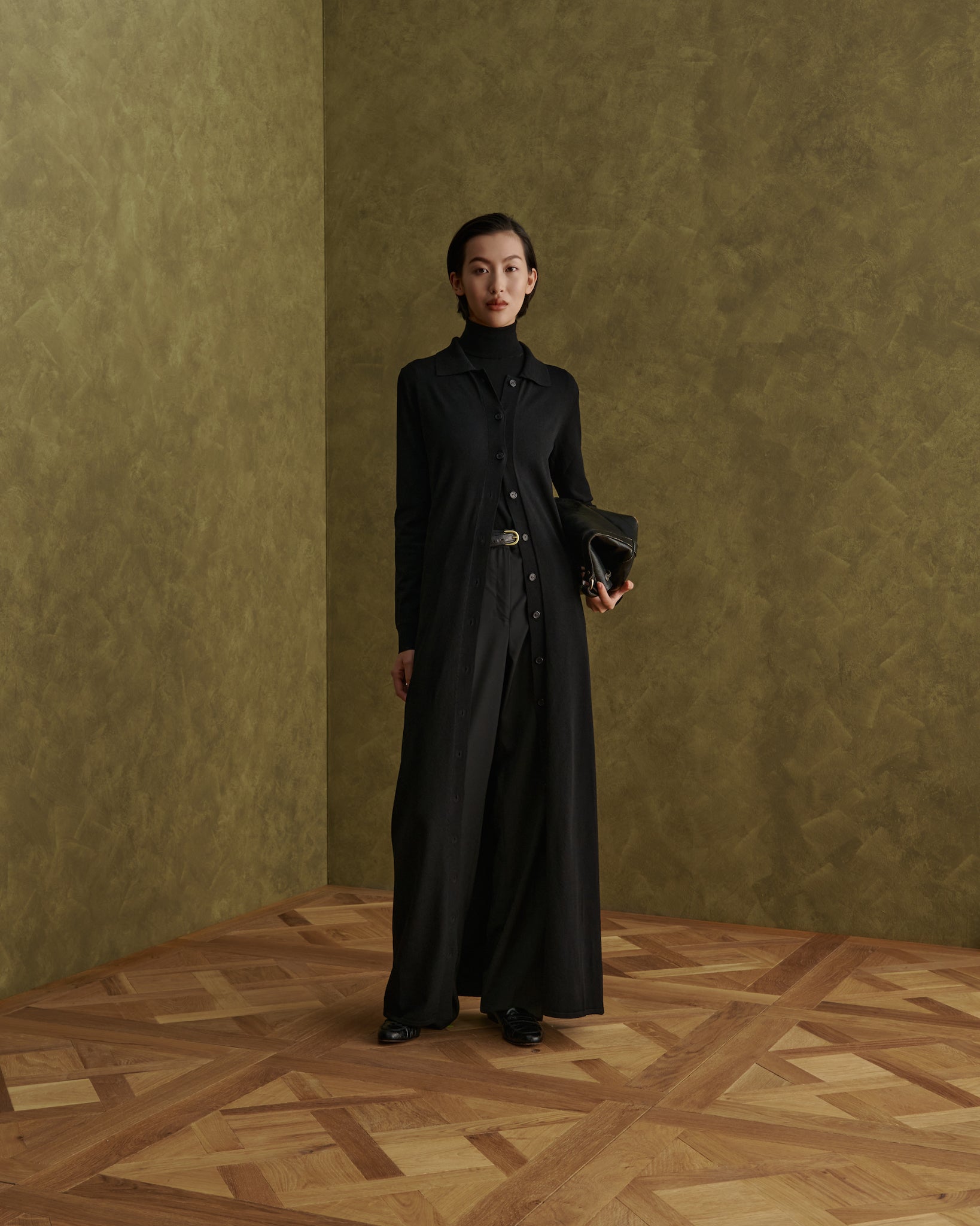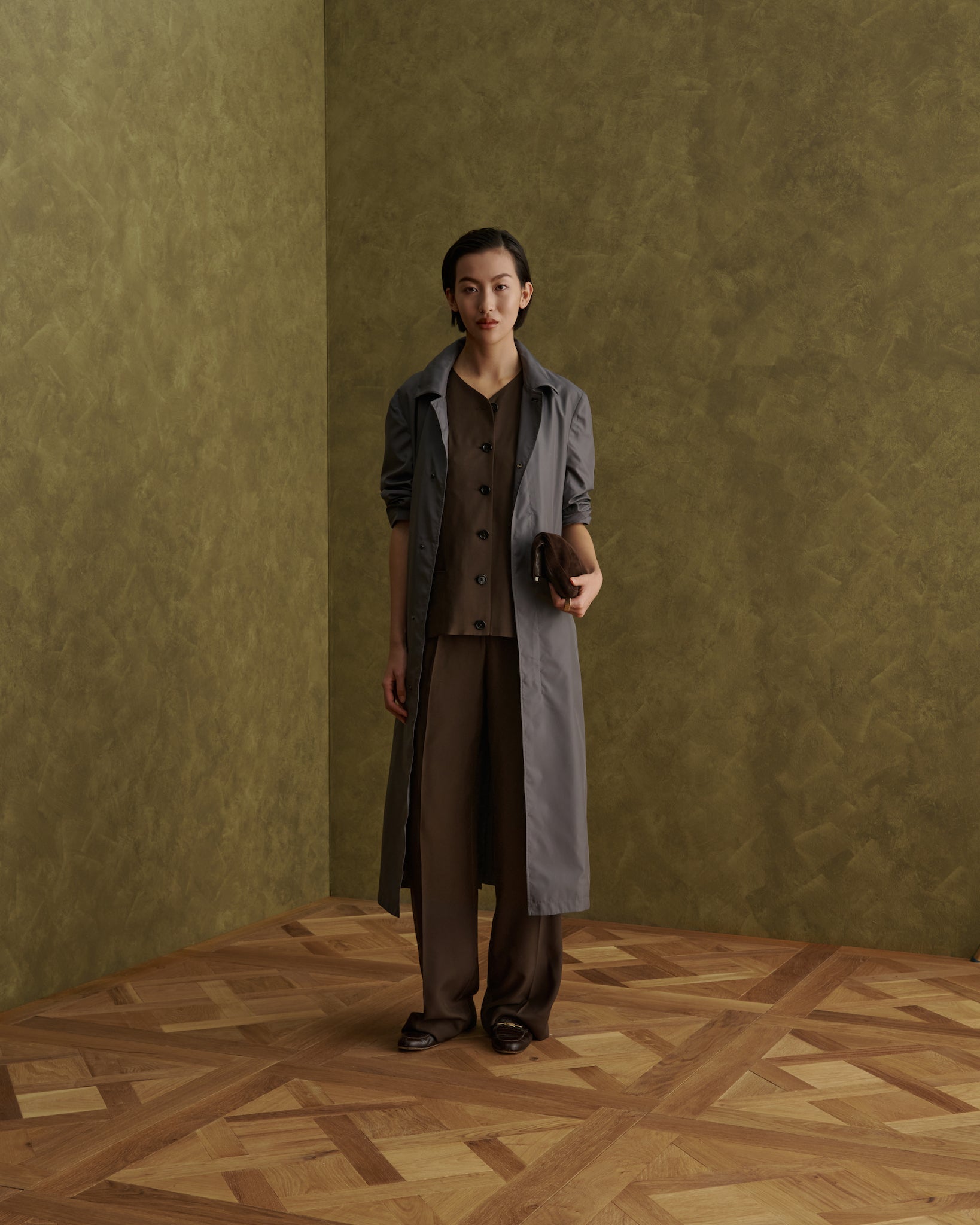 For our women’s offering we have diplomatically merged strictness with softness. We introduce a new three-button jacket and tapered leg trouser shape that brings the suiting collection into an ironic state of femininity. Chocolate, institutional greys, carbon blacks, off white, sienna, heather and mild blues yield a calm and collected appearance. We also introduce a technical mac in a tissue light rip-stop from Japan, built for any moment, and a stunning splittable cashmere cardigan-jacket for when a placatory warmth is required. In shirting we release a few new designs - a versatile deep vee baseball shirt and a ‘hidden’ double breasted shirt which emits a subtle resilience with its frank chest pockets. For the evening we have created a striking shawl collar tuxedo dress in silk and a quilted velvet cropped jacket with A-line skirt set.