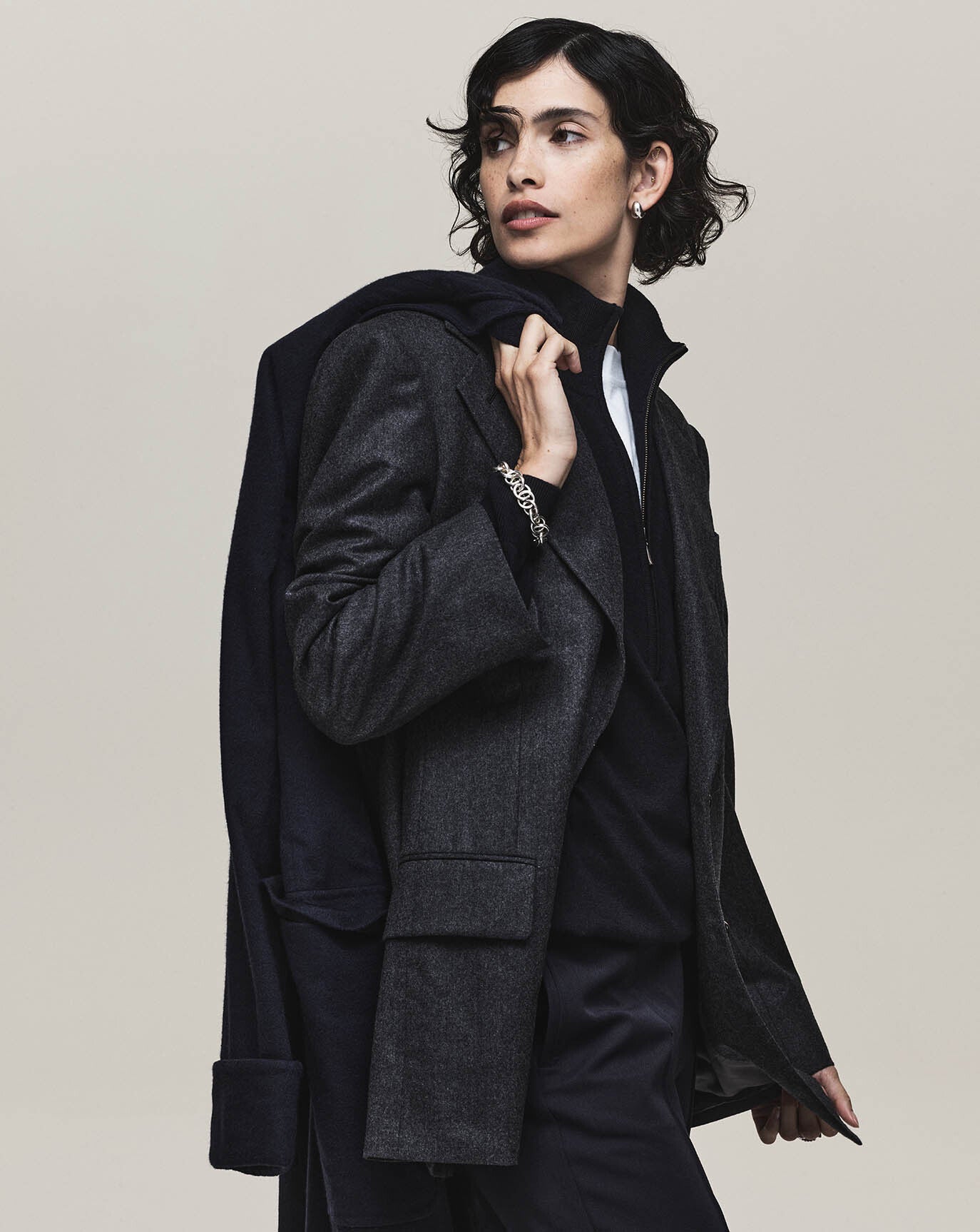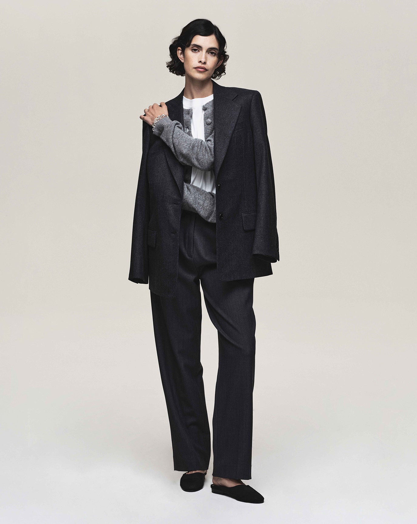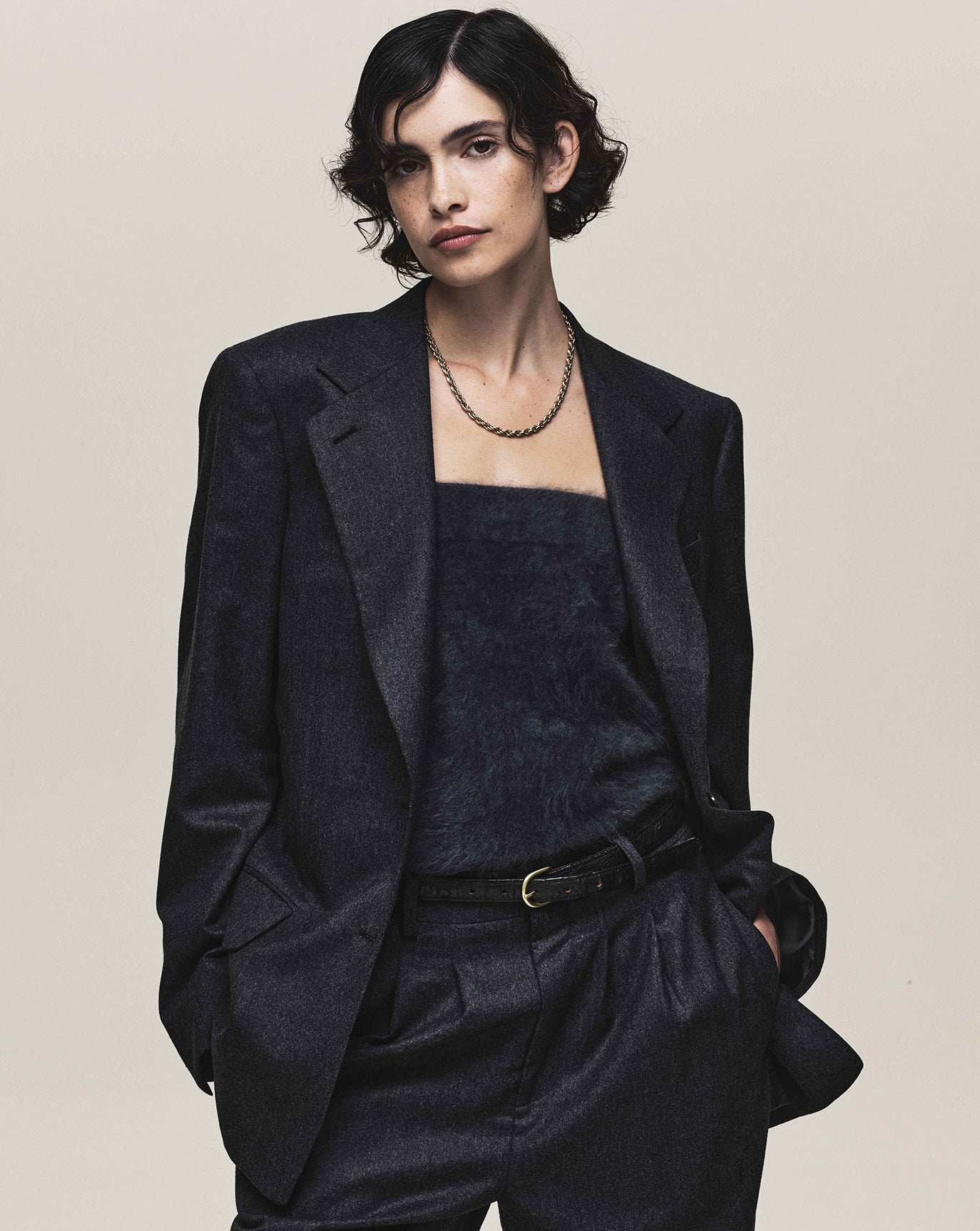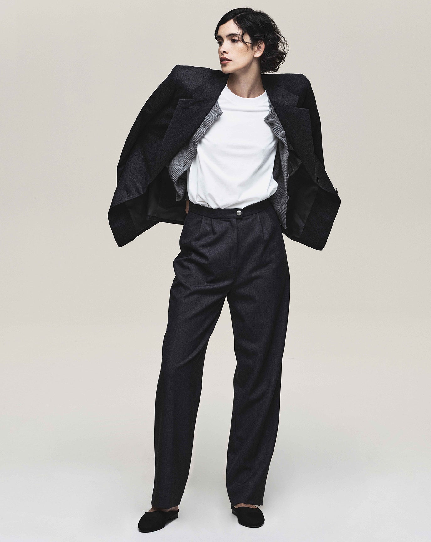 We revisit the strength of the Ava jacket and triple pleat trouser, this time in a moody charcoal. We introduce the rather confident Lou trouser in off white, nubuck brown and dark grey.