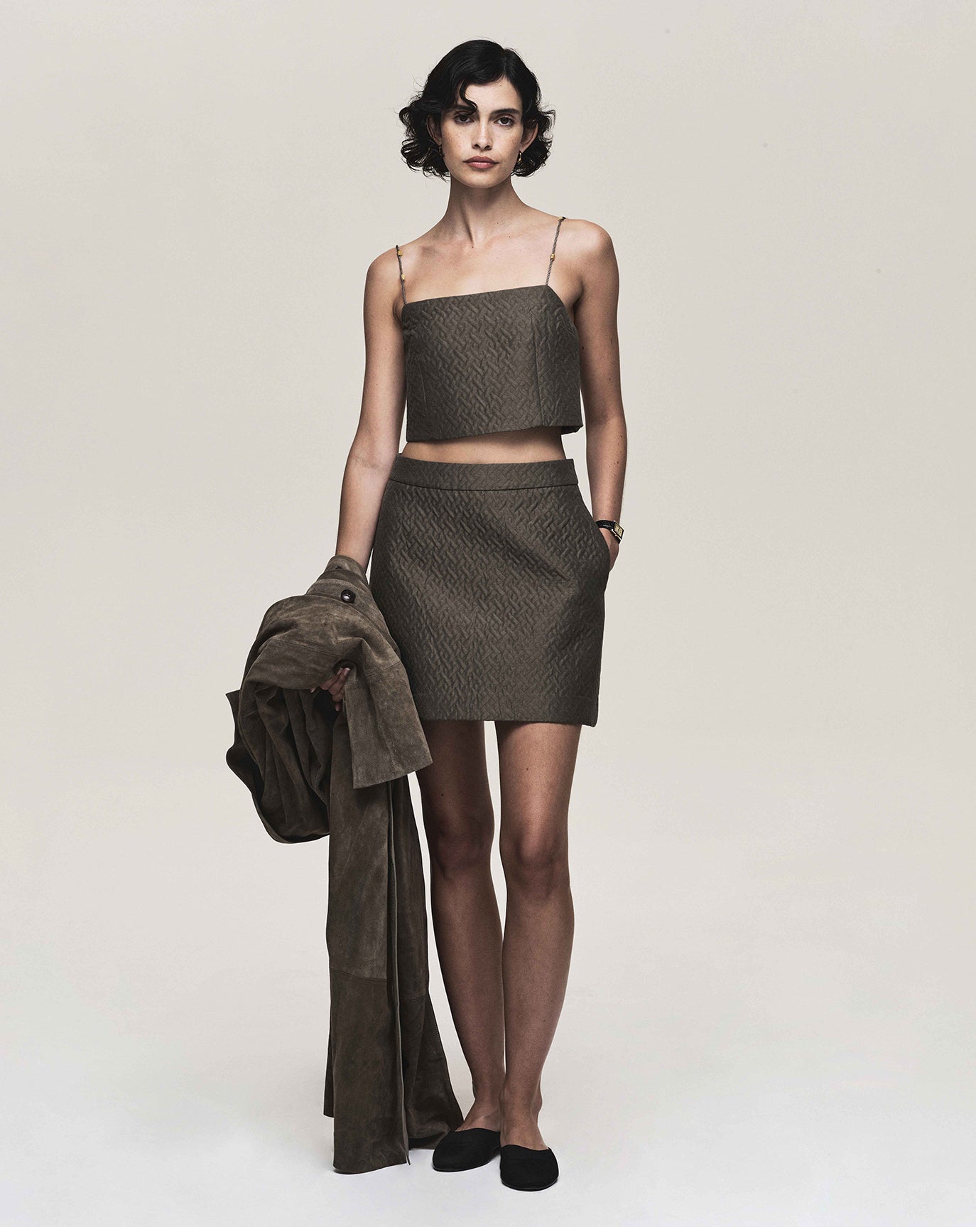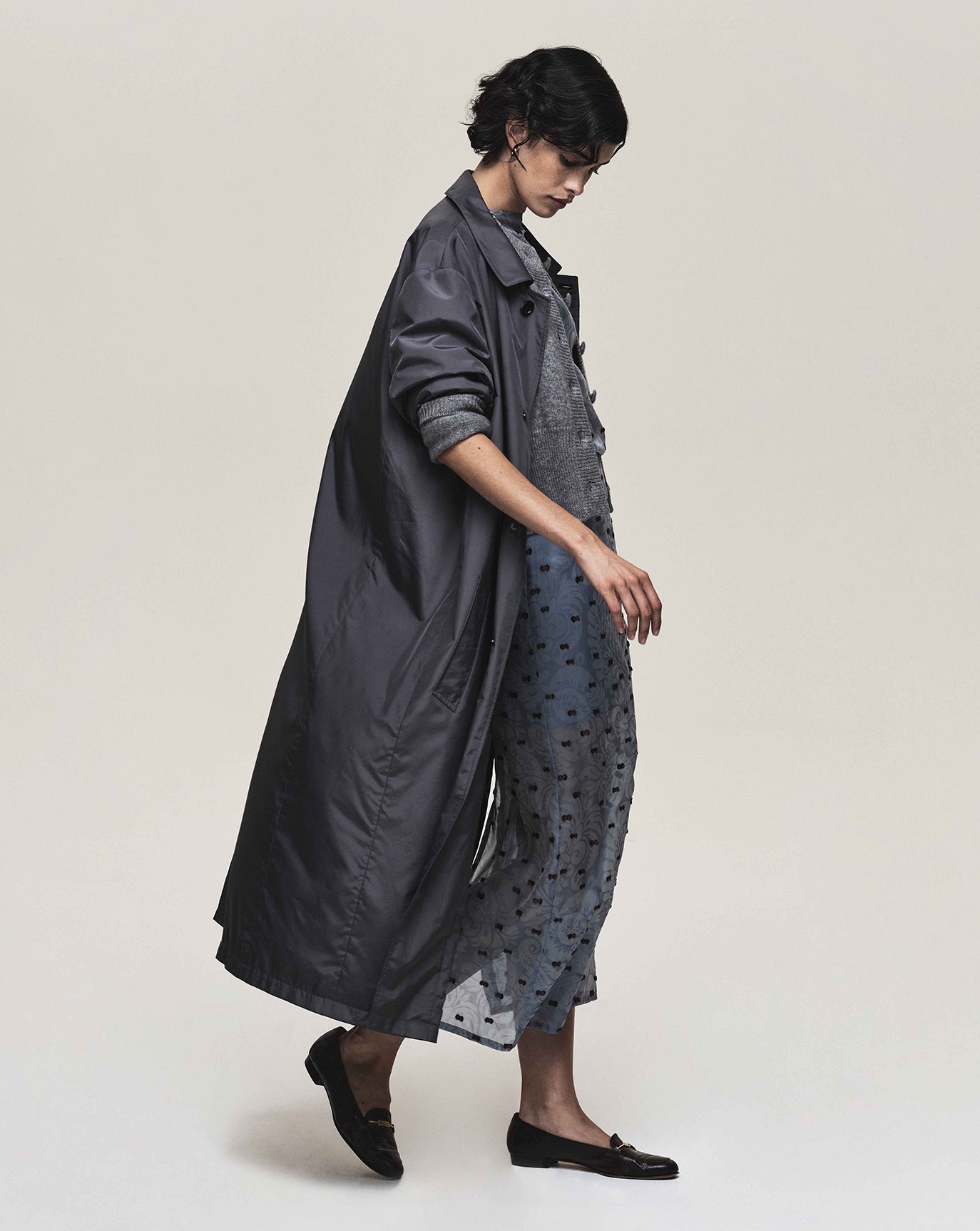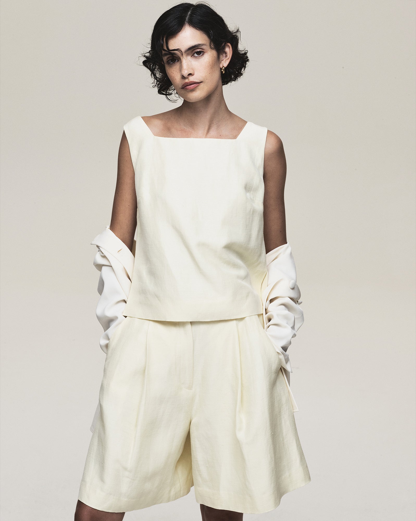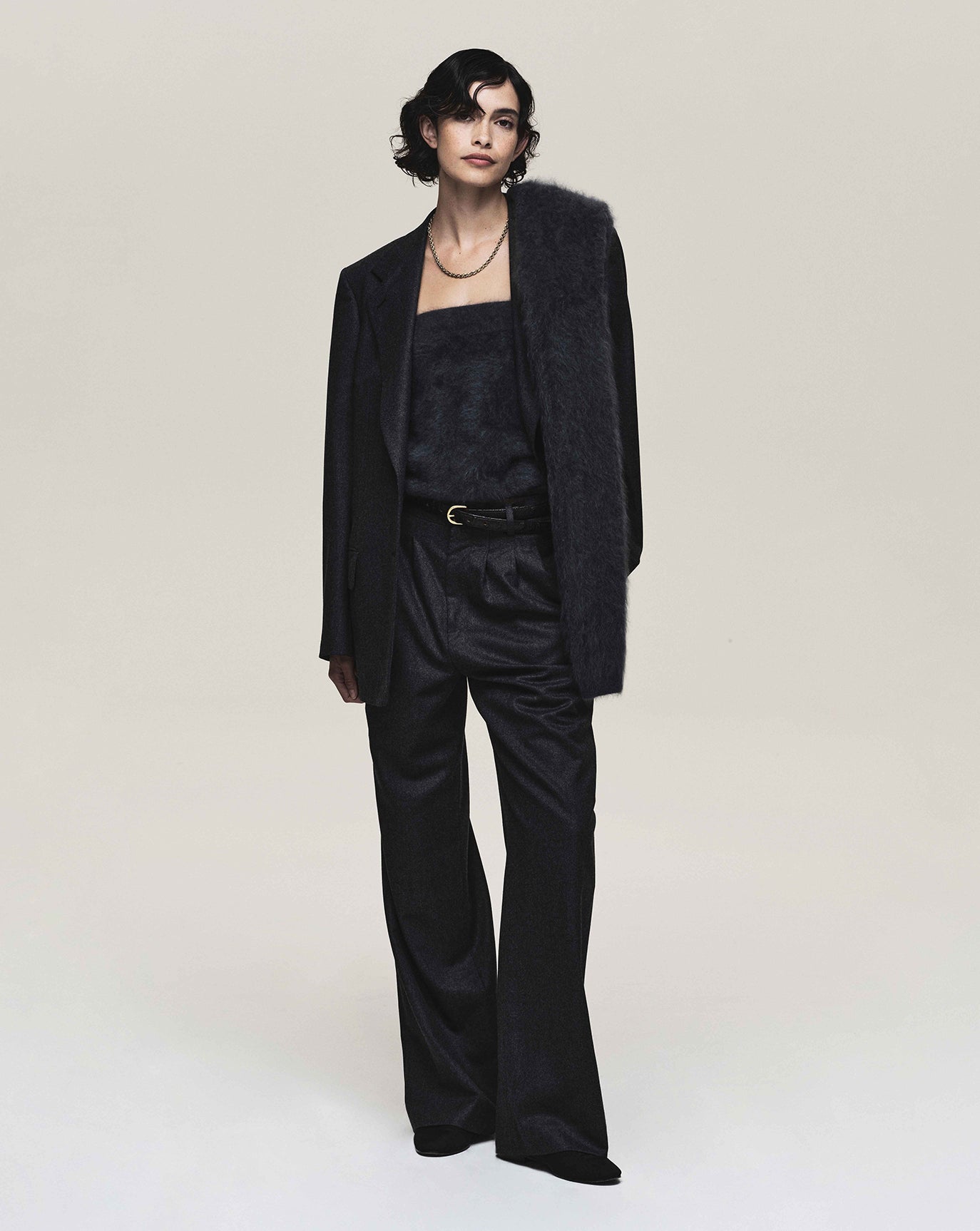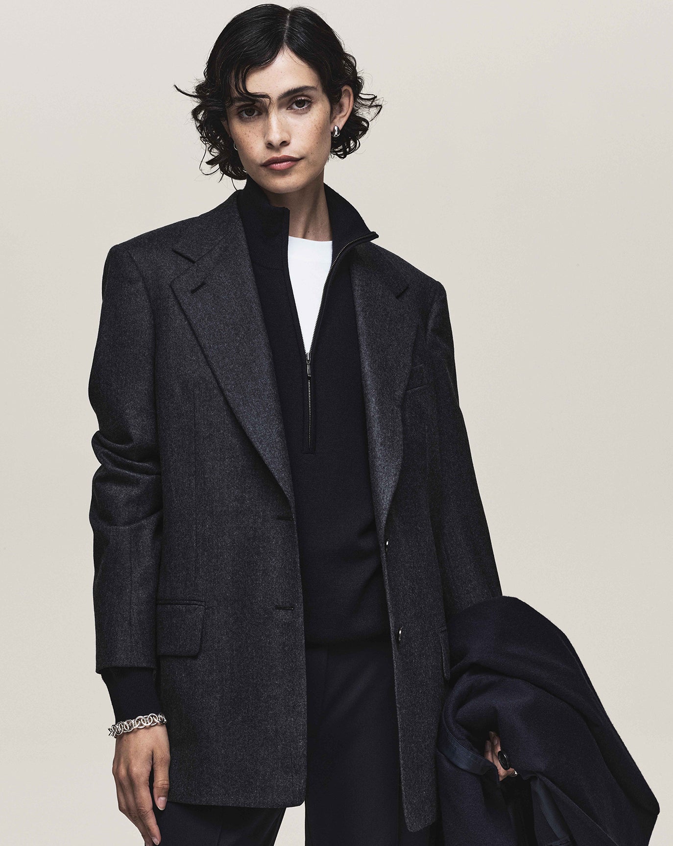We revisit the strength of the Ava jacket and triple pleat trouser, this time in a moody charcoal. We introduce the rather confident Lou trouser in off white, nubuck brown and dark grey.