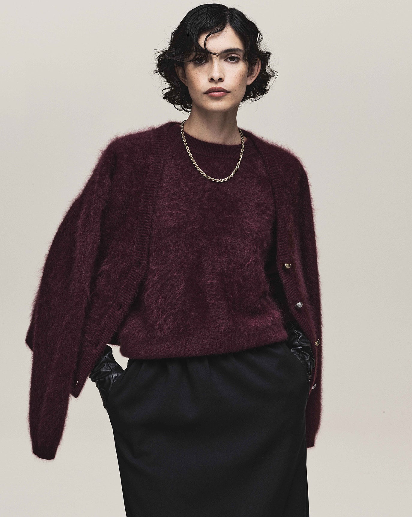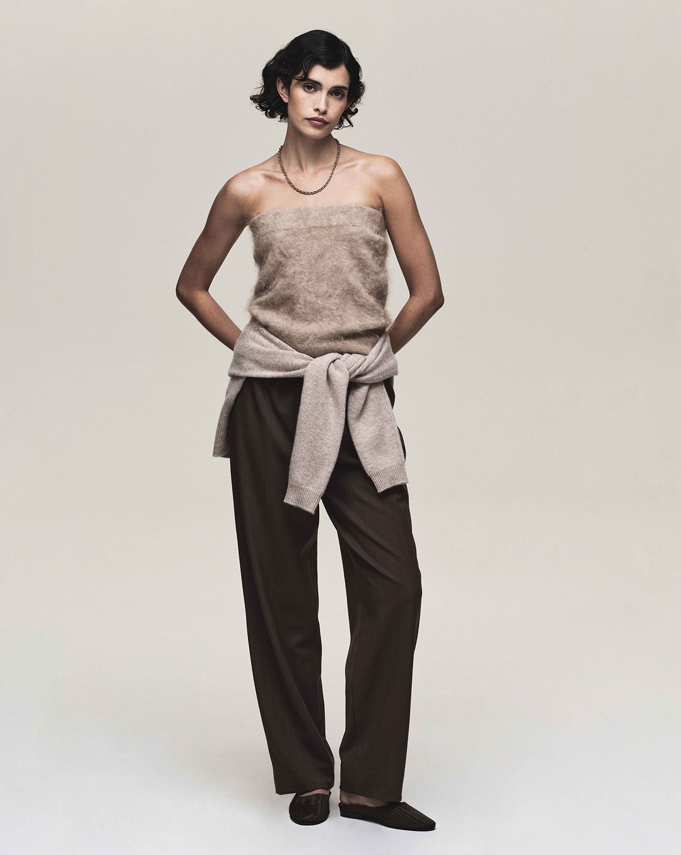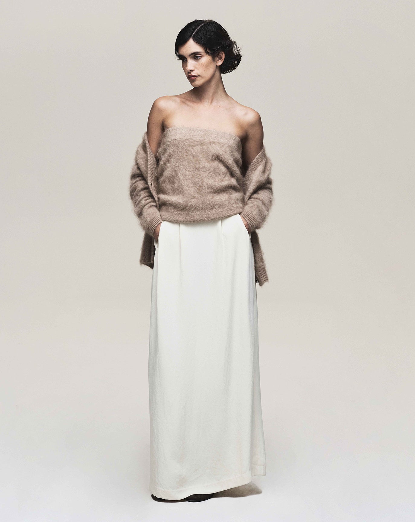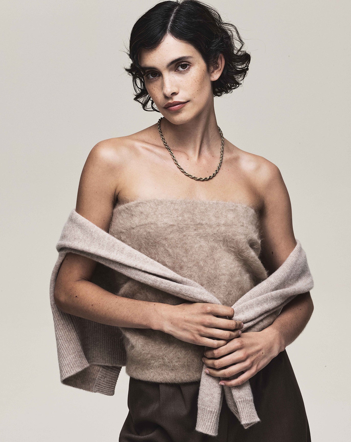 We sustain the sumptuous Emily cashmere cardigan, this time in chocolate, oat and grey melange and to the same effect we introduce the Claudia series - a cardigan, bandeau, and sweater in Bordeaux, taupe and charcoal. For evening knitwear there is the superb and vanishing off-shoulder Coralie dress in black.