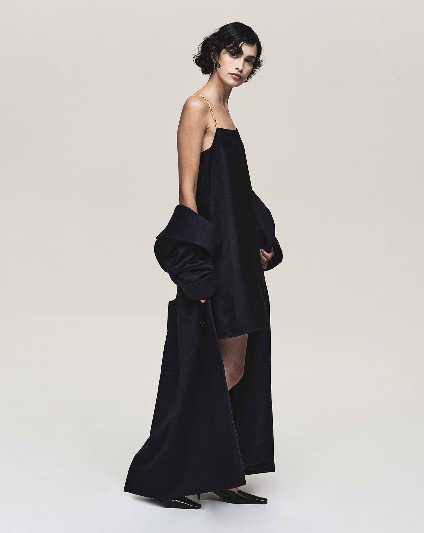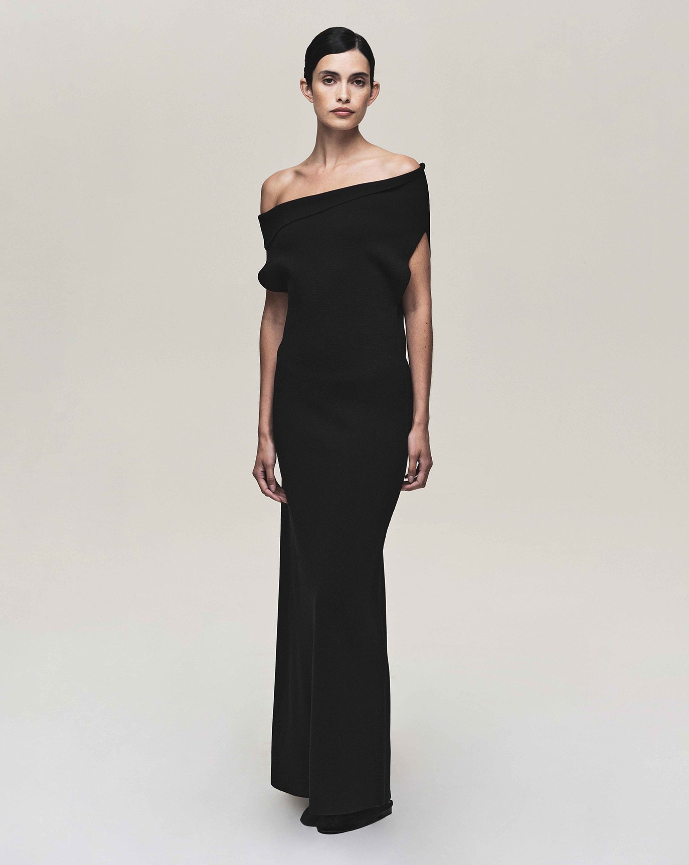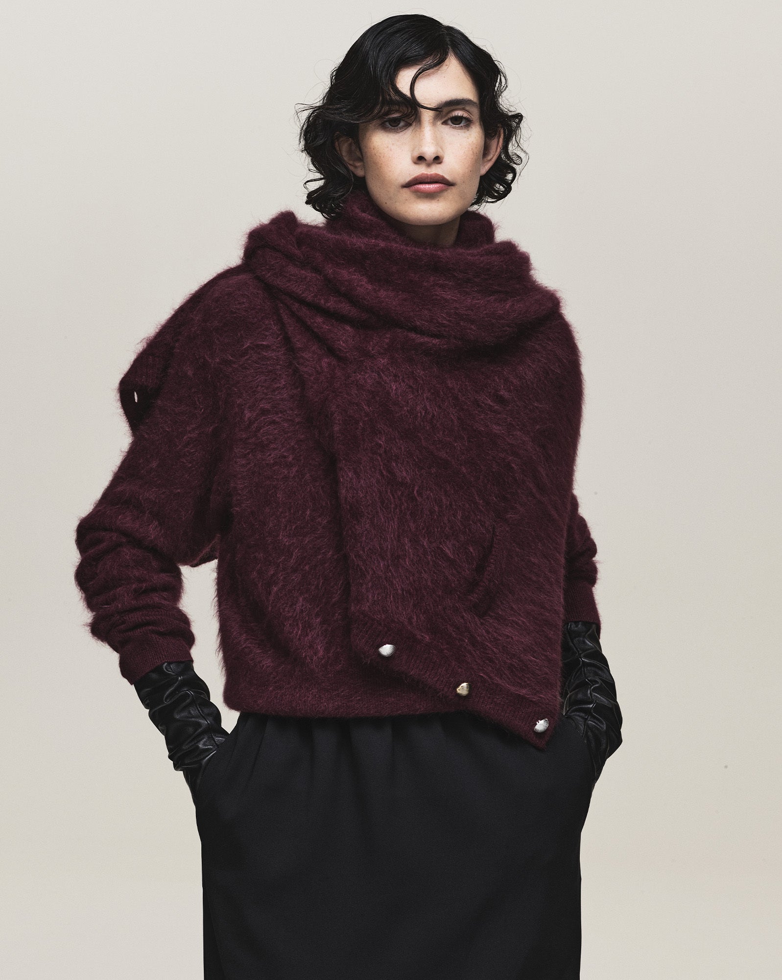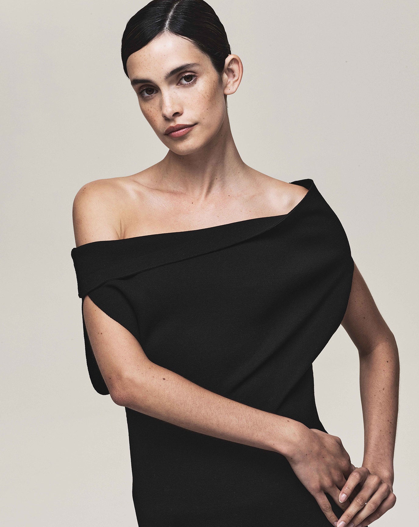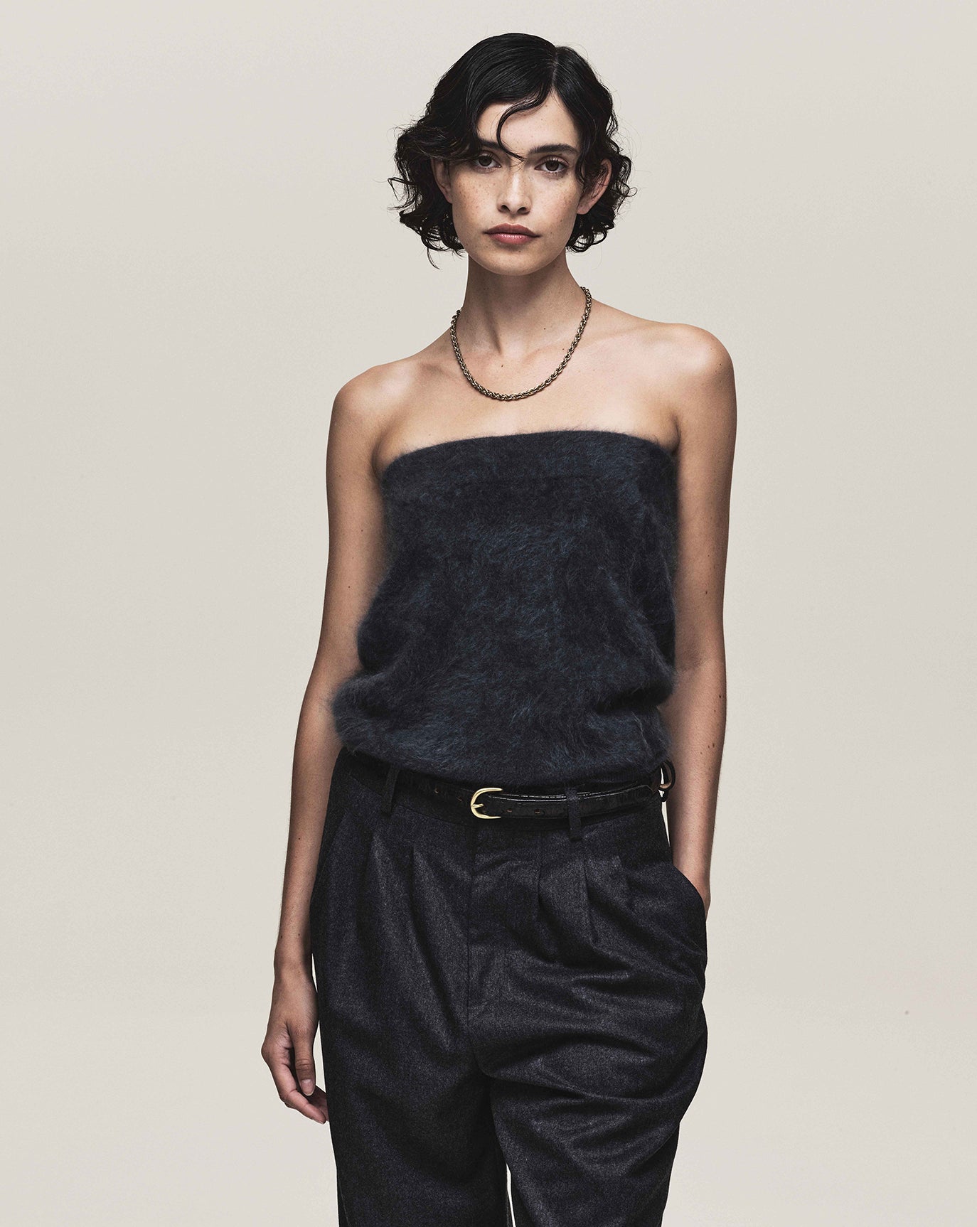 We sustain the sumptuous Emily cashmere cardigan, this time in chocolate, oat and grey melange and to the same effect we introduce the Claudia series - a cardigan, bandeau, and sweater in Bordeaux, taupe and charcoal. For evening knitwear there is the superb and vanishing off-shoulder Coralie dress in black.