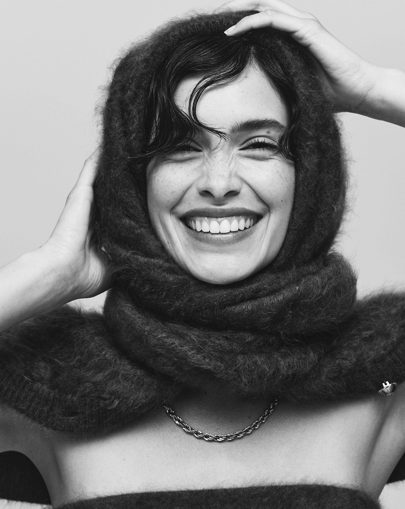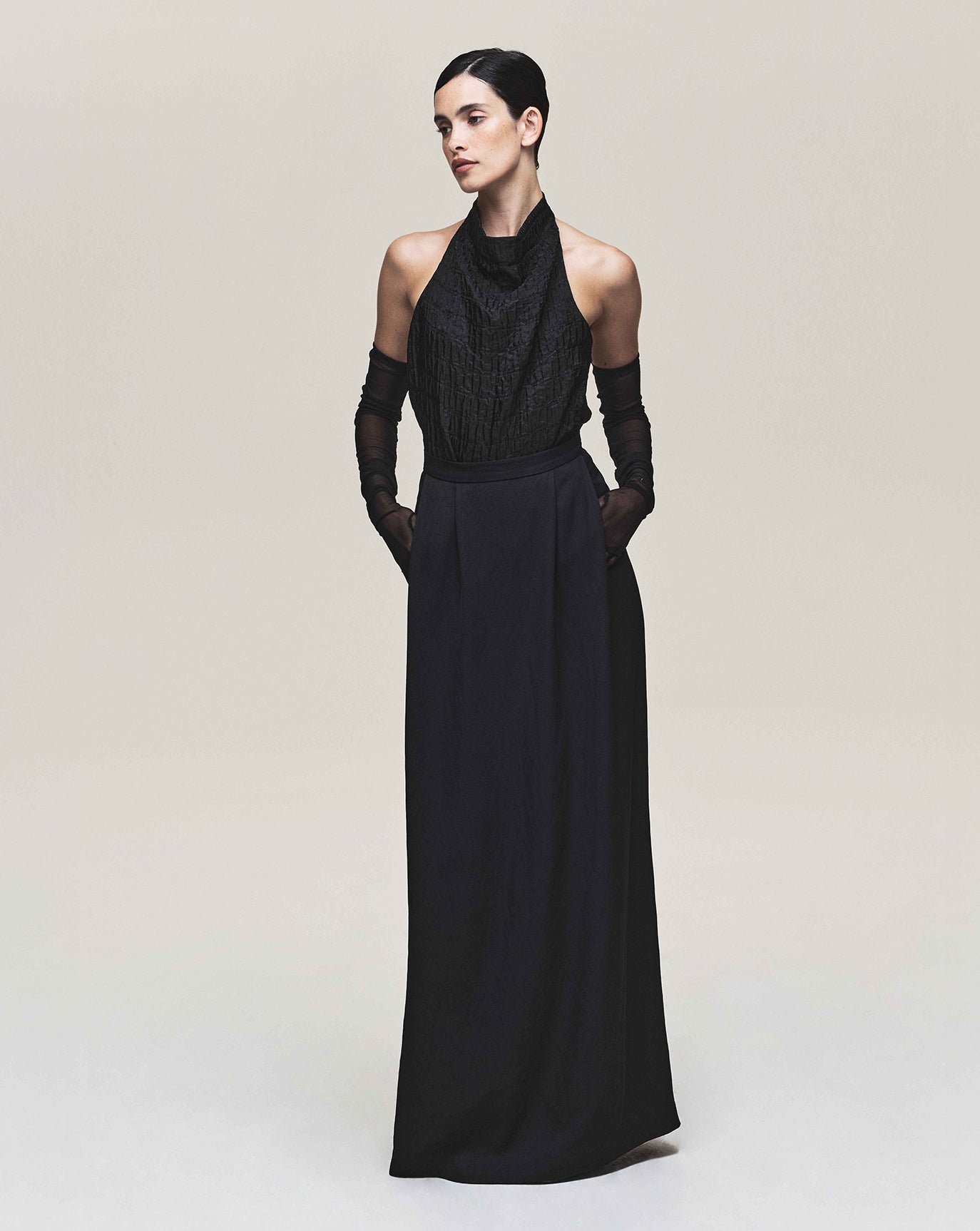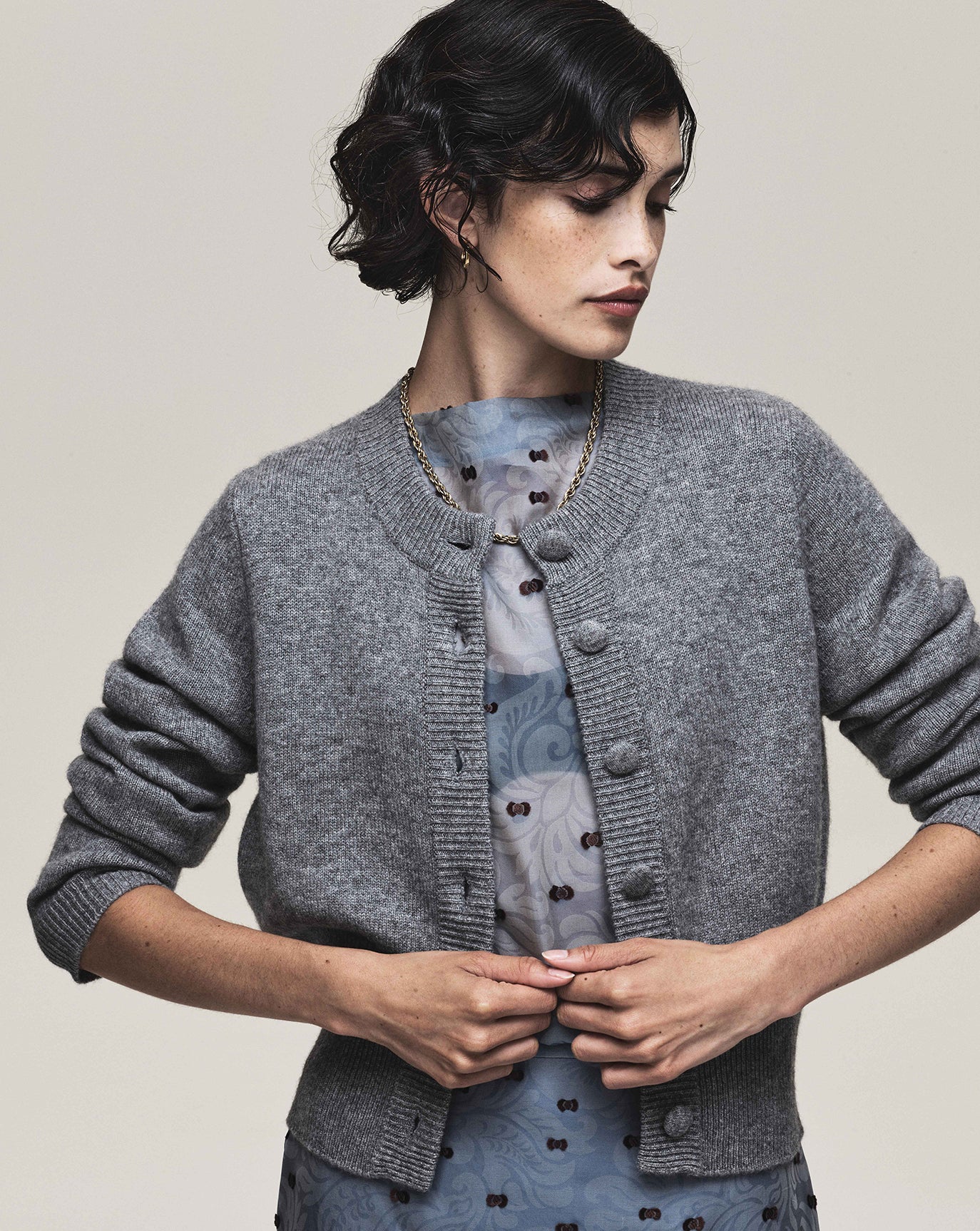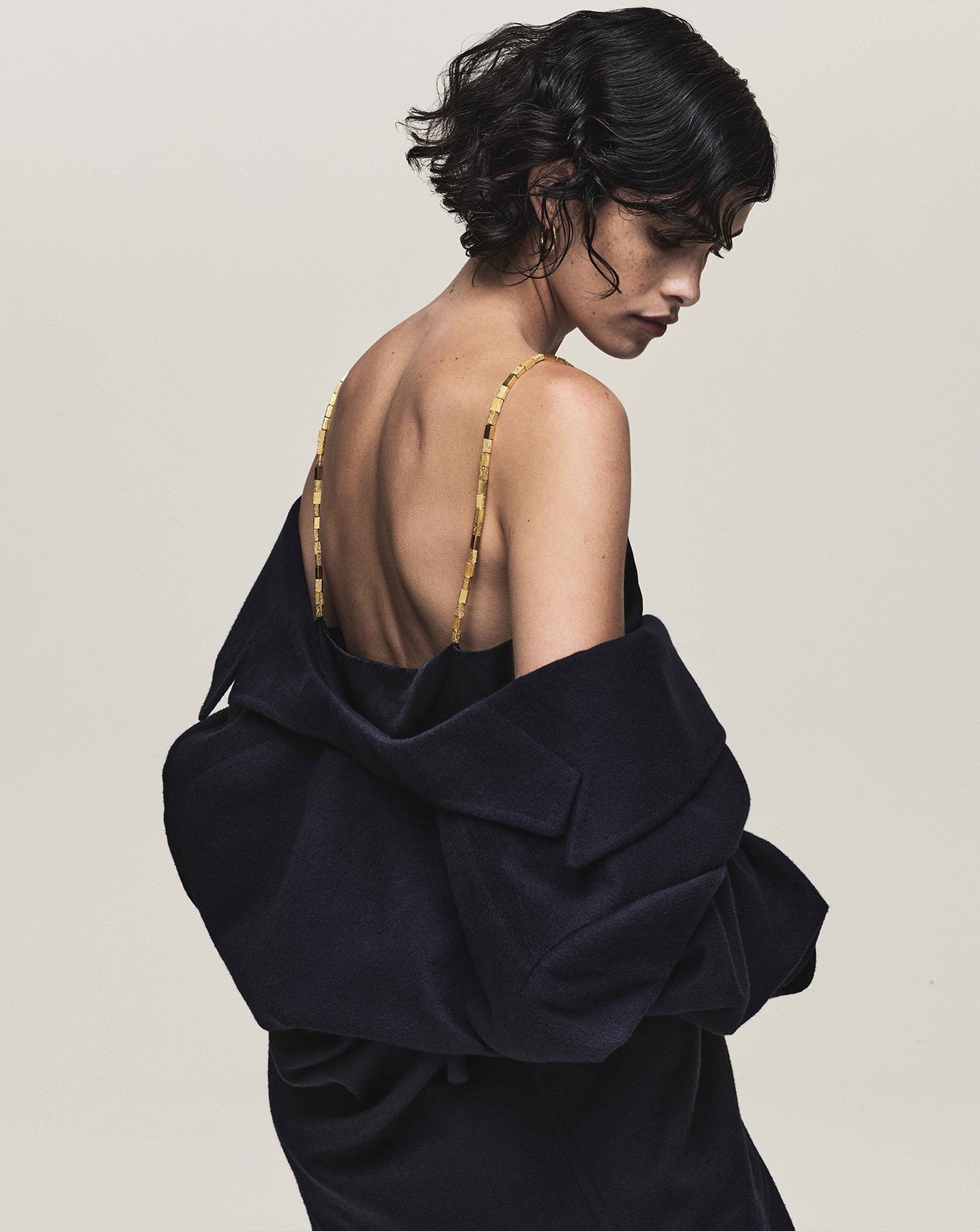 We sustain the sumptuous Emily cashmere cardigan, this time in chocolate, oat and grey melange and to the same effect we introduce the Claudia series - a cardigan, bandeau, and sweater in Bordeaux, taupe and charcoal. For evening knitwear there is the superb and vanishing off-shoulder Coralie dress in black.