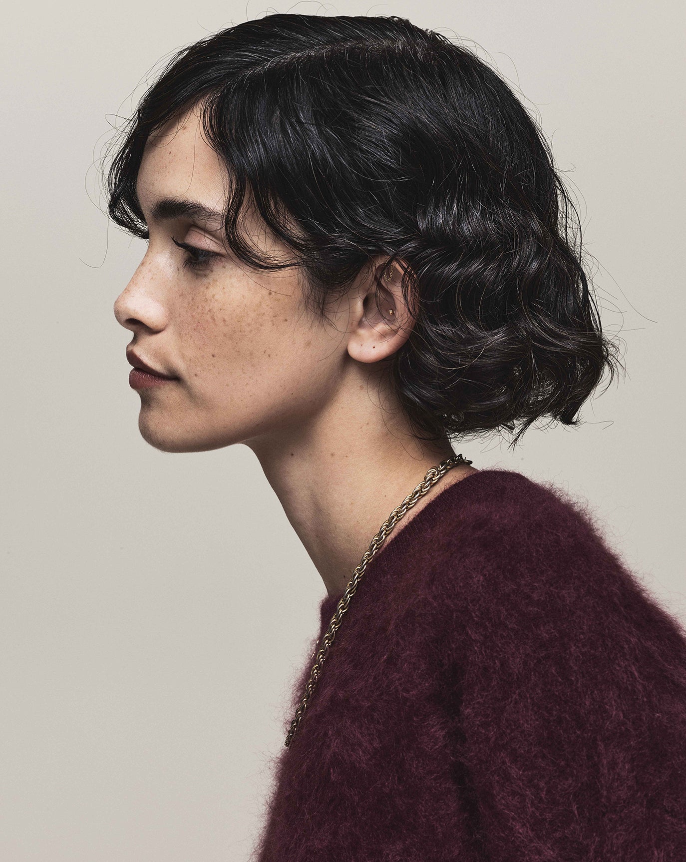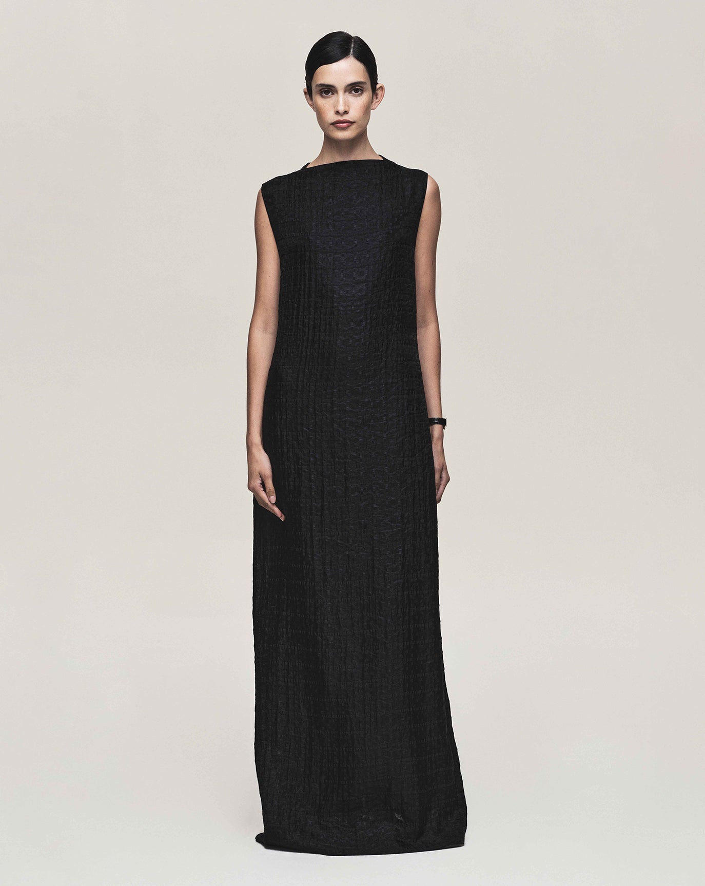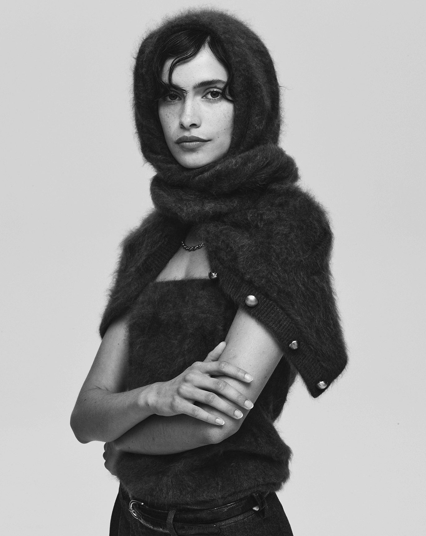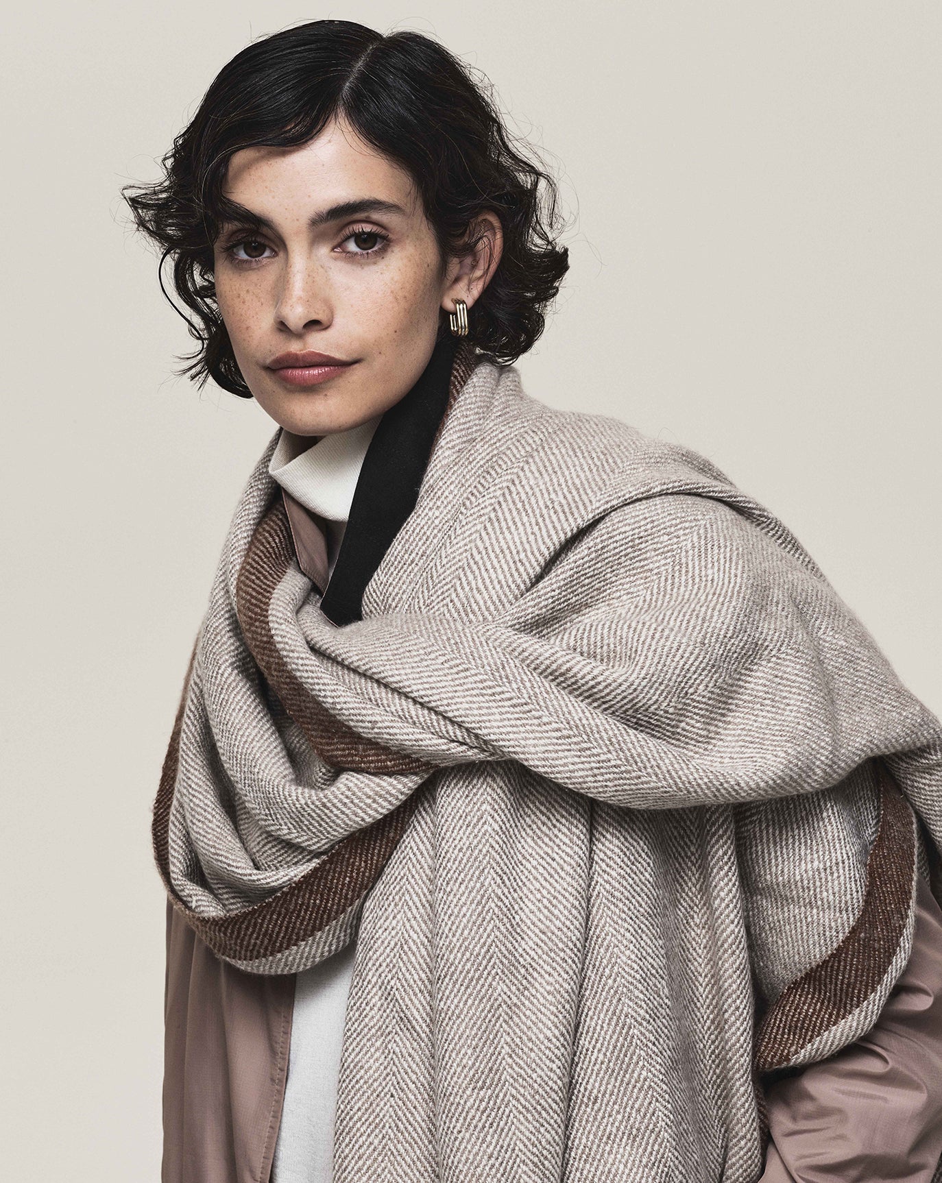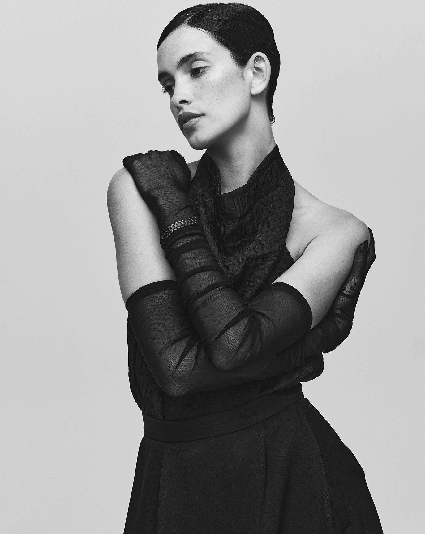 We sustain the sumptuous Emily cashmere cardigan, this time in chocolate, oat and grey melange and to the same effect we introduce the Claudia series - a cardigan, bandeau, and sweater in Bordeaux, taupe and charcoal. For evening knitwear there is the superb and vanishing off-shoulder Coralie dress in black.