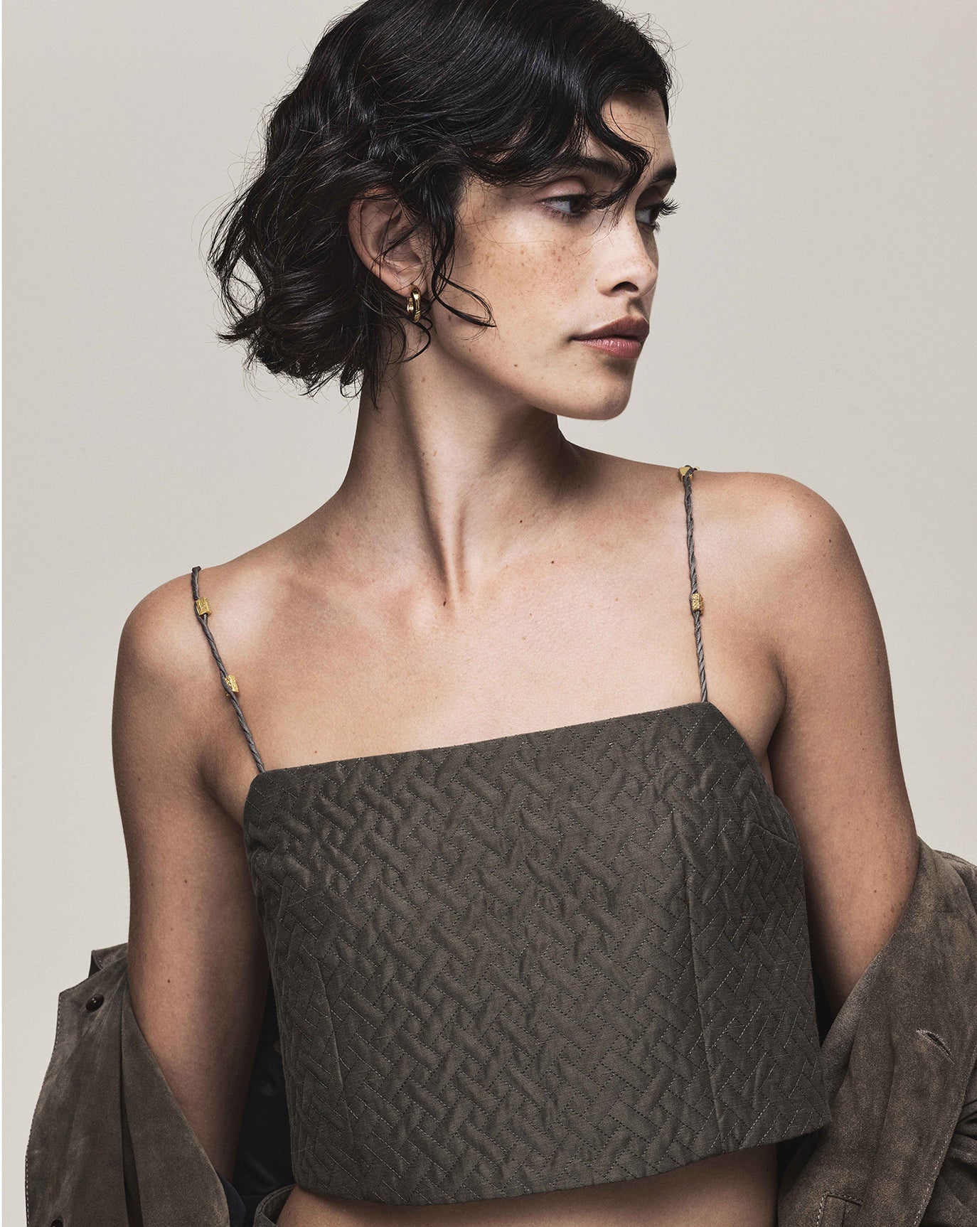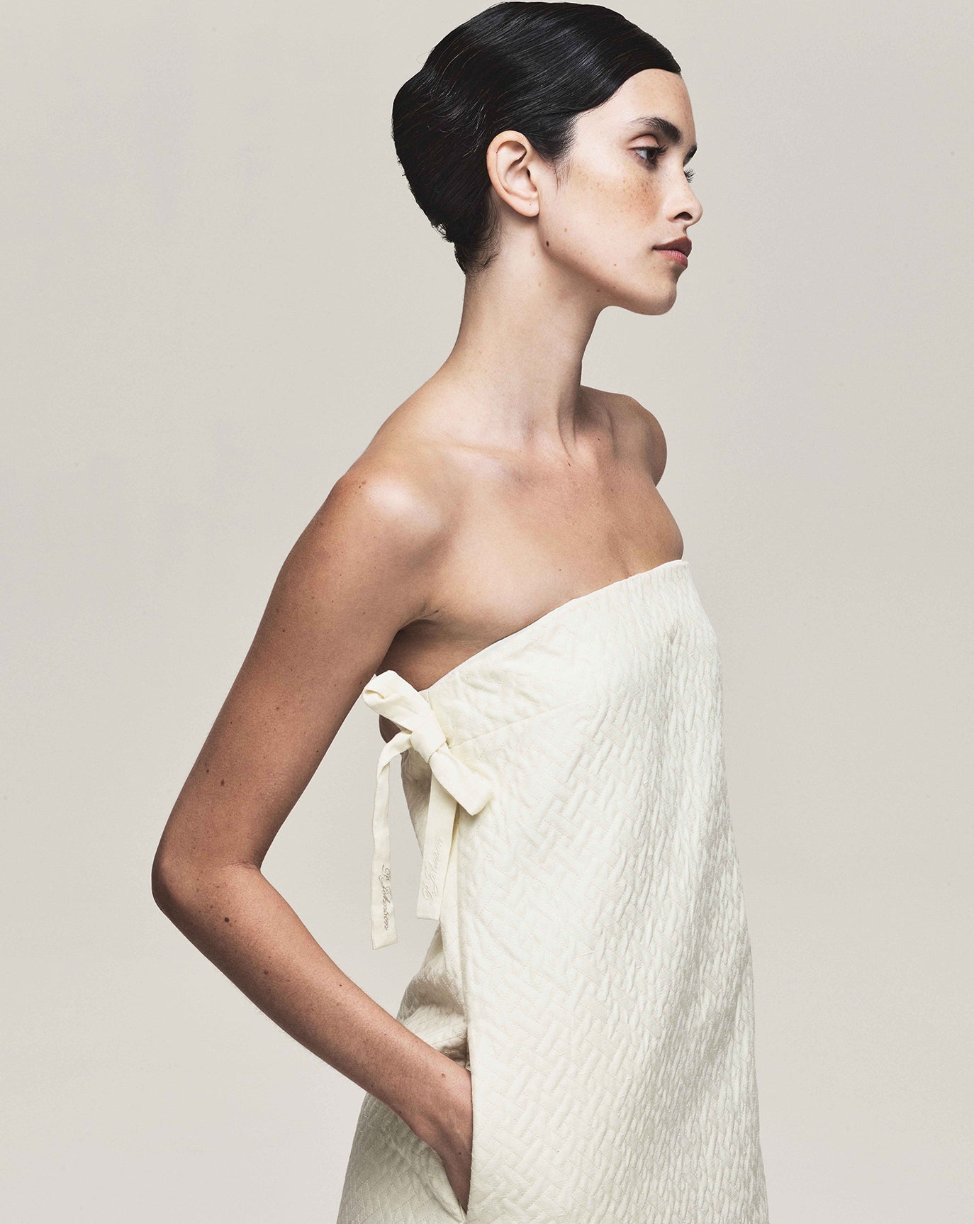 Formal, quilted pieces with an antique timbre and glass beading. A strapless gown, a crop and matching mini.