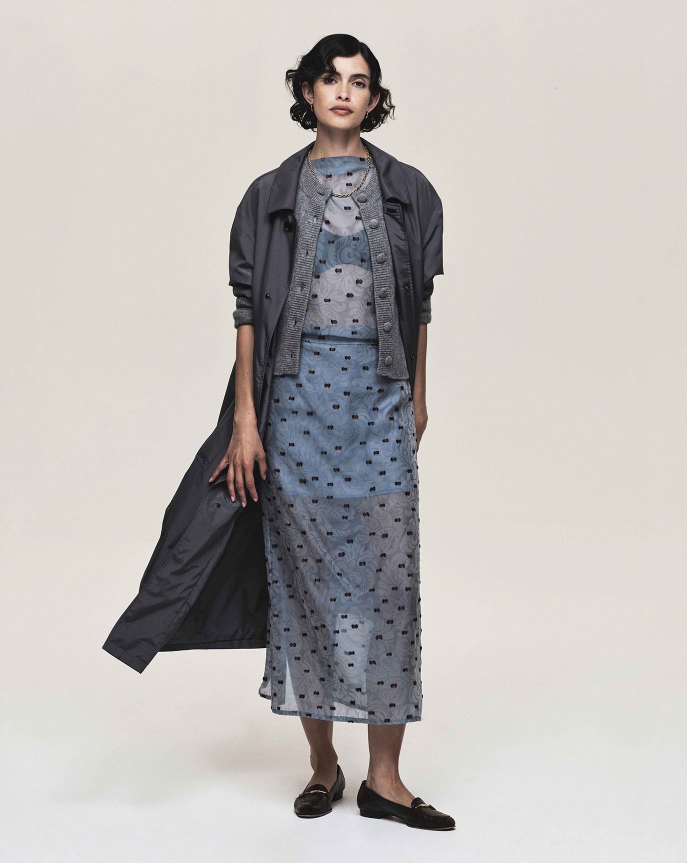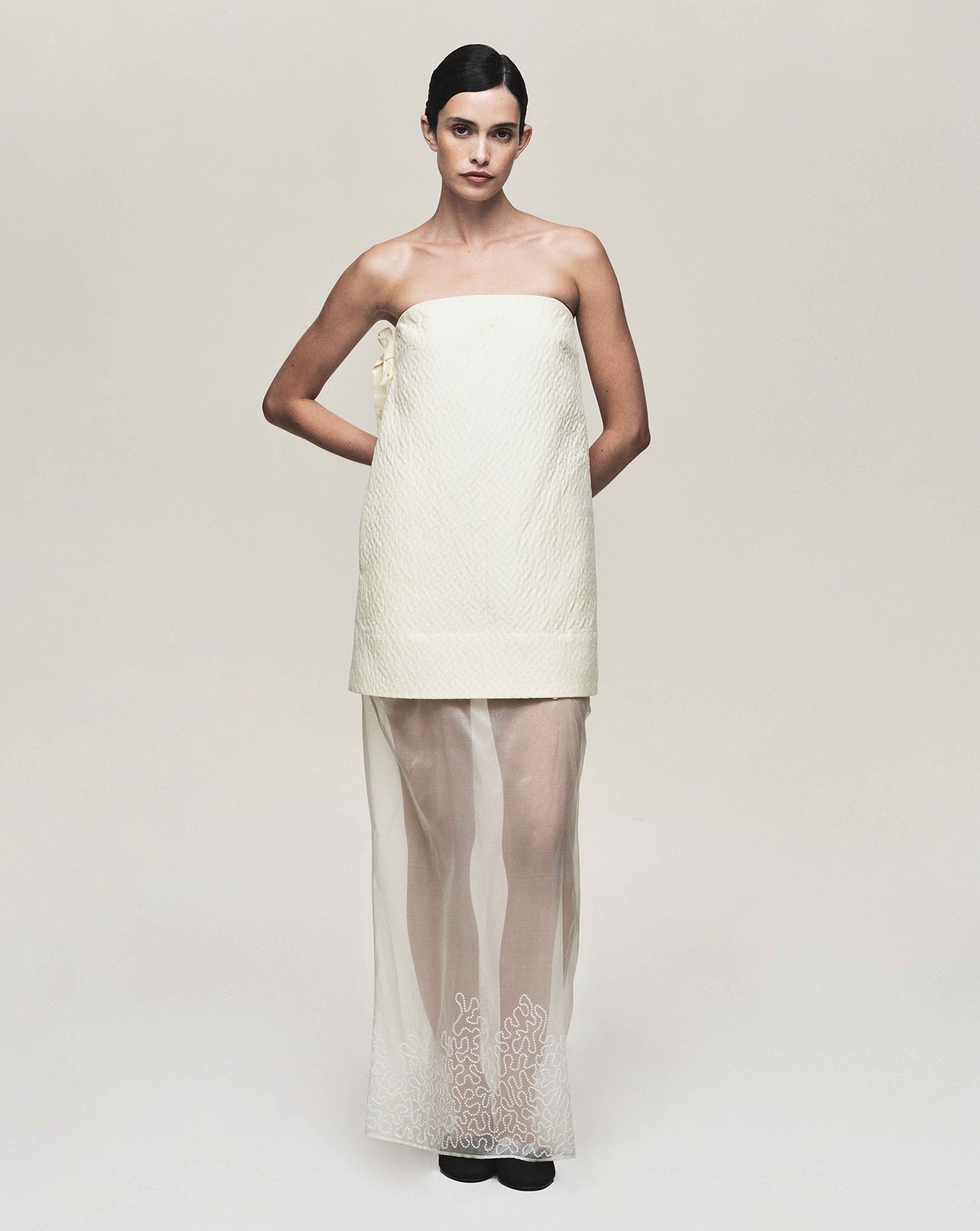 Exquisitely limpid Italian silk with embroidered and tufted ornaments - a limited proprietary fabric developed exclusively for this garment series including a shift, a midi skirt, and a vented tunic top.