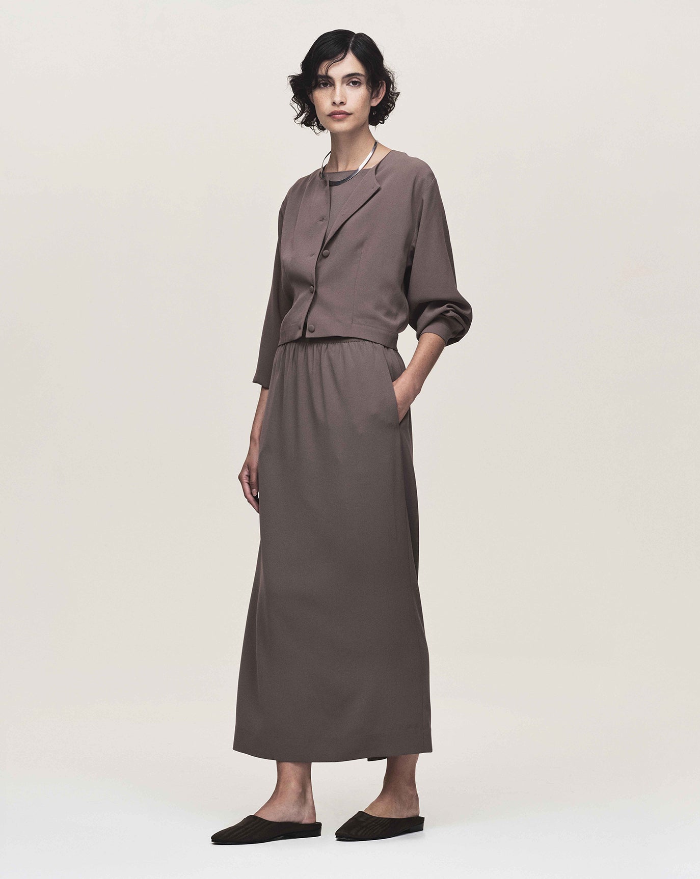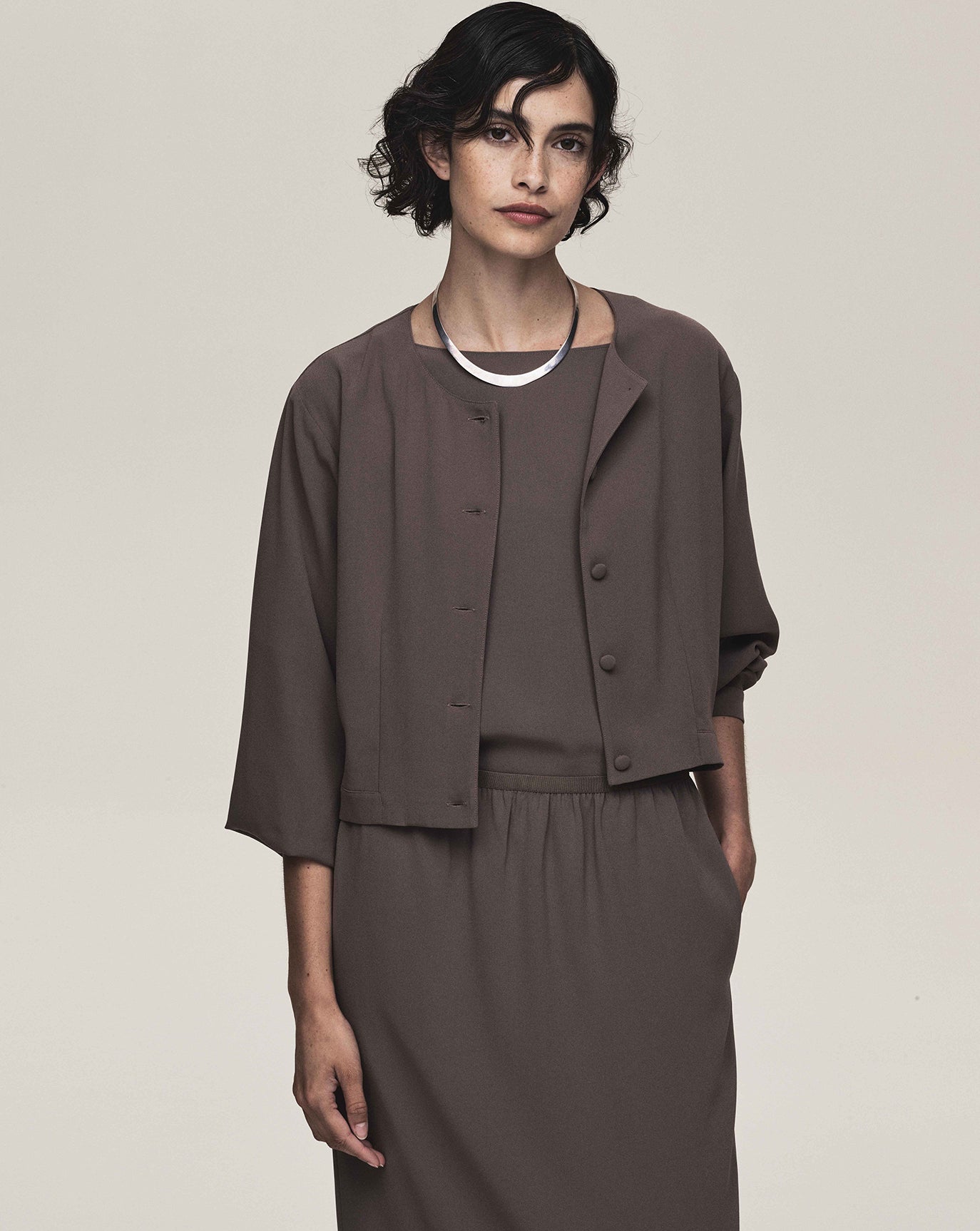 The freshest crepe-touch blouse. Light and crisp with sensual movement. In black and taupe.