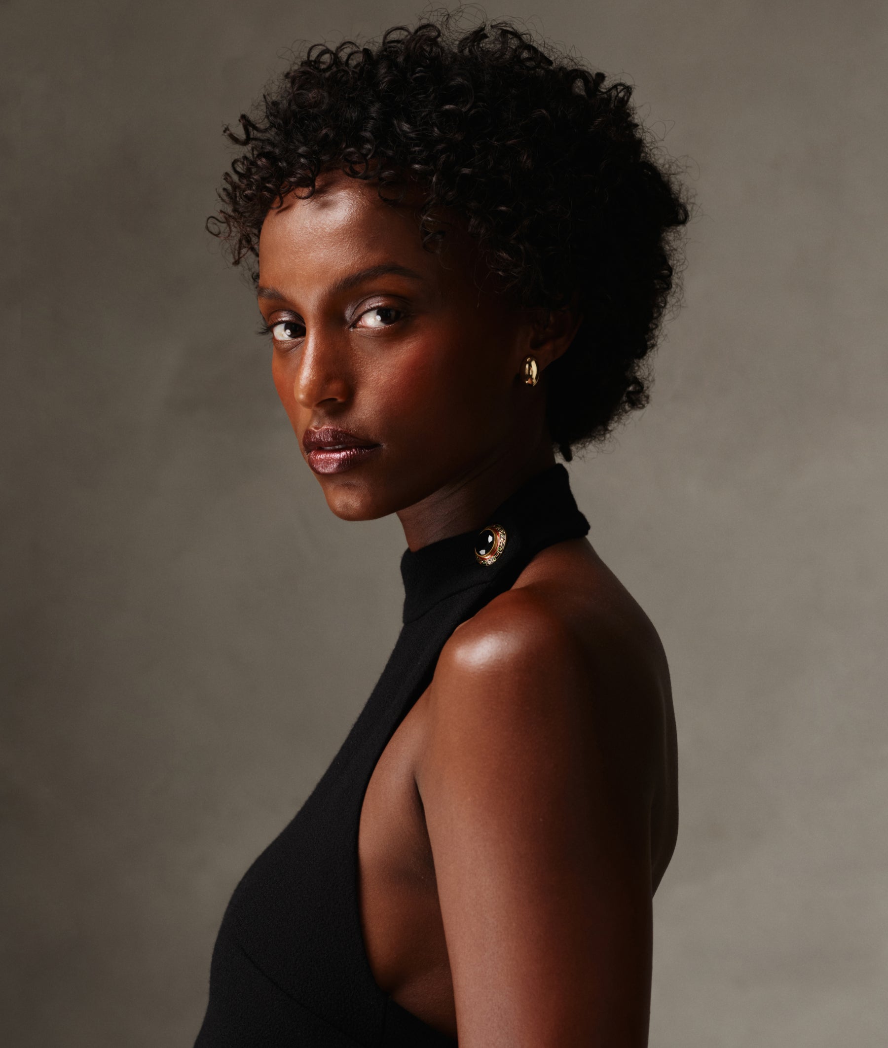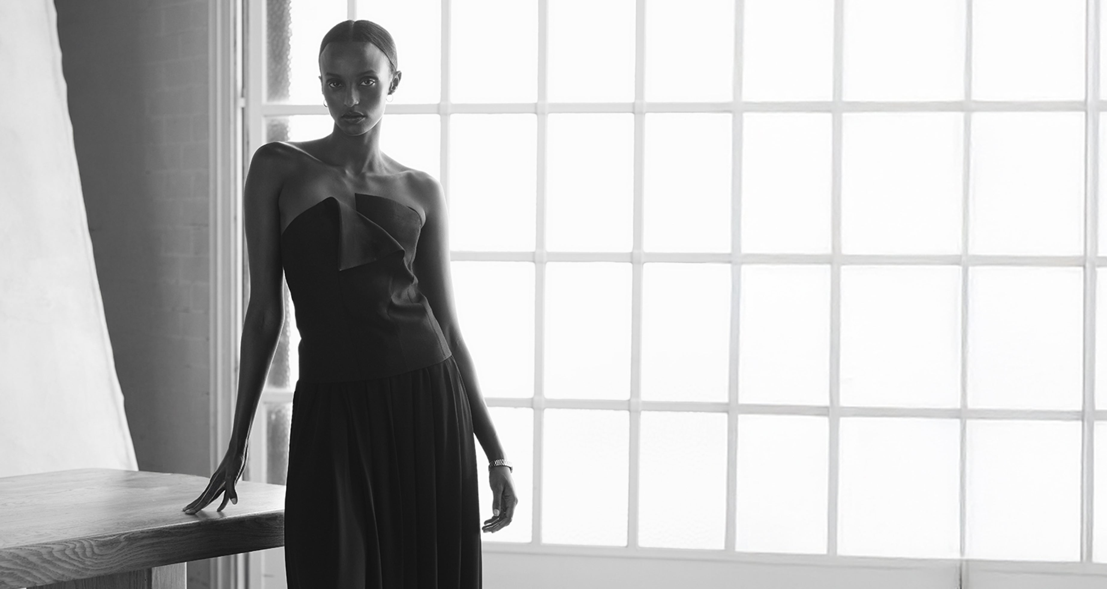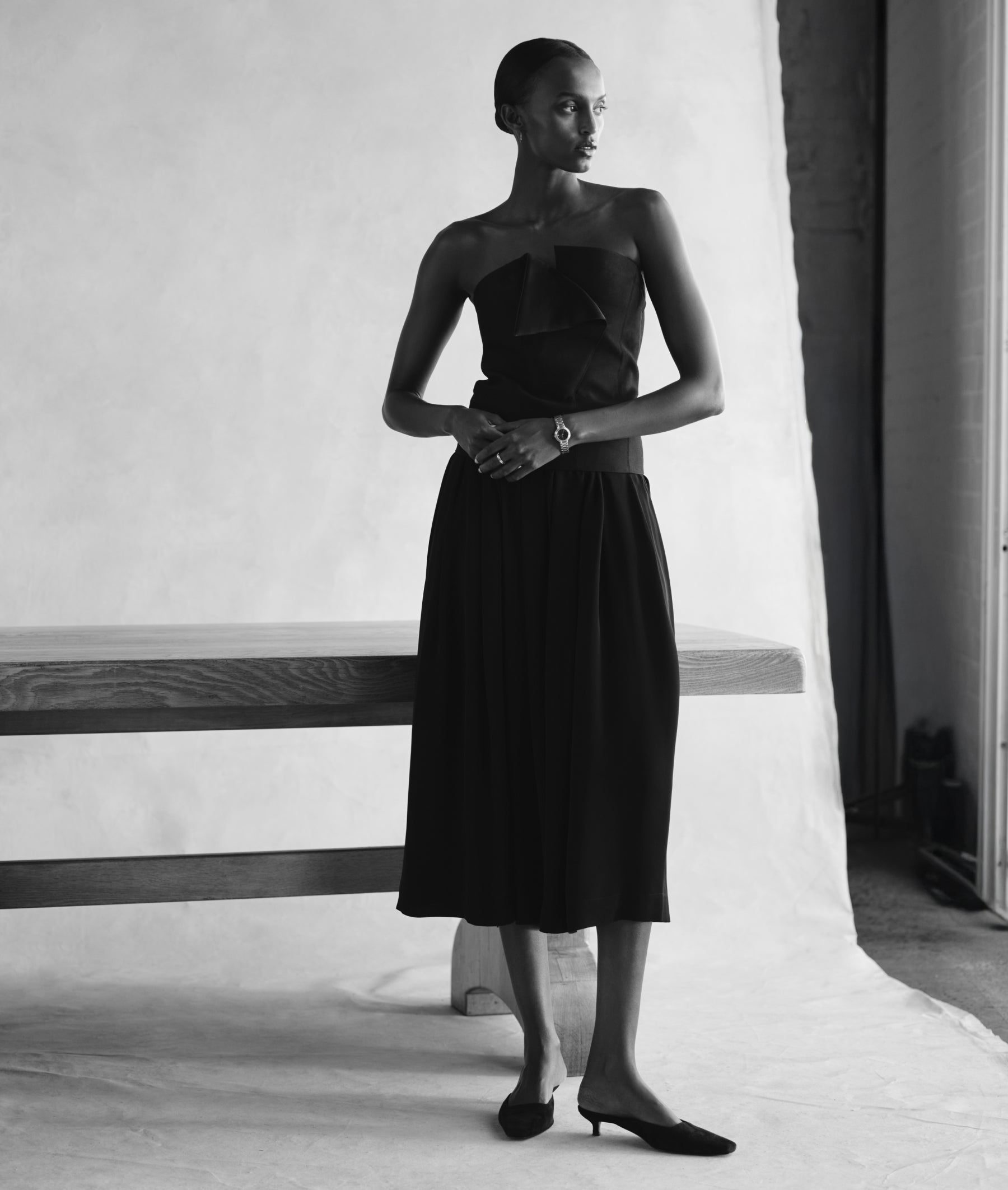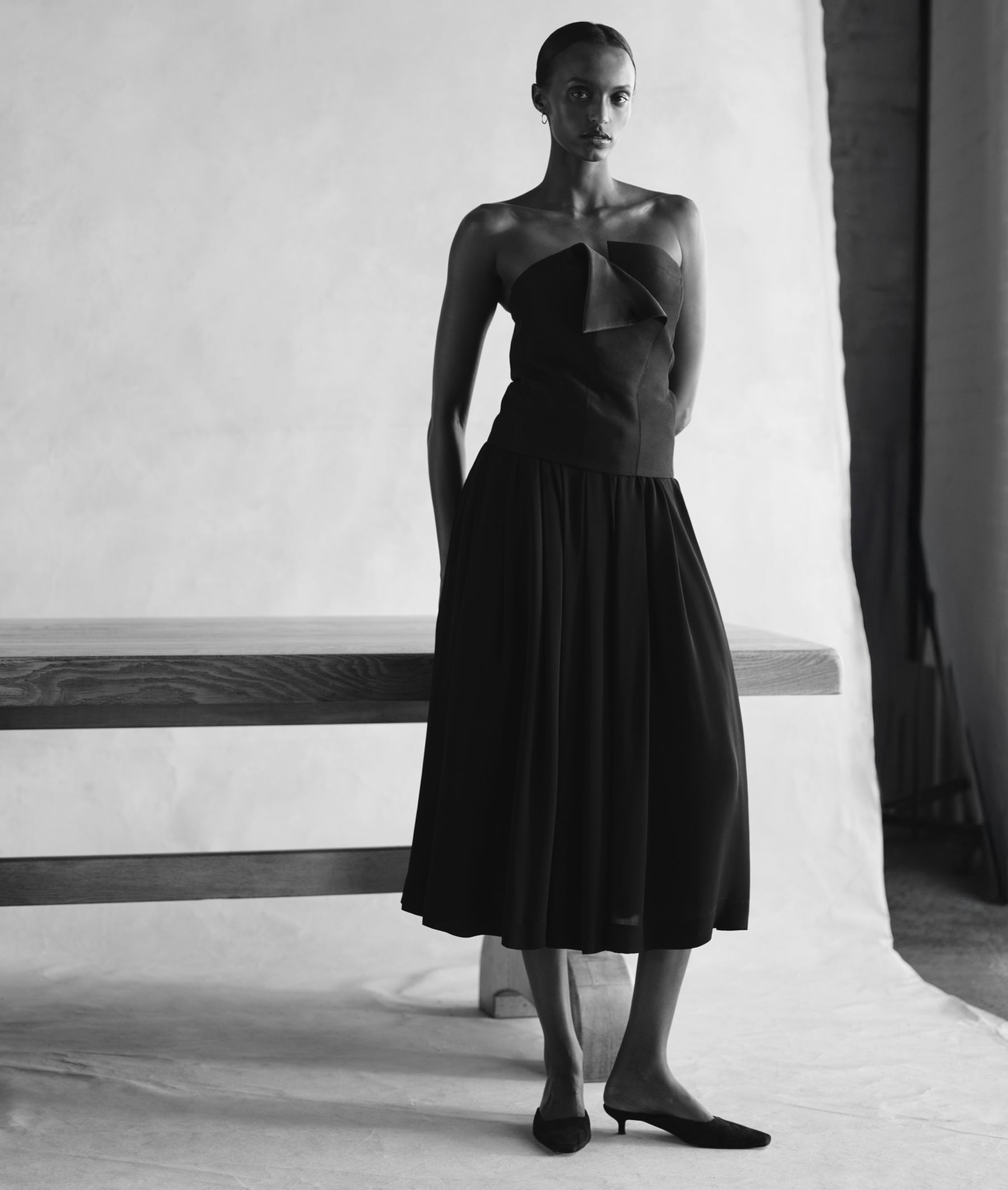Heading deeper into the more formal event space is the Stella bustier and Stella gown, in black, naturally. They are boned, corseted garments with a sharp raso silk turn back detail on the front and a subtle and charming passementerie closure detail. Strident and powerful with a vintage undertone.