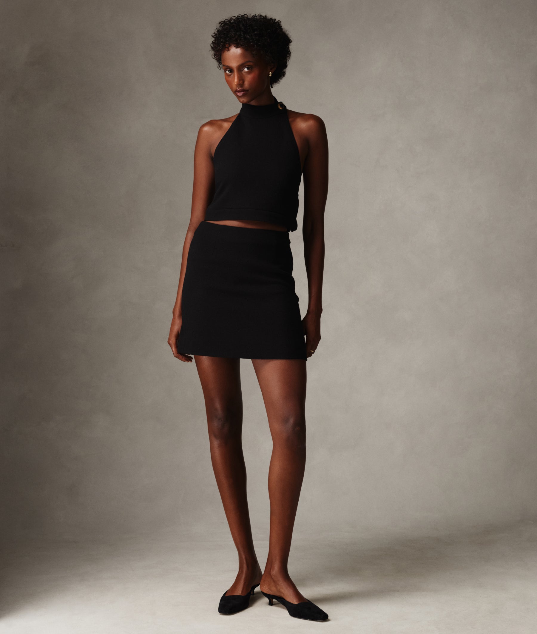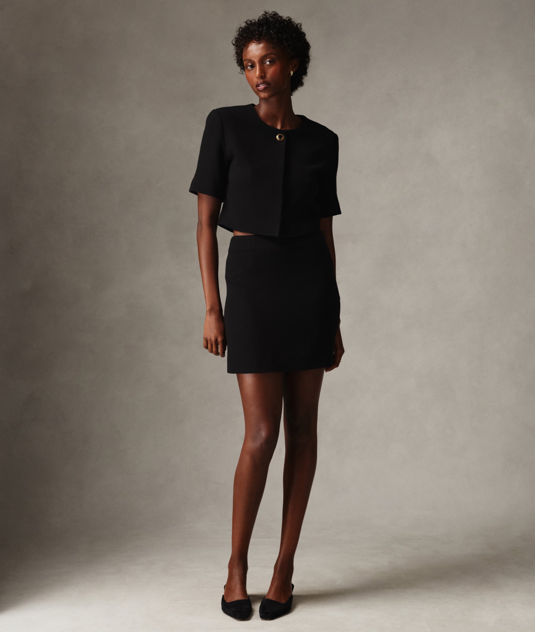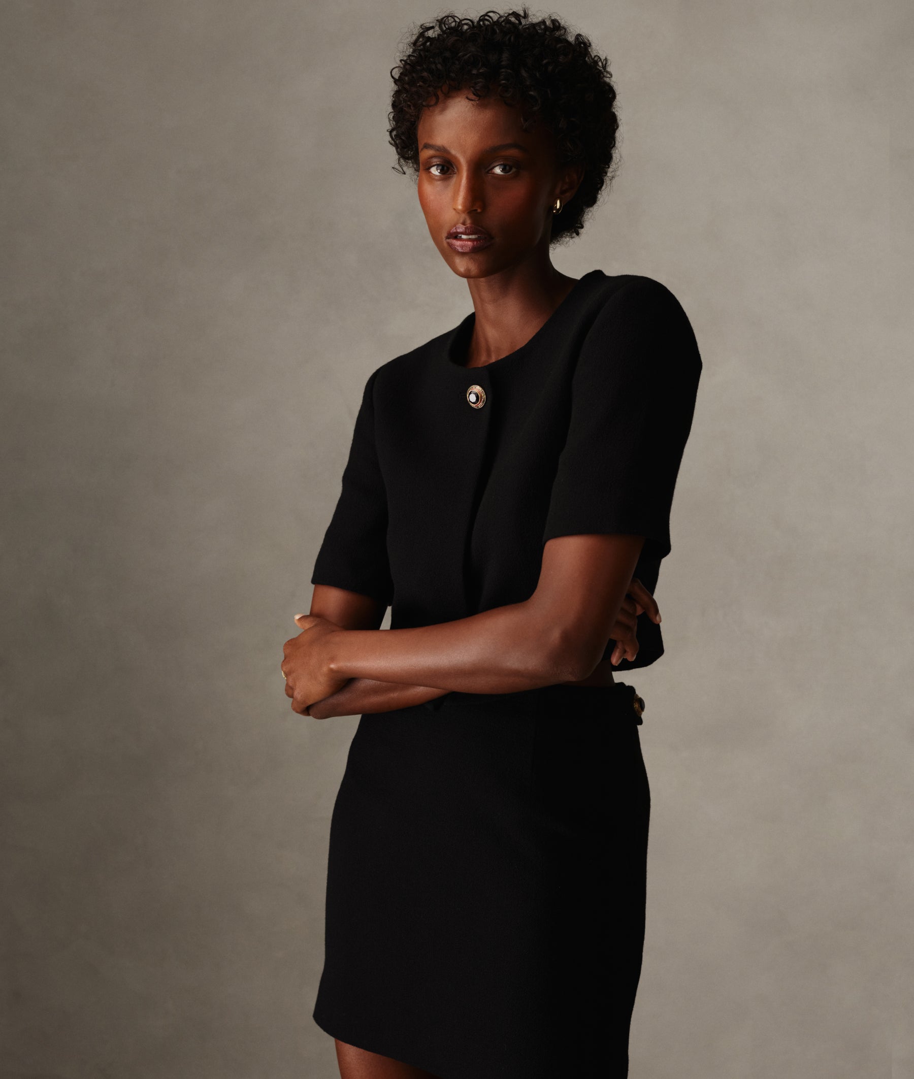 In sets we have the cropped Flo jacket and mini wrap skirt which is made in the dustiest of sage green linen blends with an intriguing rope ton-sur-ton embroidery in a lozenge pattern. Then there is the Gabrielle cropped and short-sleeved jacket and matching mini in a pure wool from Italy. Both top and skirt feature a 22 carat gold plated feature button emblazoned with hand-enamelled detailing. Or substitute in the Gabrielle backless halter neck style crop with the same feature button on the neck.