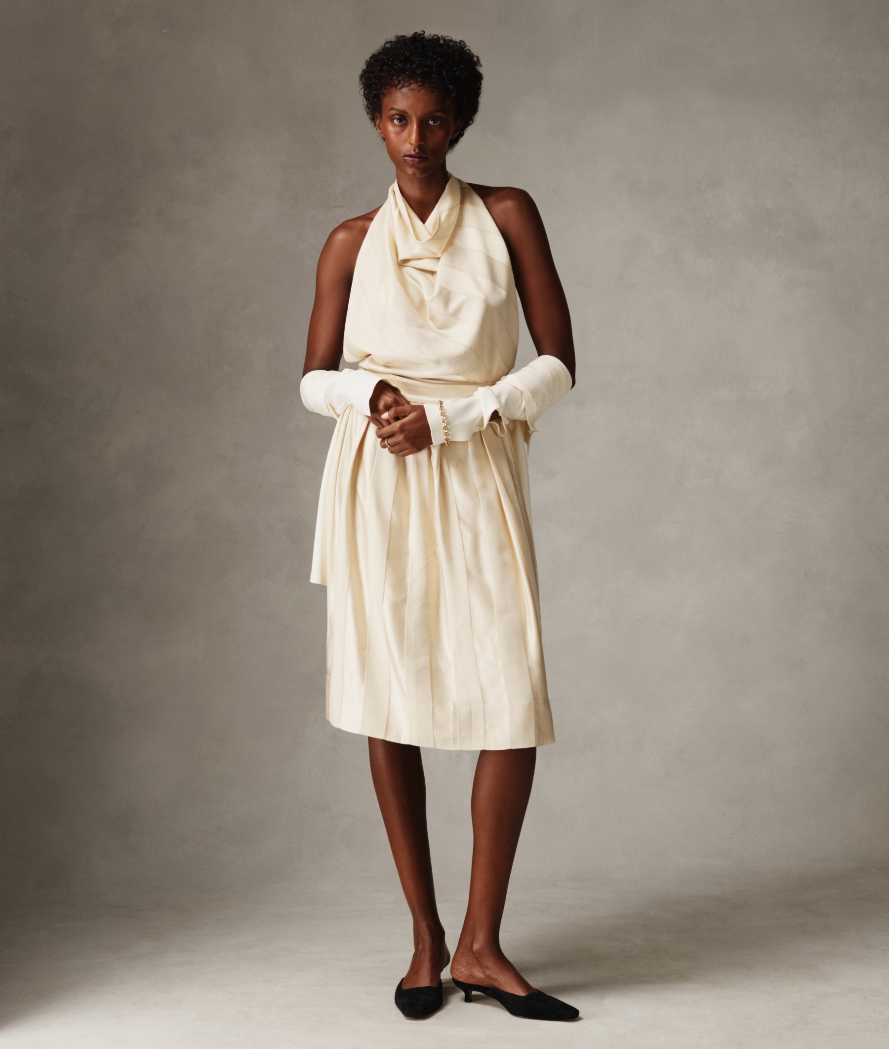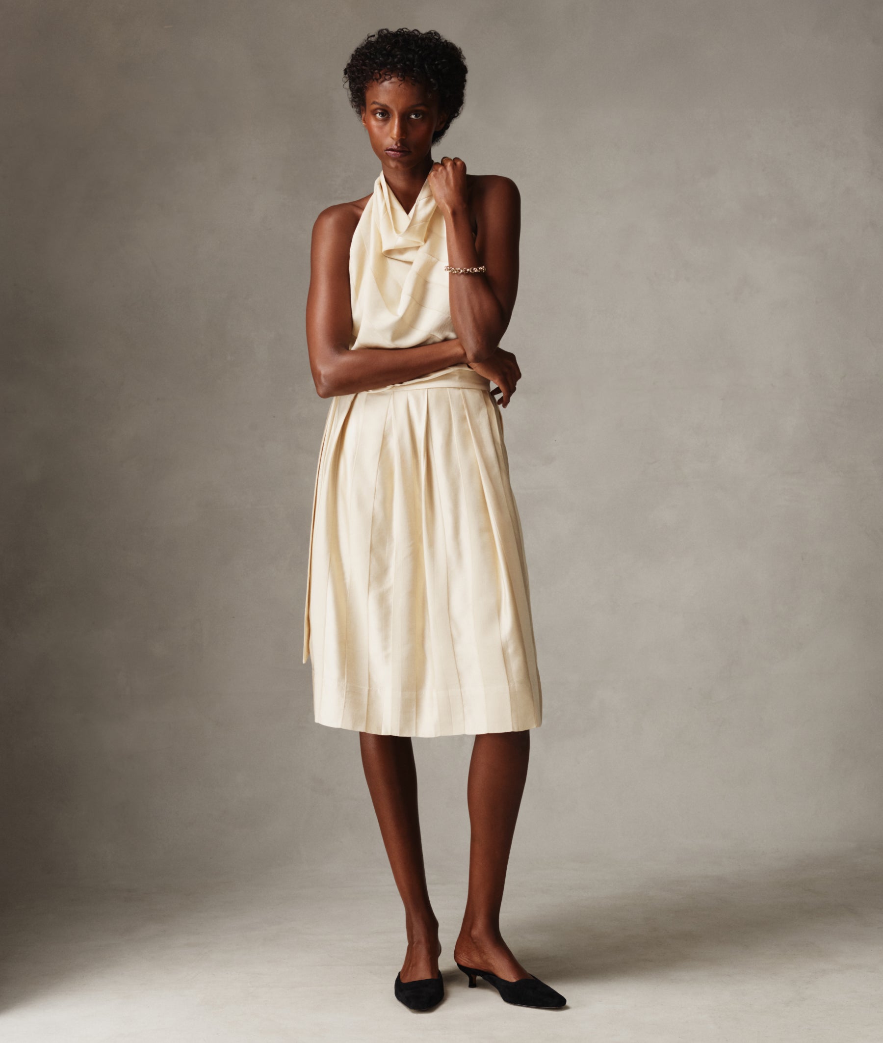 Mix and match the barre-striped Margherita backless cowl necked top with the counterposed stripe of the pleated June skirt. A buoyant and free spirited look with dress up and down appeal. Do the same with our house chain mail print pure silk variant of the same top and bottom for a moodier evening look.