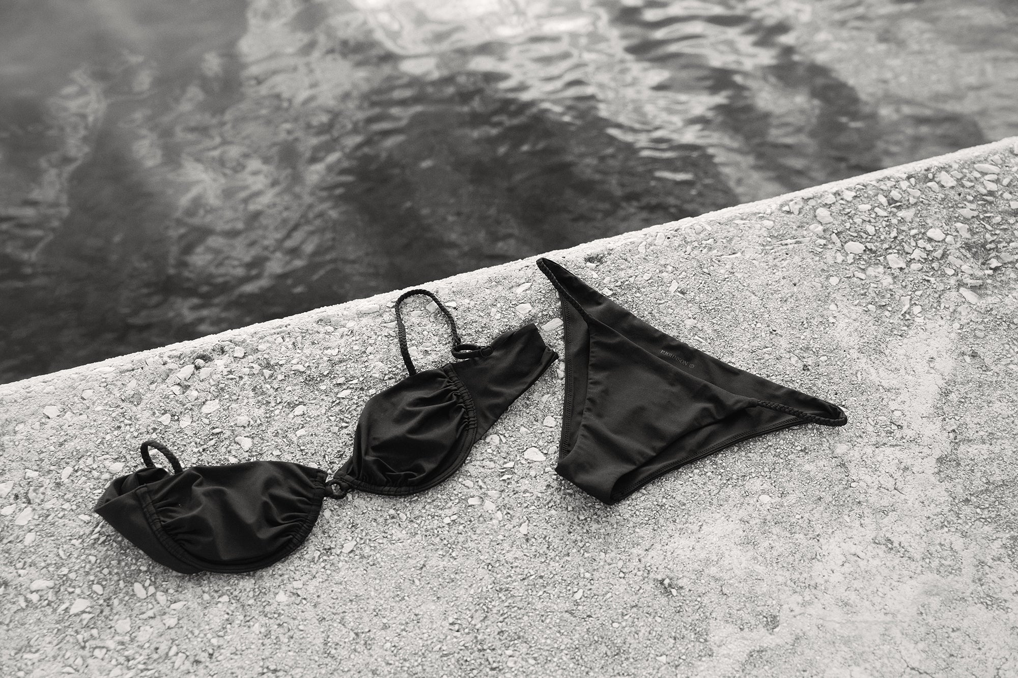 Enter the bikinis - We have the Tamsin in black which has a bustier-type underwire top, delicately braided straps, braided centre ring and a full-cover brief. The Emily has a triangle top with side tie full-cover briefs that both feature custom silver hardware details and tie ends. Emily comes in black, white and oyster.