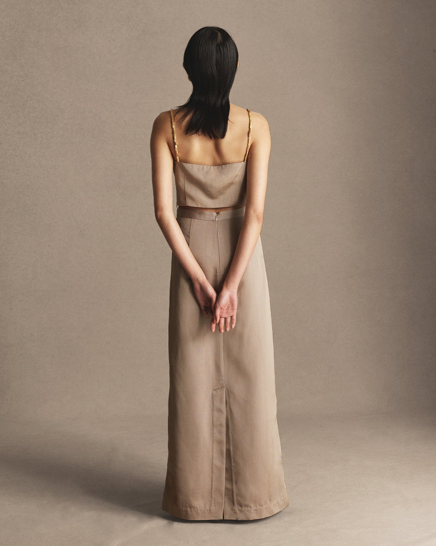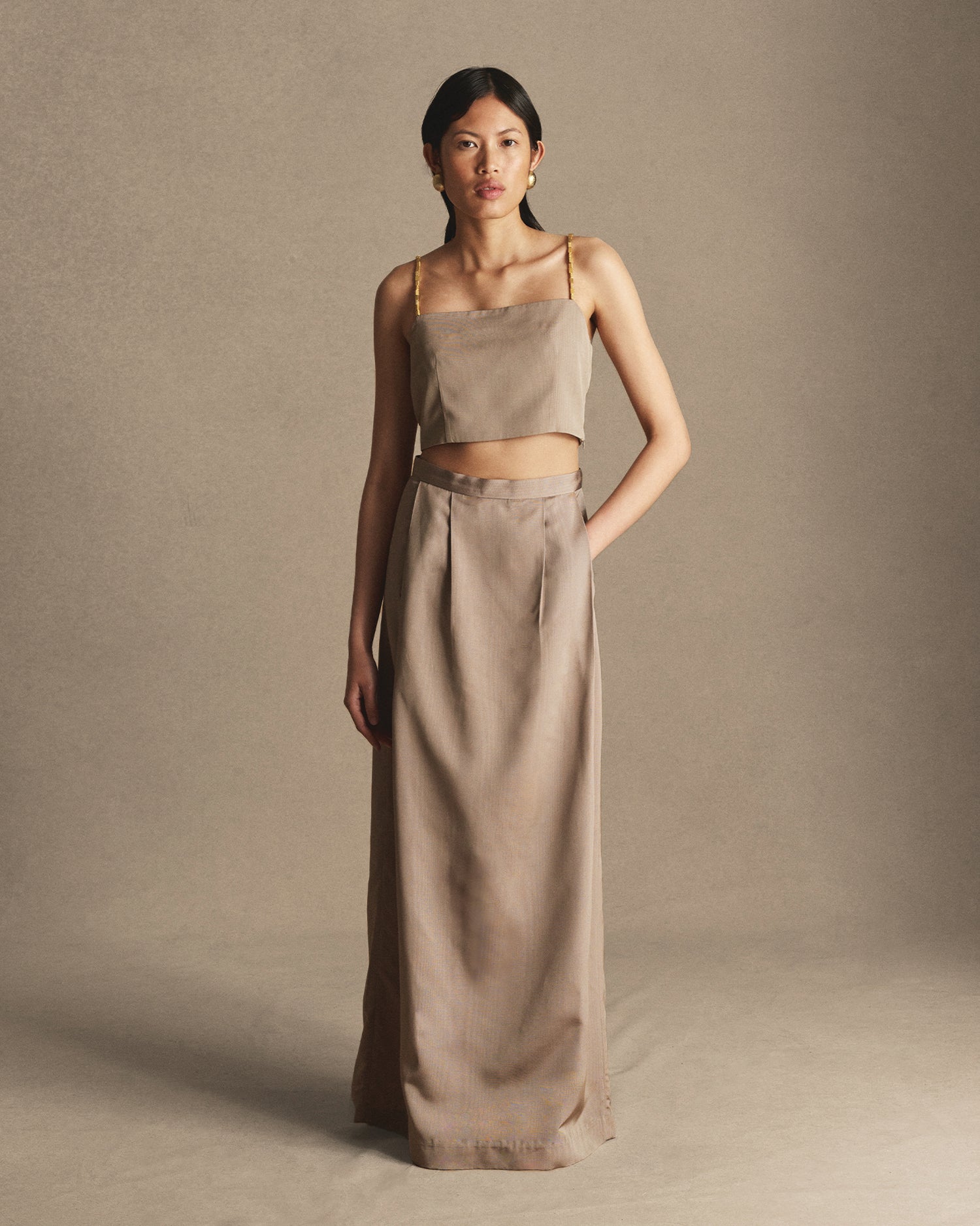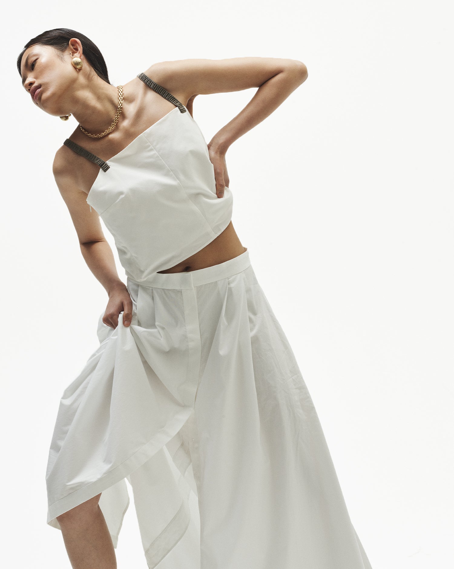 The Rose wrap skirt offers a powerful midi while the Evalin series including a vest and short are at once tough and feminine. The beaded strap Helena range, confident and striking, is back with a newly designed 23 karat gold plated straps.