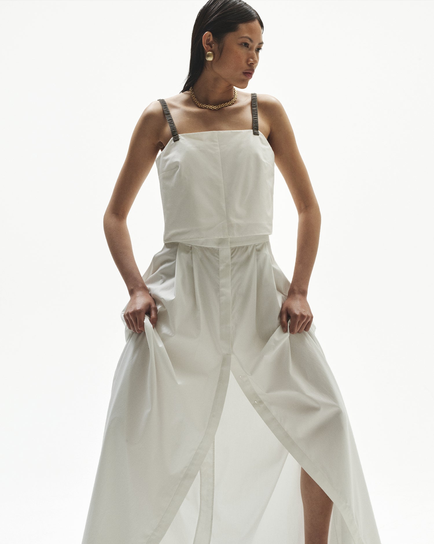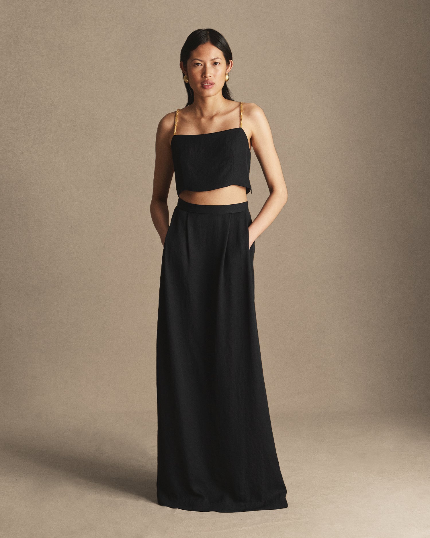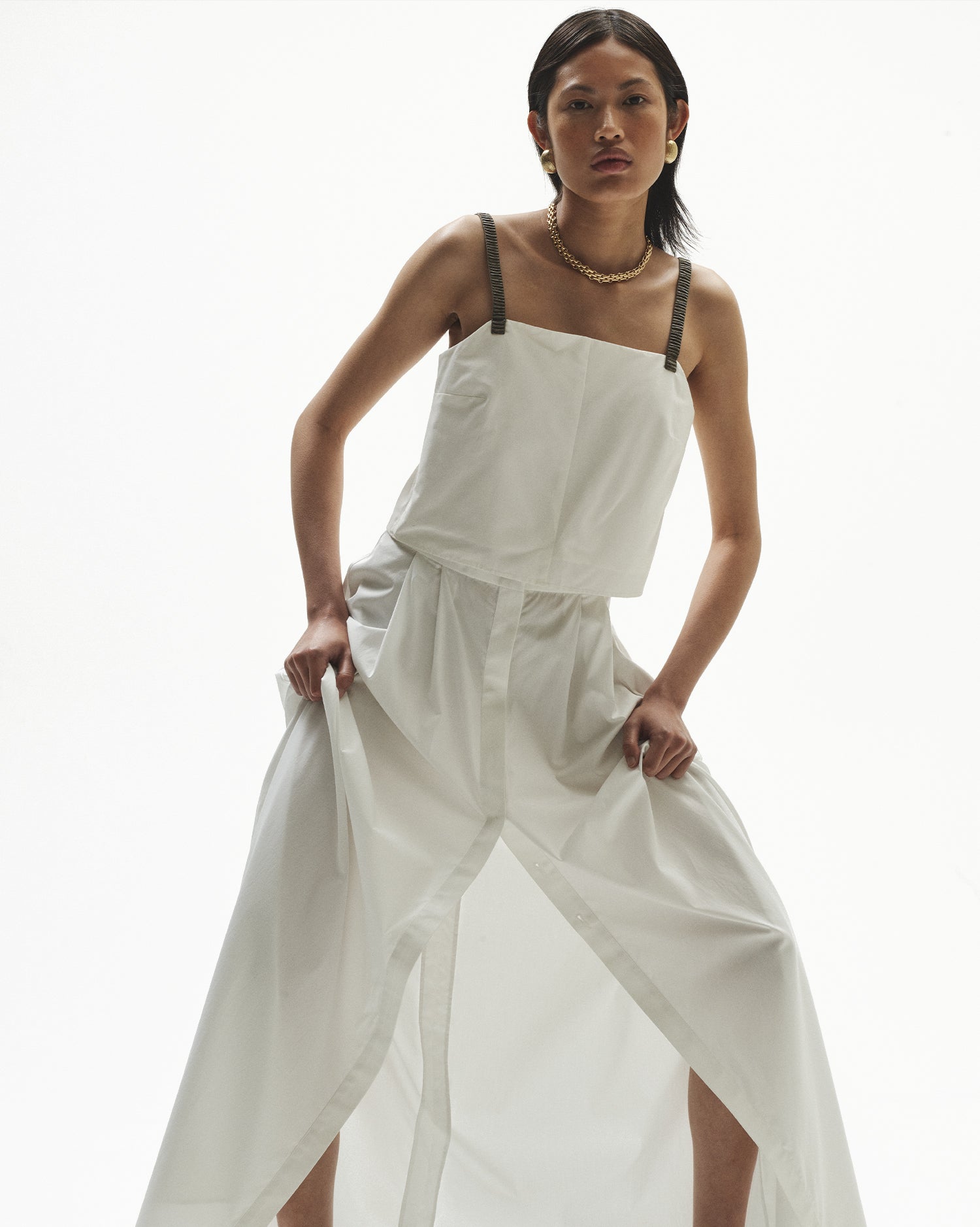 The Rose wrap skirt offers a powerful midi while the Evalin series including a vest and short are at once tough and feminine. The beaded strap Helena range, confident and striking, is back with a newly designed 23 karat gold plated straps.